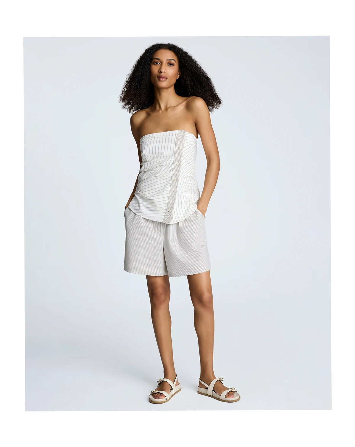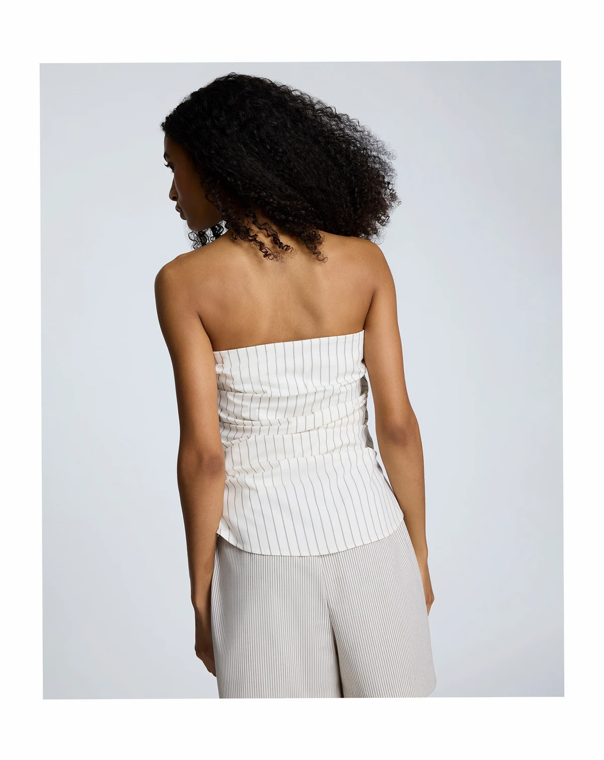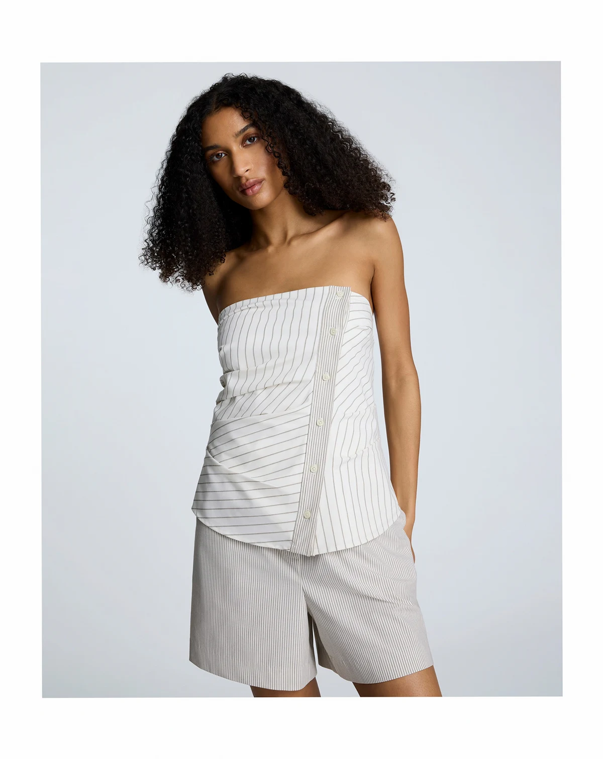 Step into elegant sophistication with this women's strapless top from Kenneth Cole, featuring chic faux button trims at the front and flattering pleated details at the side for a polished and stylish look.