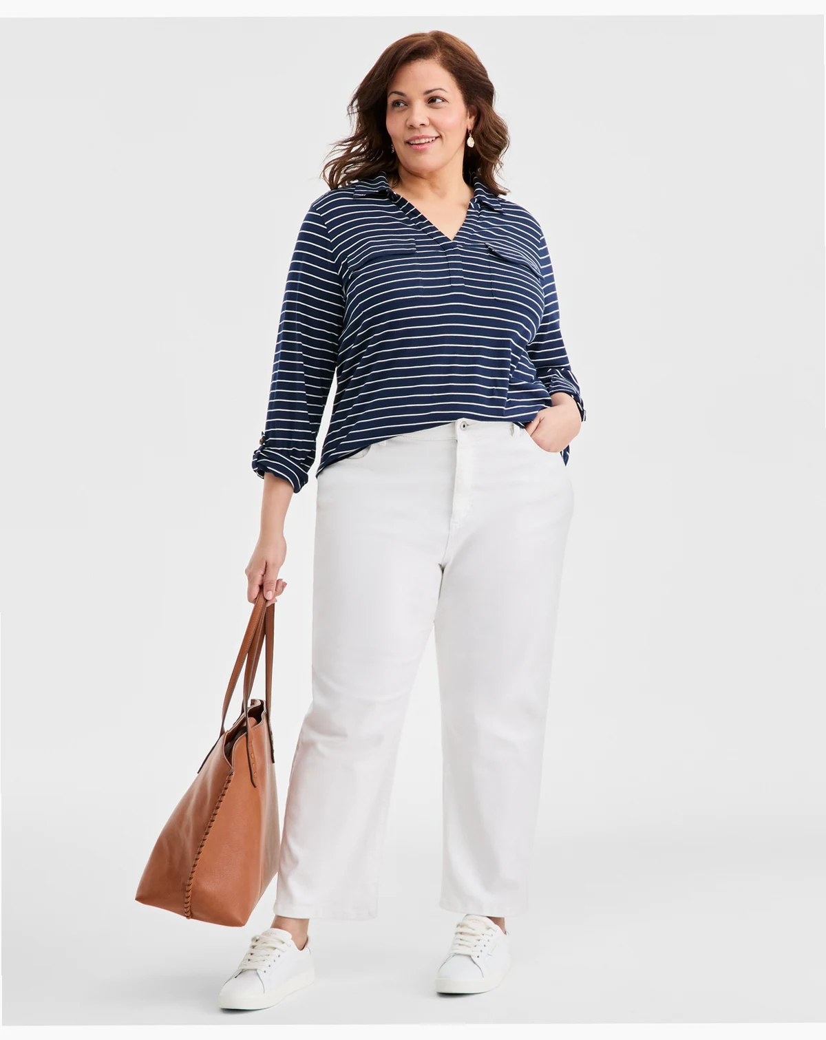 Soft knit style is fashioned with flap pockets on this Style & Co plus size knit top featuring sleeves that can be rolled up to 3/4-length or buttoned down to the wrists.