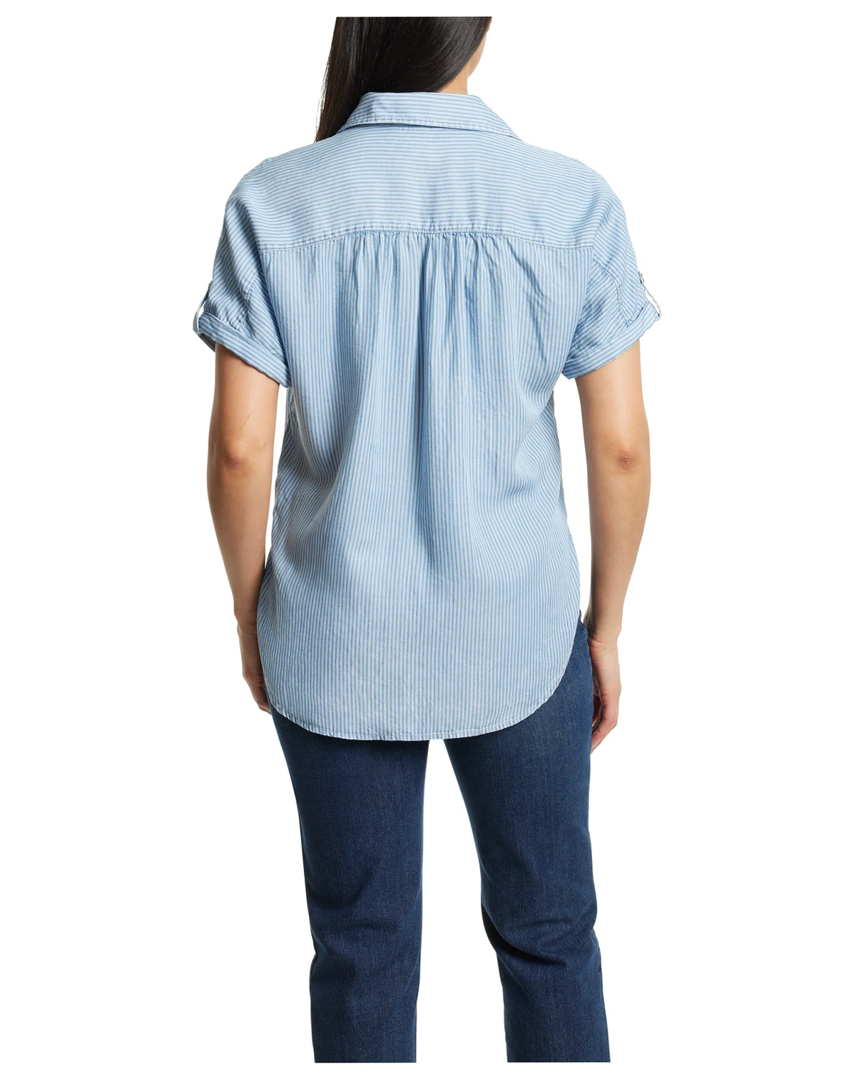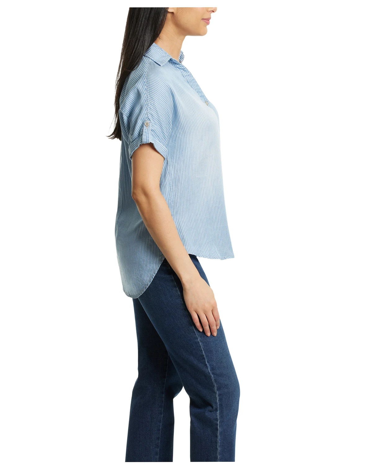 Effortless and polished, this Gloria Vanderbilt shirt features a front button closure and a classic point collar for timeless appeal. Short roll-tab sleeves and a high-low hem add subtle style details, making it a versatile piece for multiple occasions.