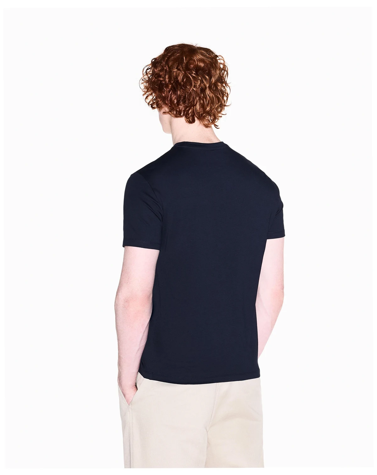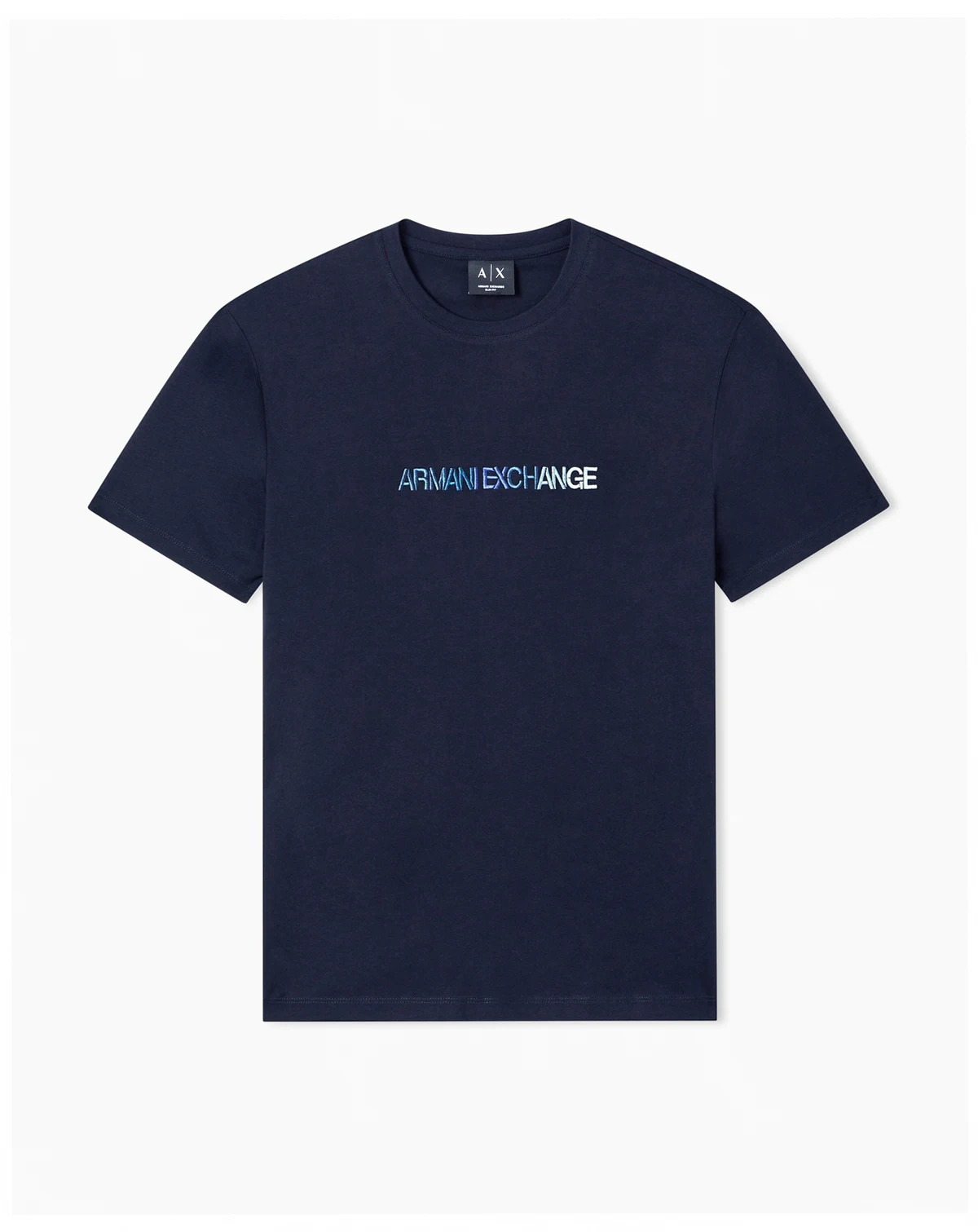 This T-shirt features a subtle blue Armani Exchange logo on the front, with a classic crew neck and soft cotton fabric. A clean, versatile staple for everyday wear.