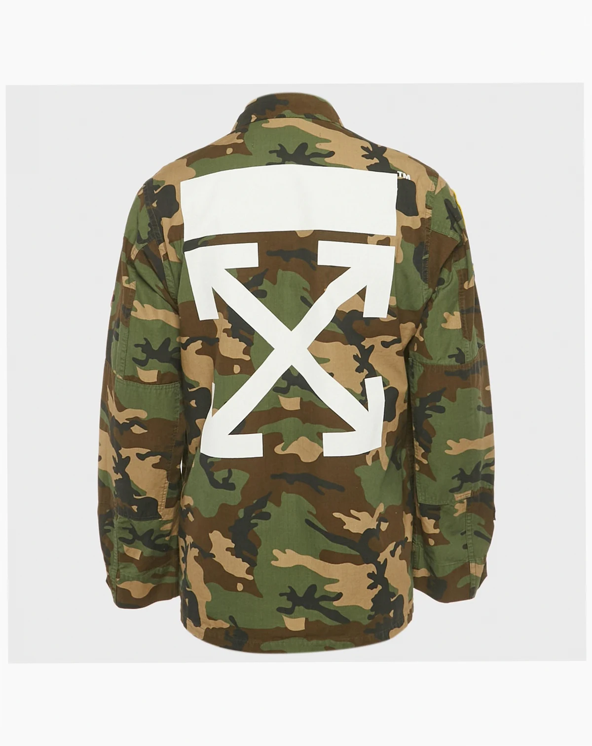 Off White s utility jacket is styled in green camouflage print with patch detailing. Relaxed yet bold it reflects maison streetwear codes with modern flair. A versatile outerwear piece it captures contemporary urban style.