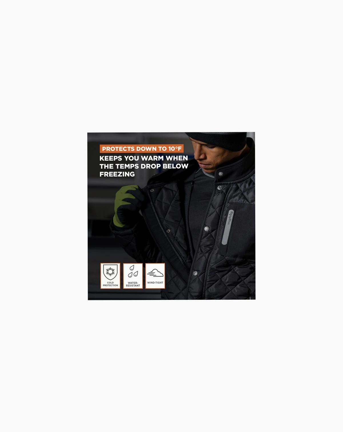 VERSATILE MEN S JACKET: This quilted jacket features 2 zippered hand-warmer side pockets and a large zippered chest pocket for easy access to small tools. It is perfect for long workdays and can also be worn on cold nights out with friends.; STAY WARM ON THE JOB: Our men s quilted coat features heavy-duty inset cuffs to help keep the elements out. With a durable build and a thick diamond-quilted pattern, it has the toughness to withstand rough work conditions while also looking good.