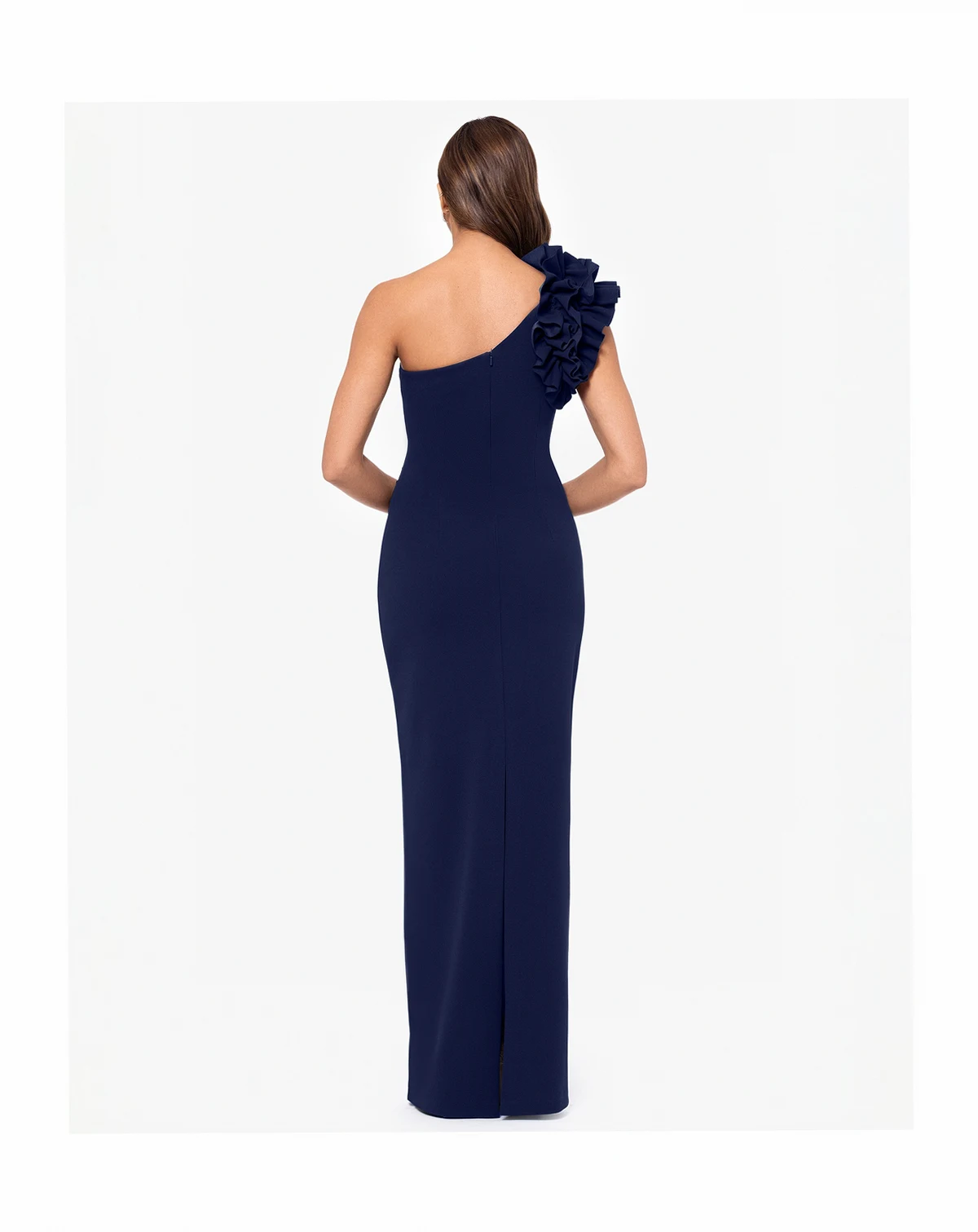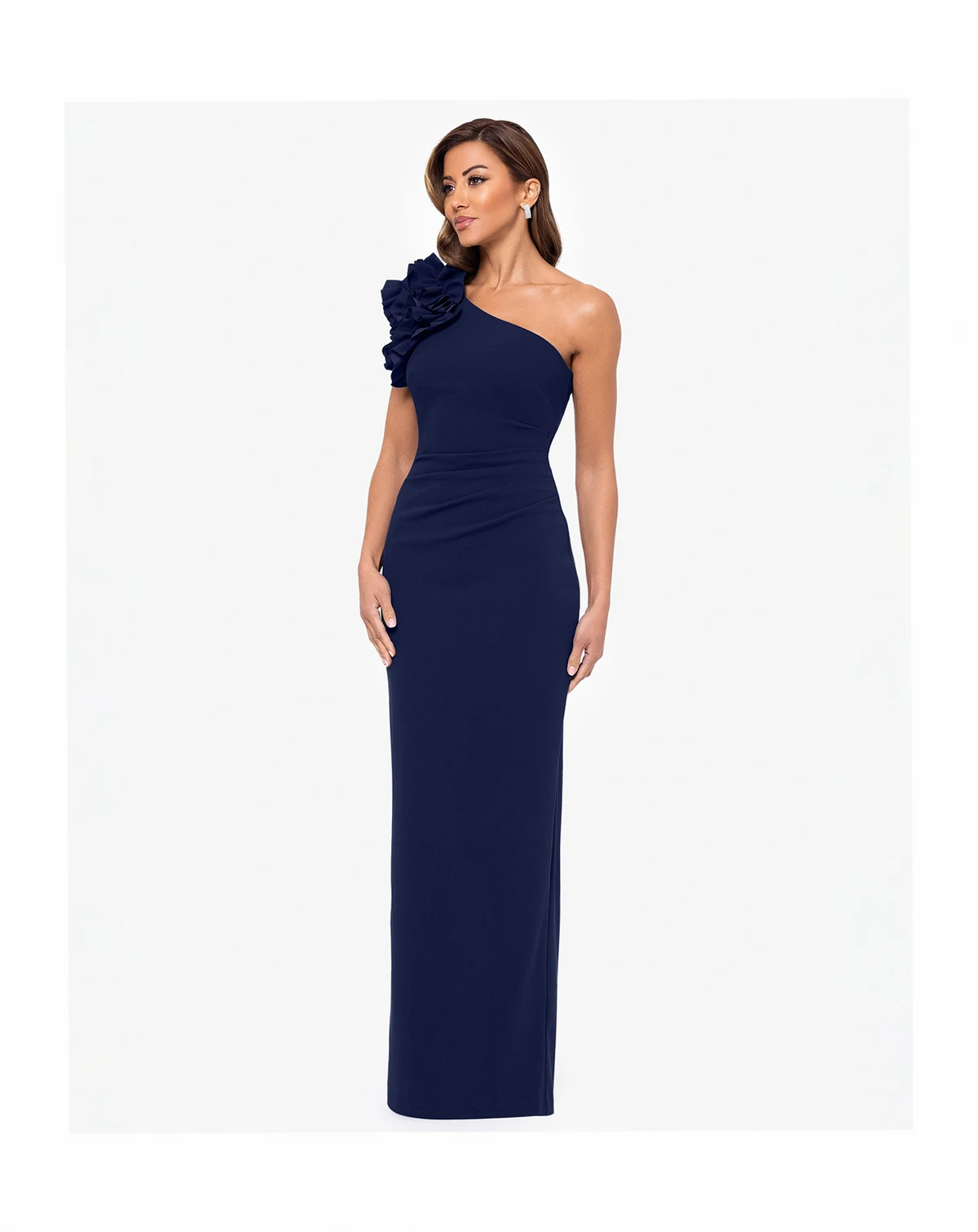 A one-shoulder neckline and ruffled detail accentuate this gown from XSCAPE. The scuba crepe fabrication offers structure and flow, and the elegant silhouette is suitable for formal wedding guest attire.