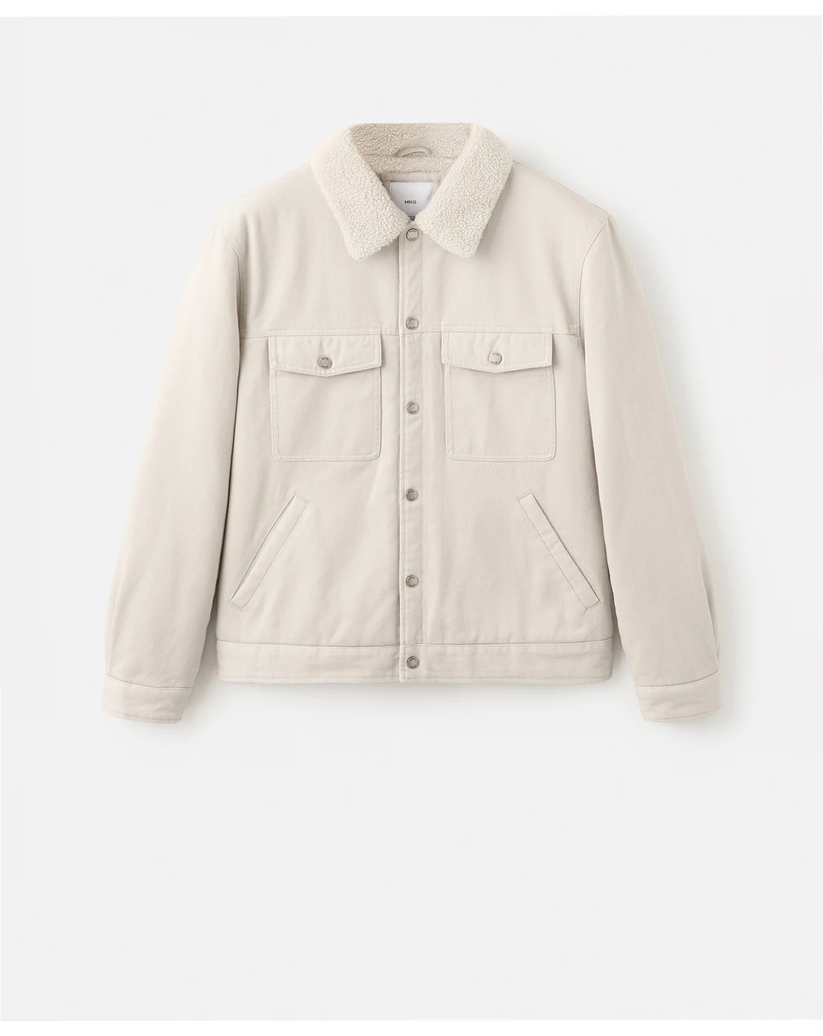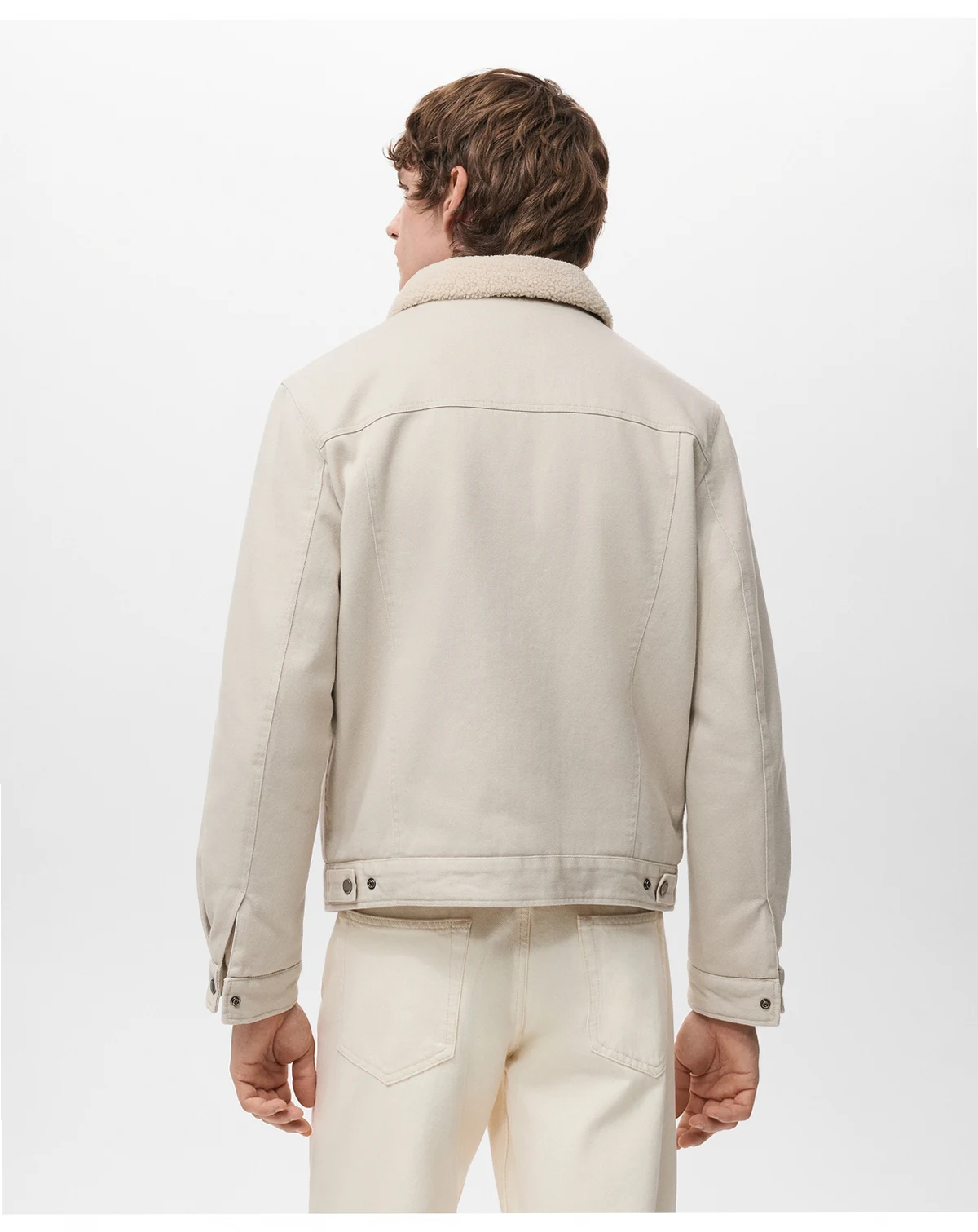 Balance warmth and utility with the Denim Jacket with Fleece Lining from Mango. Made from cotton denim fabric, the jacket features straight silhouette, faux shearling collar and interior, front flap pockets, side pockets, padded long sleeves and buttoned cuffs.