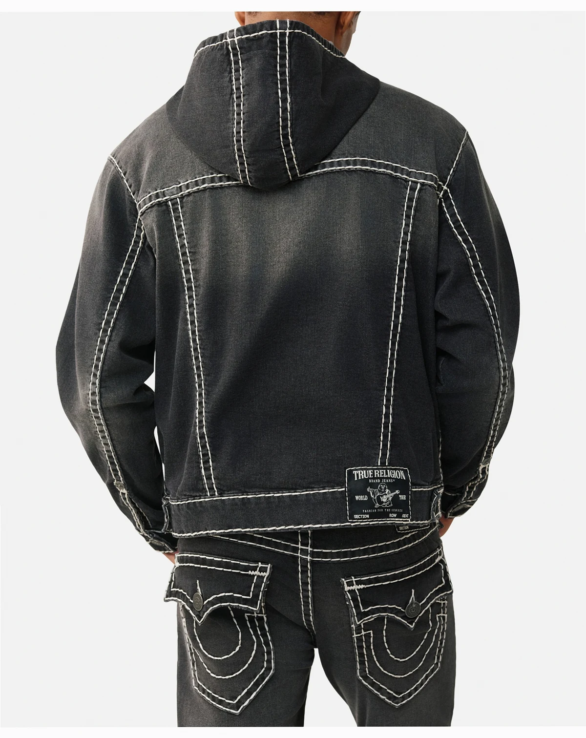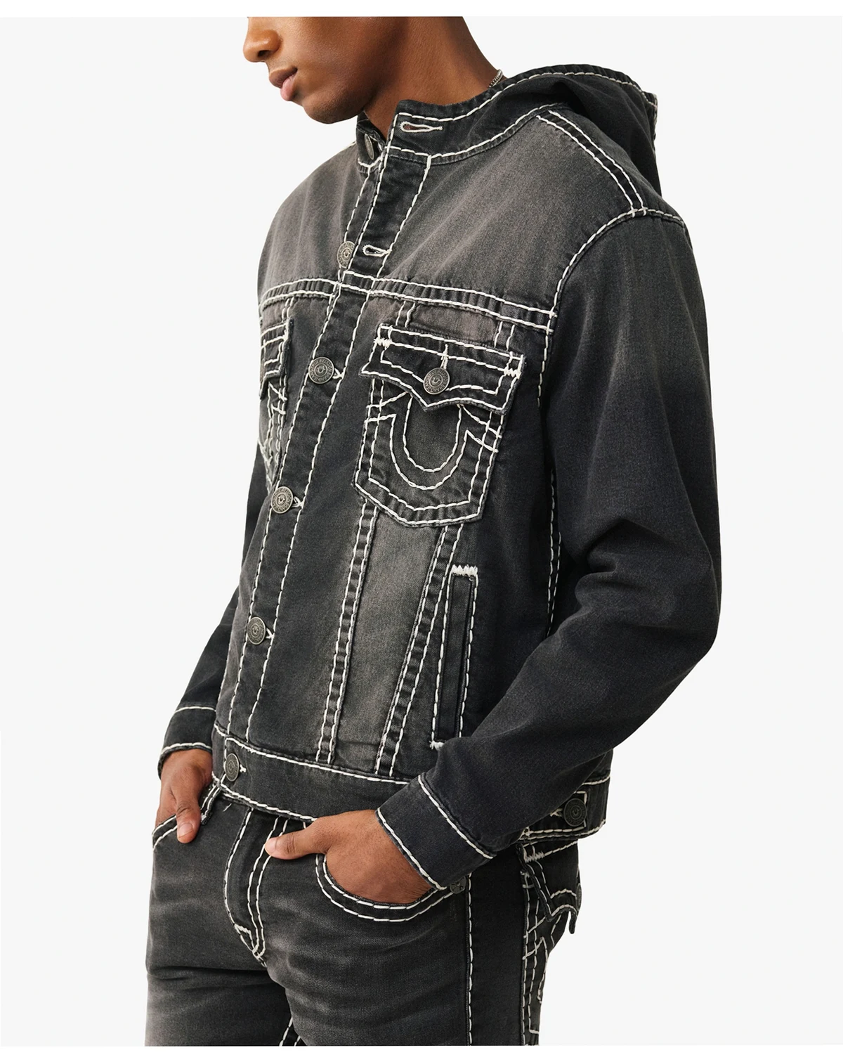 Refine your style with this True Religion jacket, featuring striking Super T stitching and a sleek hooded design for a modern, elevated look. The slanted front pockets and long sleeves add both practicality and sophistication, while the signature horseshoe detailing on the chest flap enhances its luxe appeal.