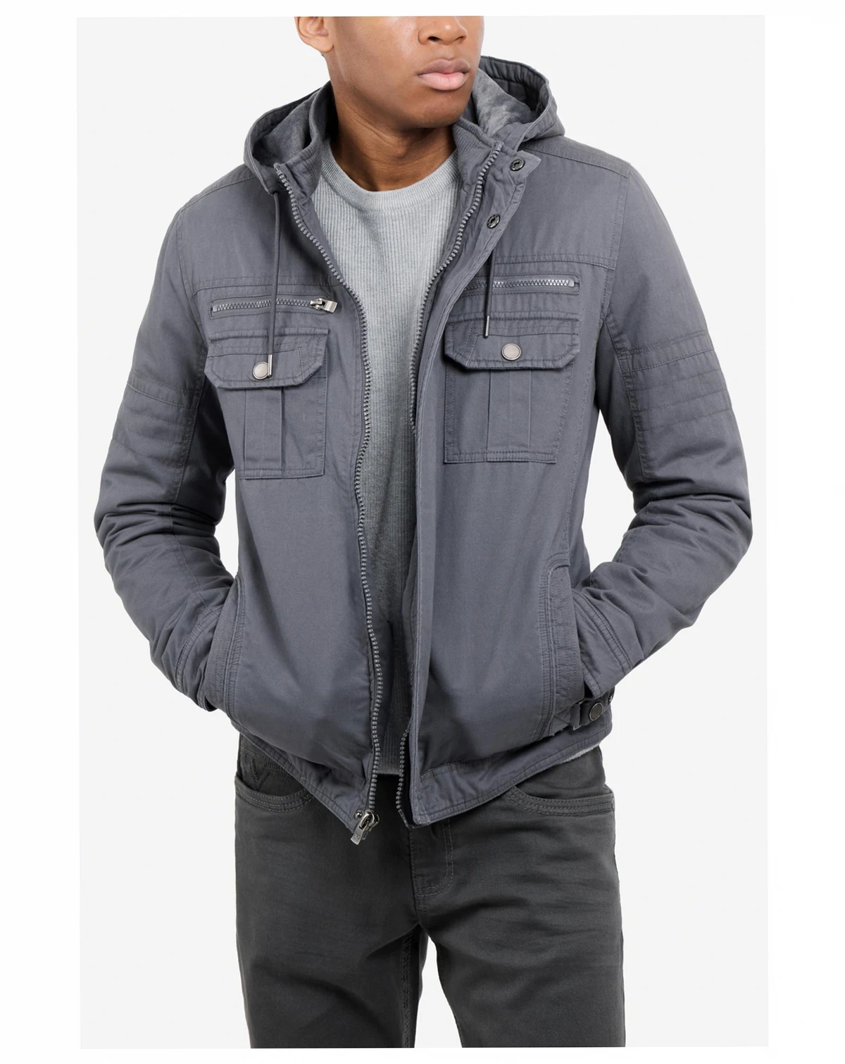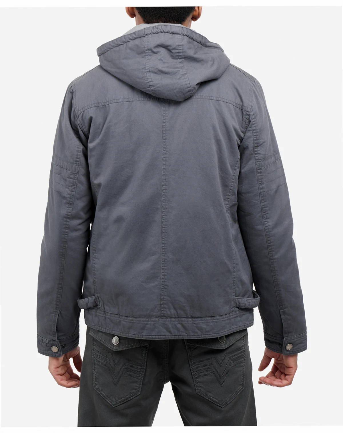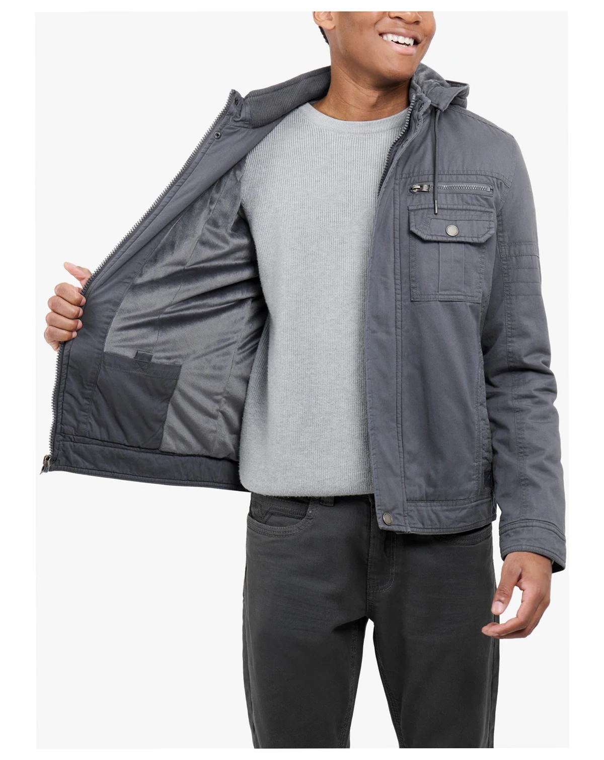 Stay cozy and stylish in the X RAY Men's Hooded Cargo Jacket. With a plush faux shearling lining, this jacket will keep you warm all winter long. Featuring chest and side pockets for convenience, and a full zip and button closure for a secure fit. Perfect for any outdoor adventure or casual outing. Upgrade your wardrobe with this must-have jacket.