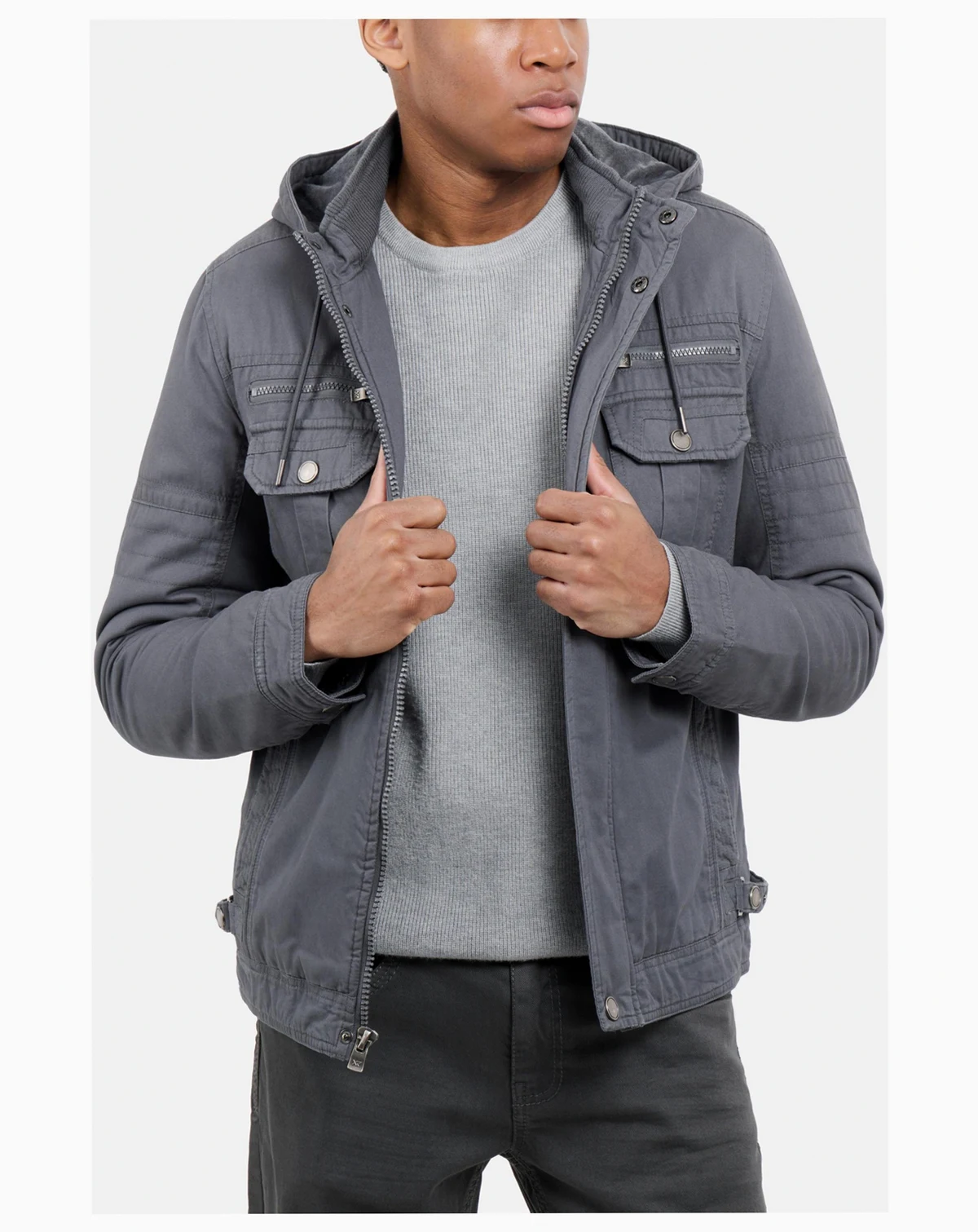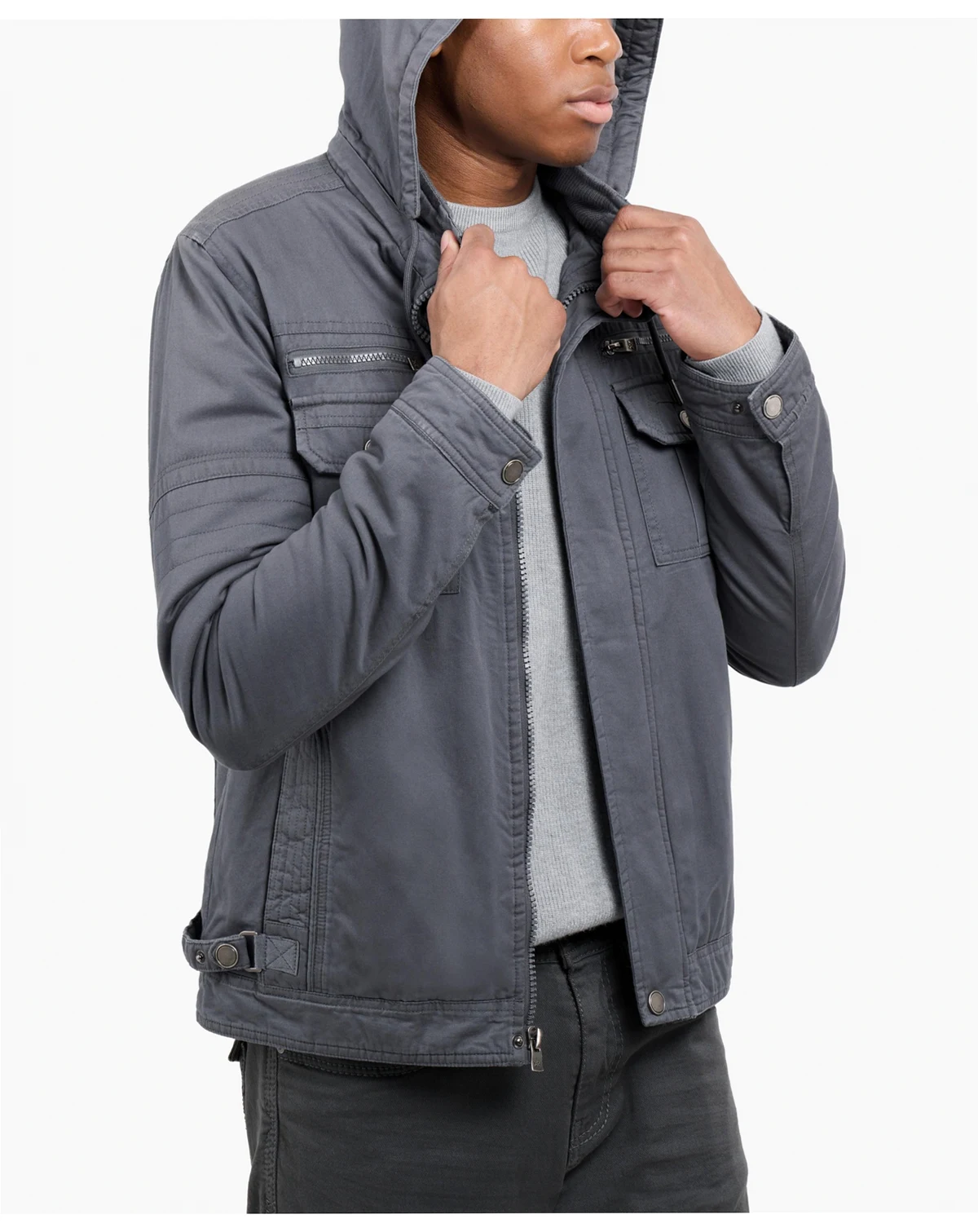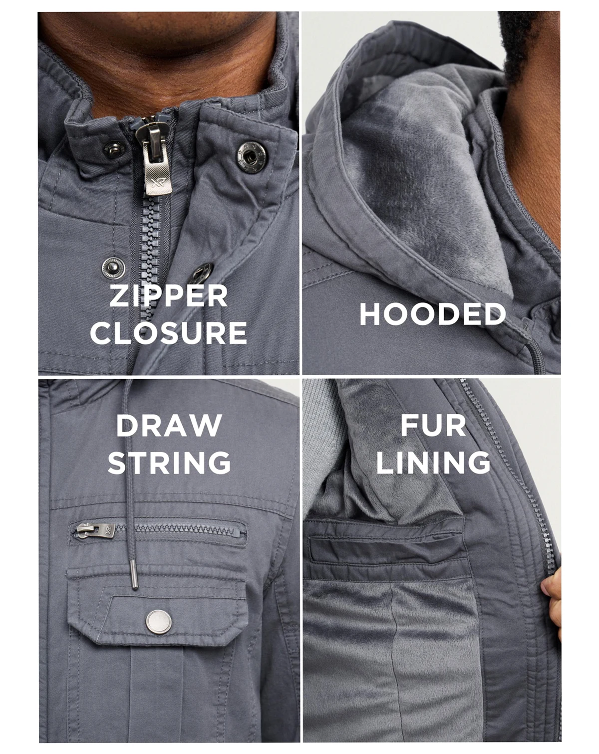 Stay cozy and stylish in the X RAY Men's Hooded Cargo Jacket. With a plush faux shearling lining, this jacket will keep you warm all winter long. Featuring chest and side pockets for convenience, and a full zip and button closure for a secure fit. Perfect for any outdoor adventure or casual outing. Upgrade your wardrobe with this must-have jacket.