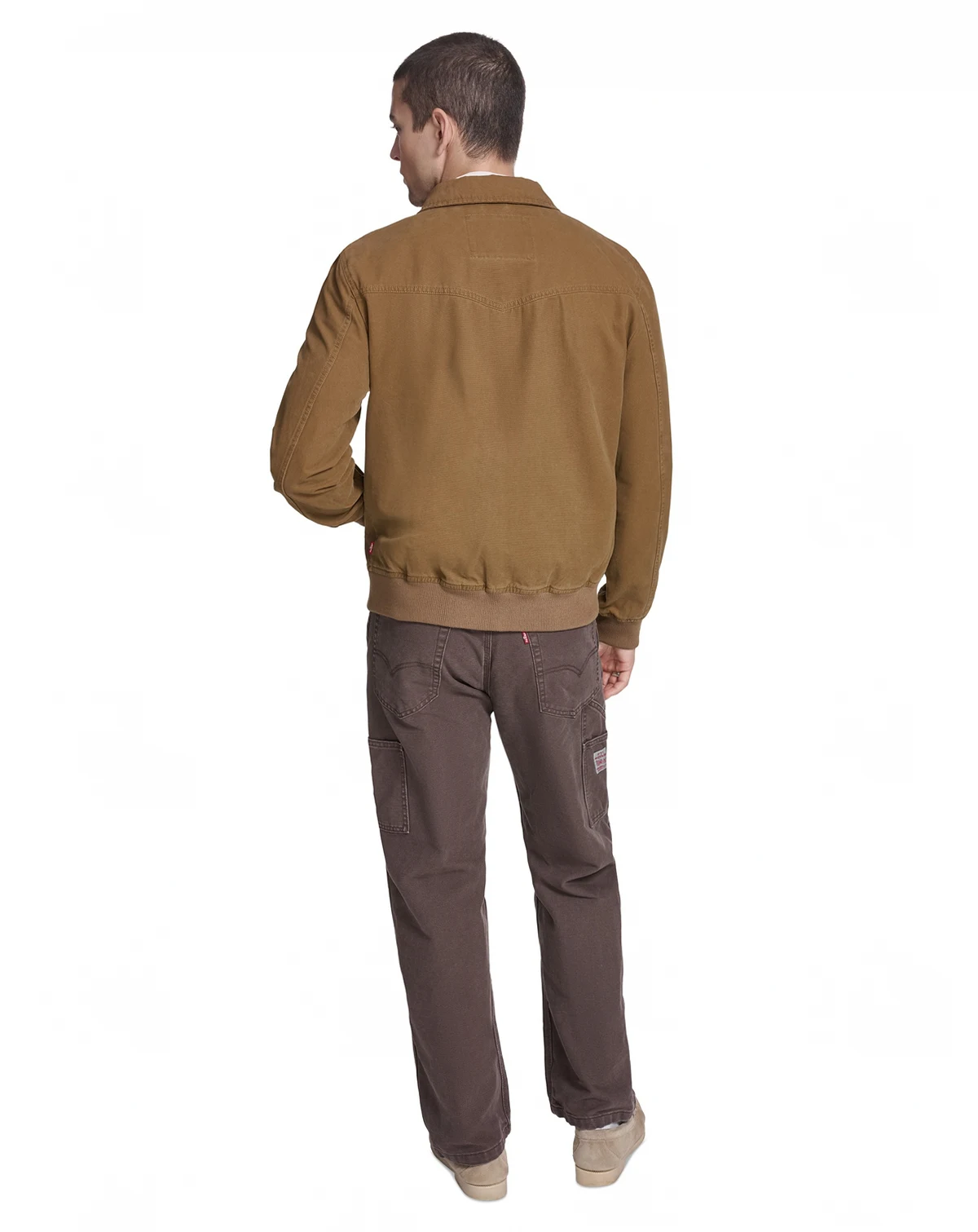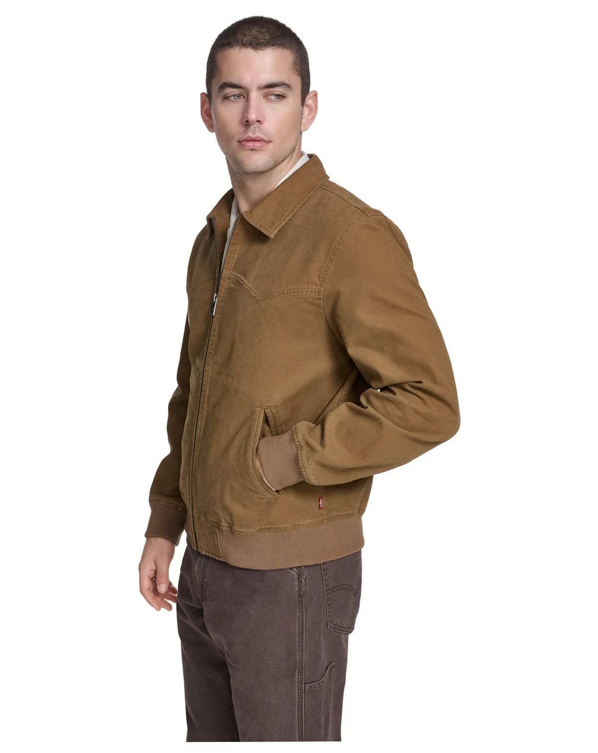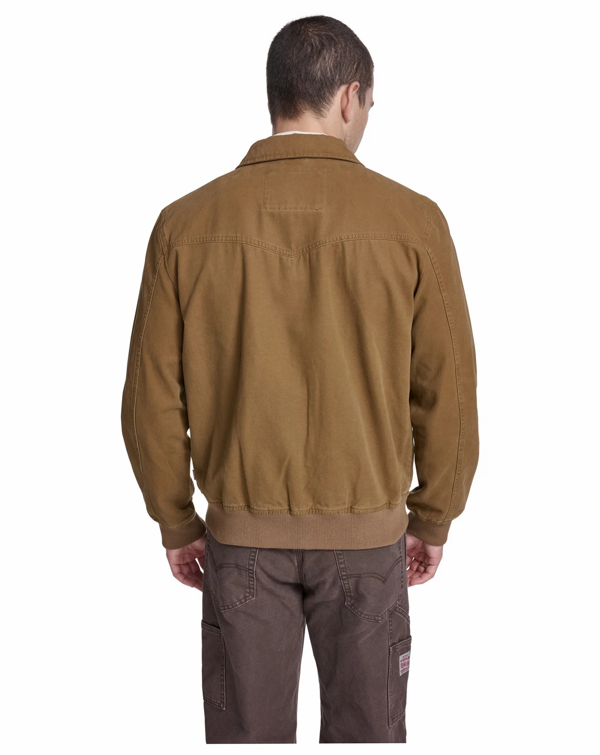 Levi's cotton western bomber with rib knit hem and cuffs, laydown collar, front zipper closure, western detail on upper chest, two lower pockets, red Levi's tab on lower side hem.