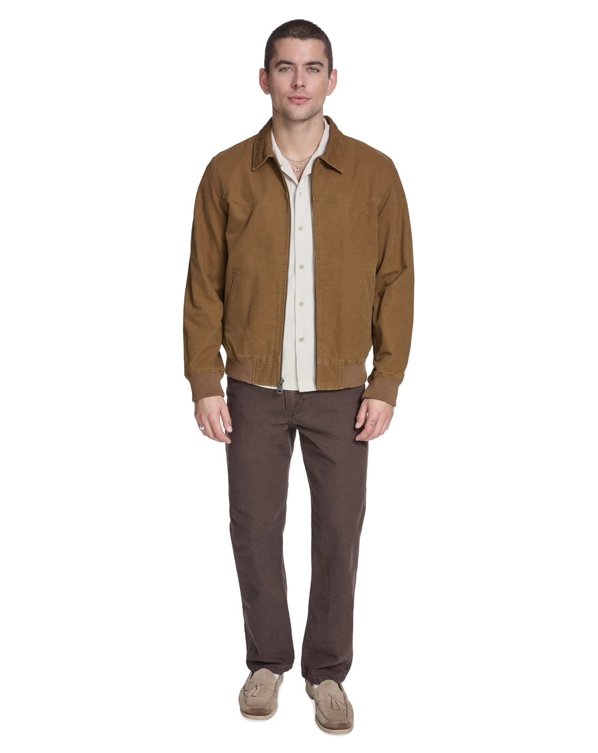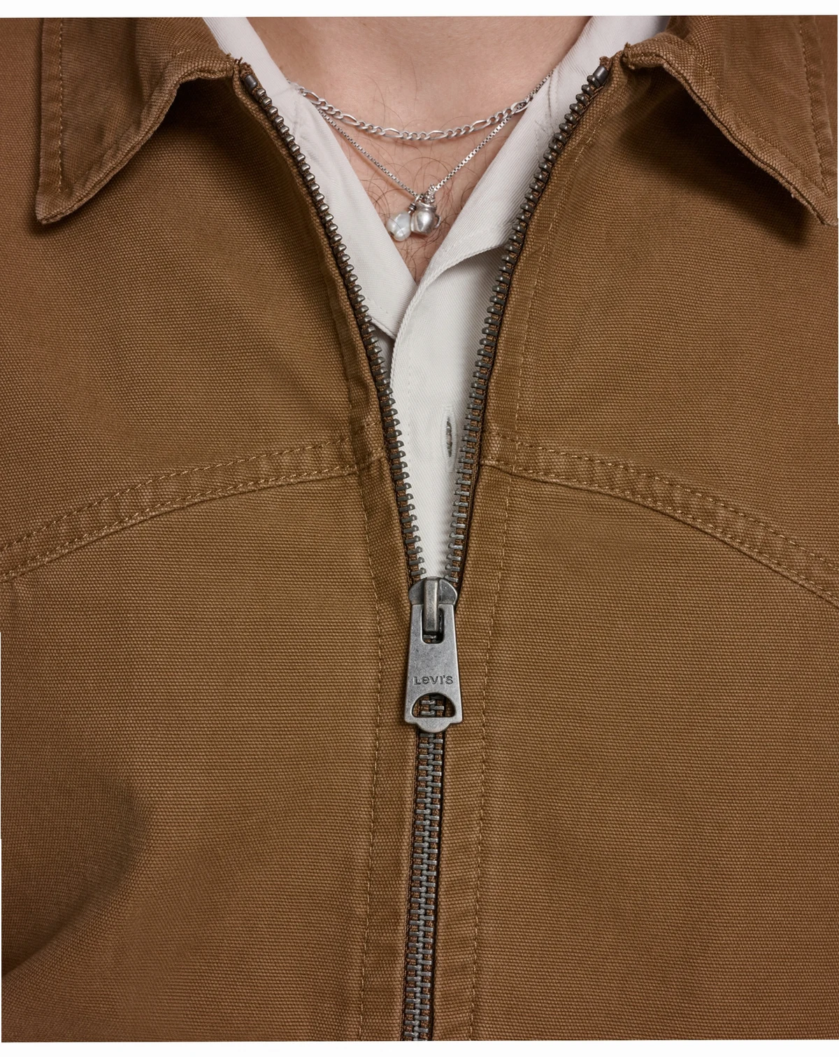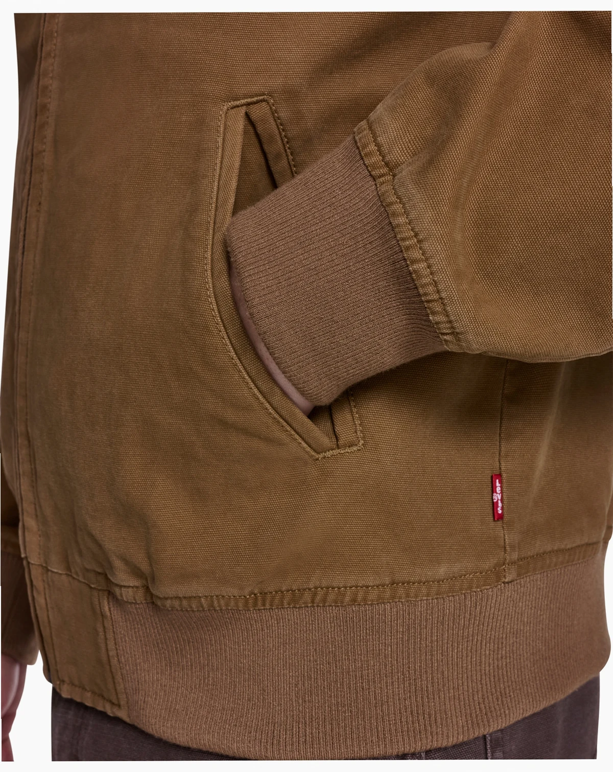 Levi's cotton western bomber with rib knit hem and cuffs, laydown collar, front zipper closure, western detail on upper chest, two lower pockets, red Levi's tab on lower side hem.