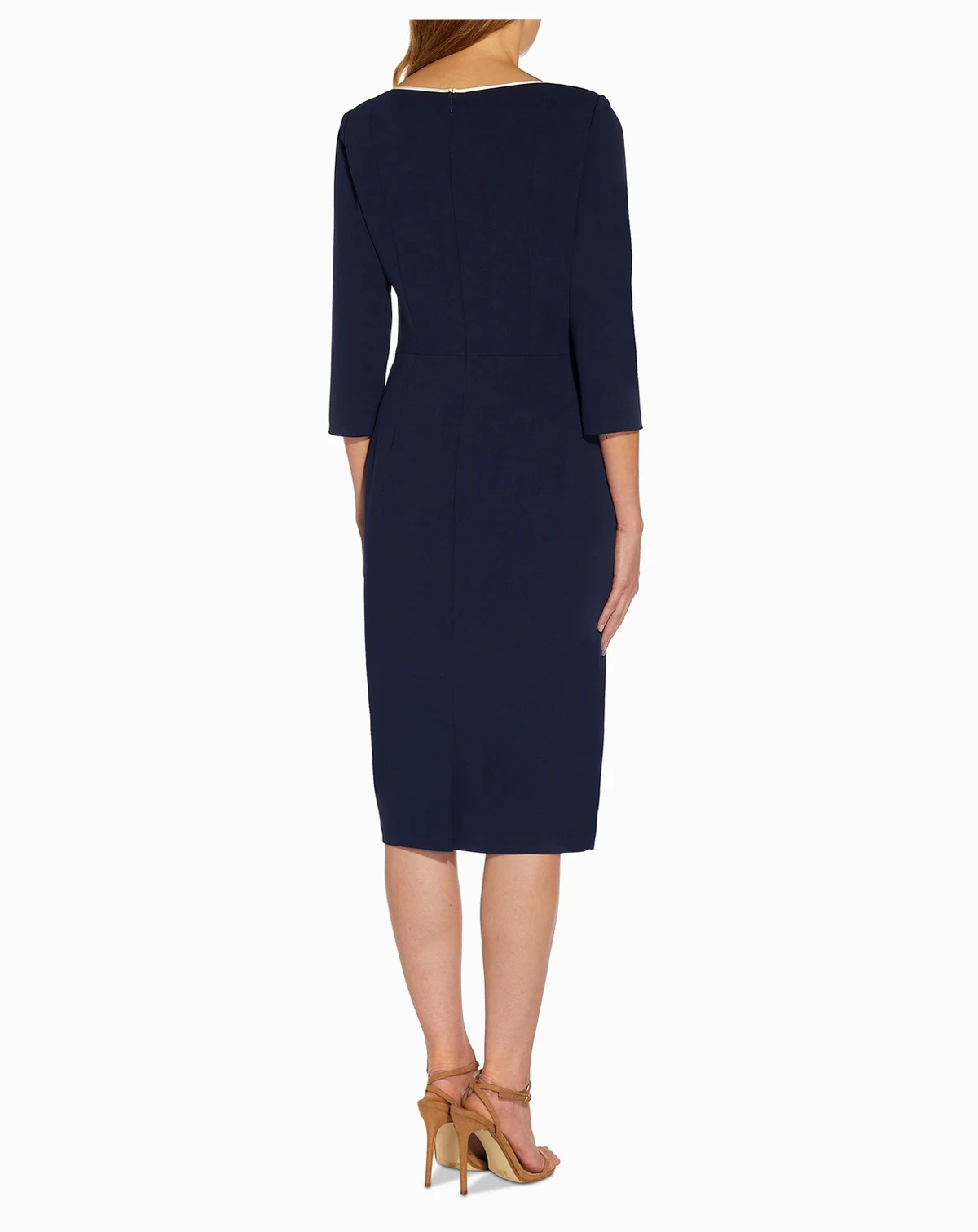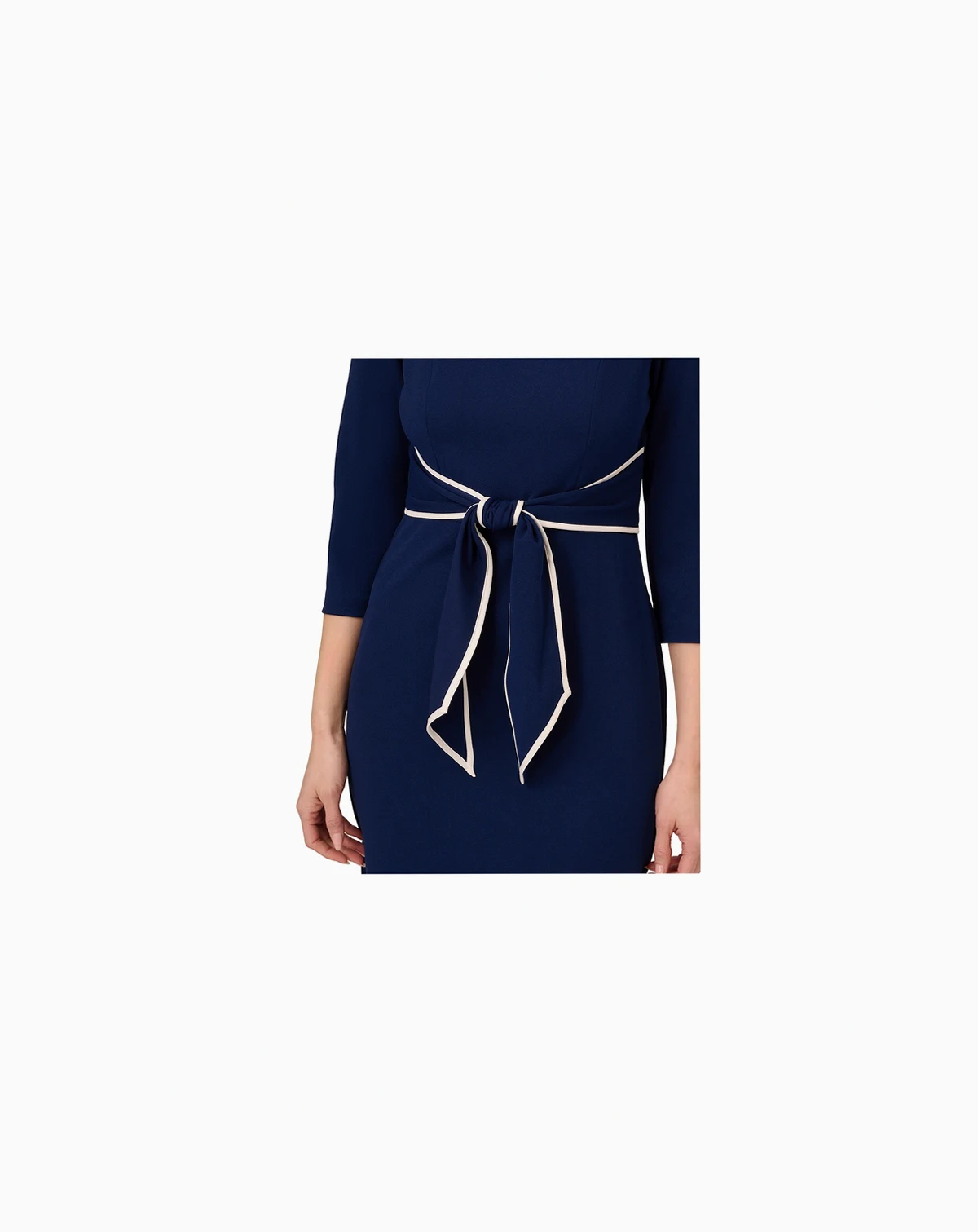 Stylish contrast tipping accents the neckline and tie front of Adrianna Papell's knit crepe dress, designed in a chic midi length, with sleek 3/4-sleeves.