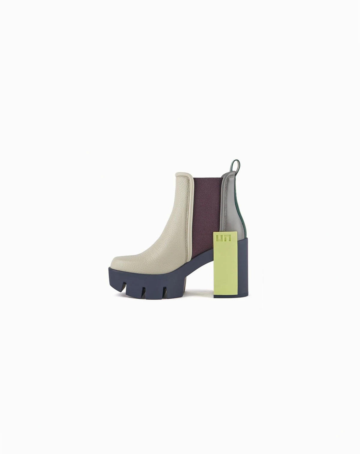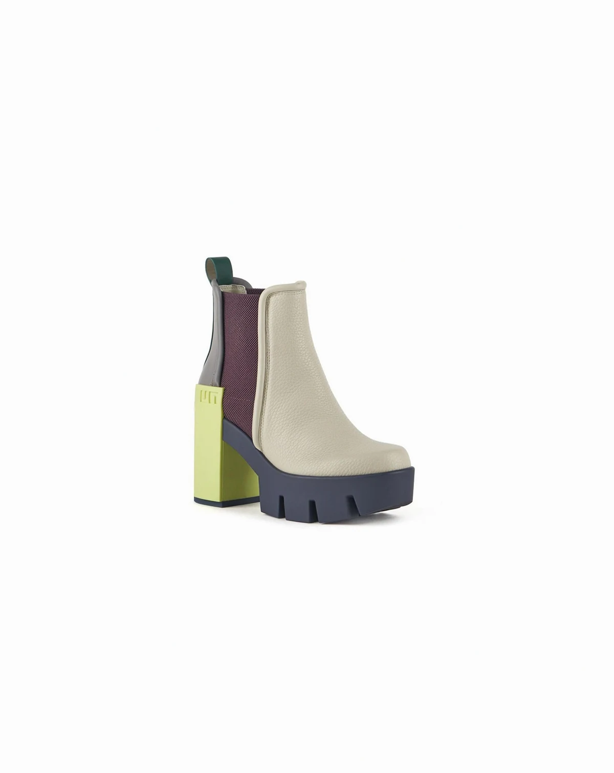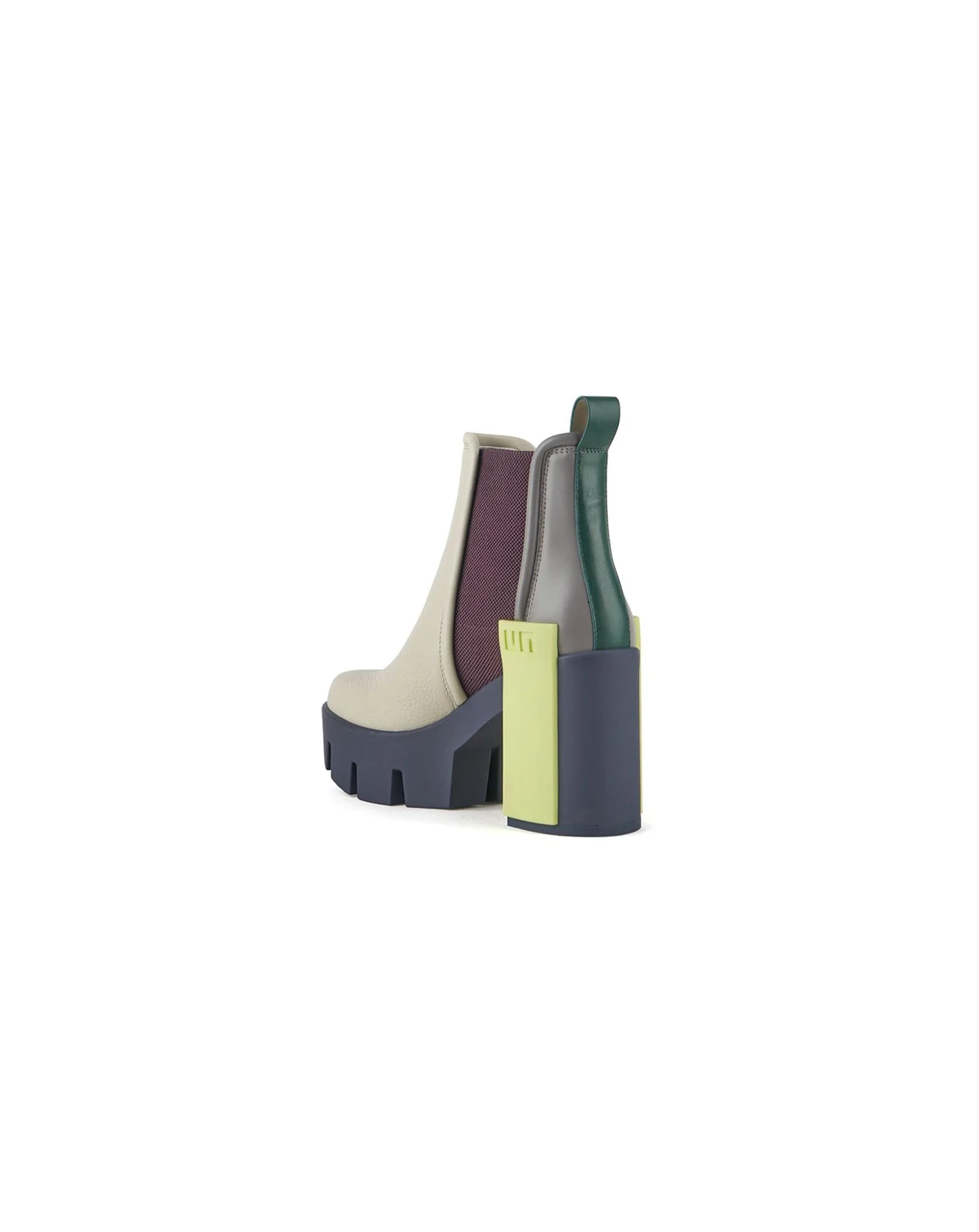 The Grip Chelsea III is a leather and elastic pull on boot with a platform lift, a statement logo block, and a defining lug sole. Piping at the seams give the design a playful finish and a touch of tubular volume.