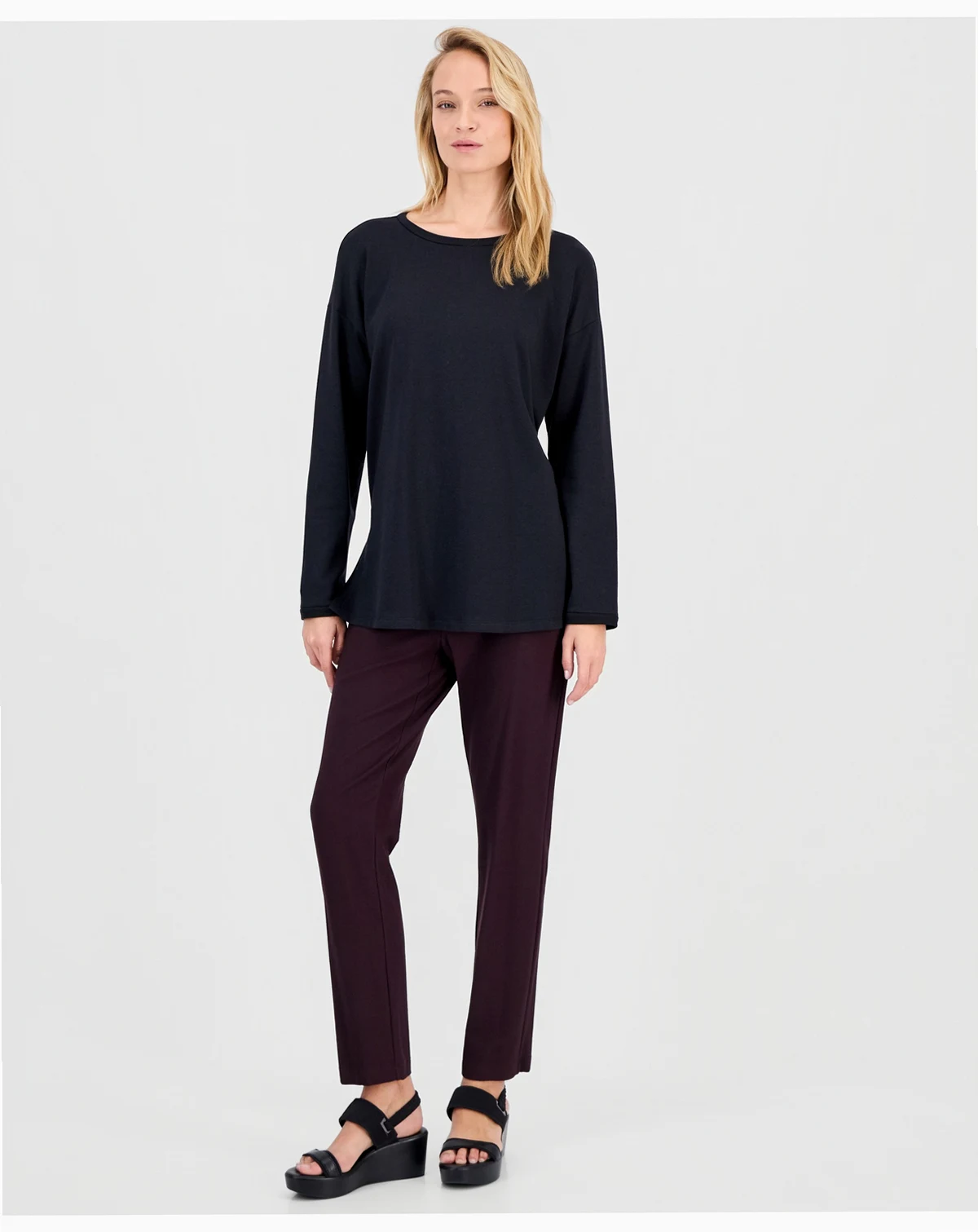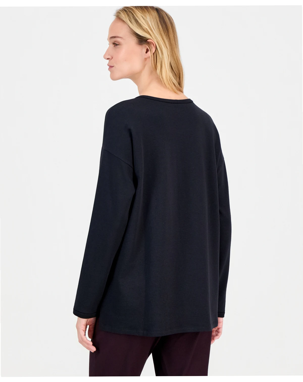 Smooth and soft with a brushed fleecy interior for a cozier feel, this round neck top by Eileen Fisher is a versatile wardrobe staple.