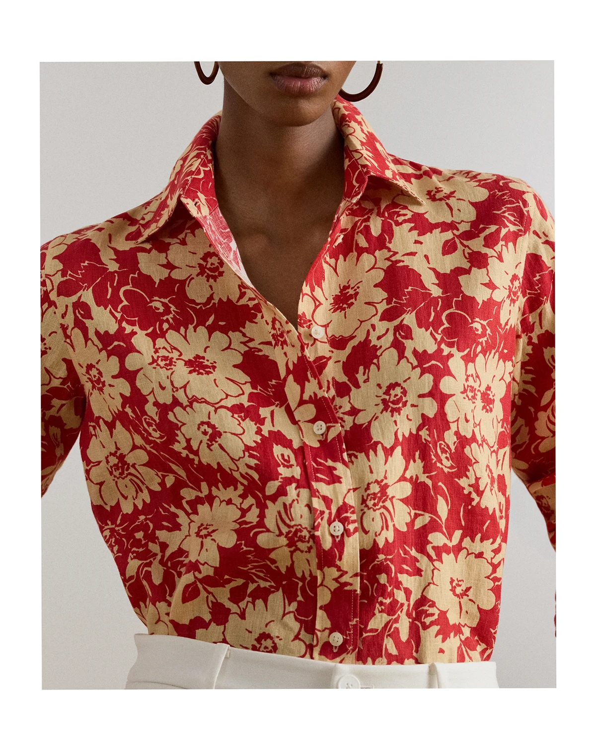 Designed with effortless versatility, this Lauren Ralph Lauren shirt features roll-tab sleeves that adapt styling with ease. Lightweight linen supports breathability while showcasing a bold floral print.