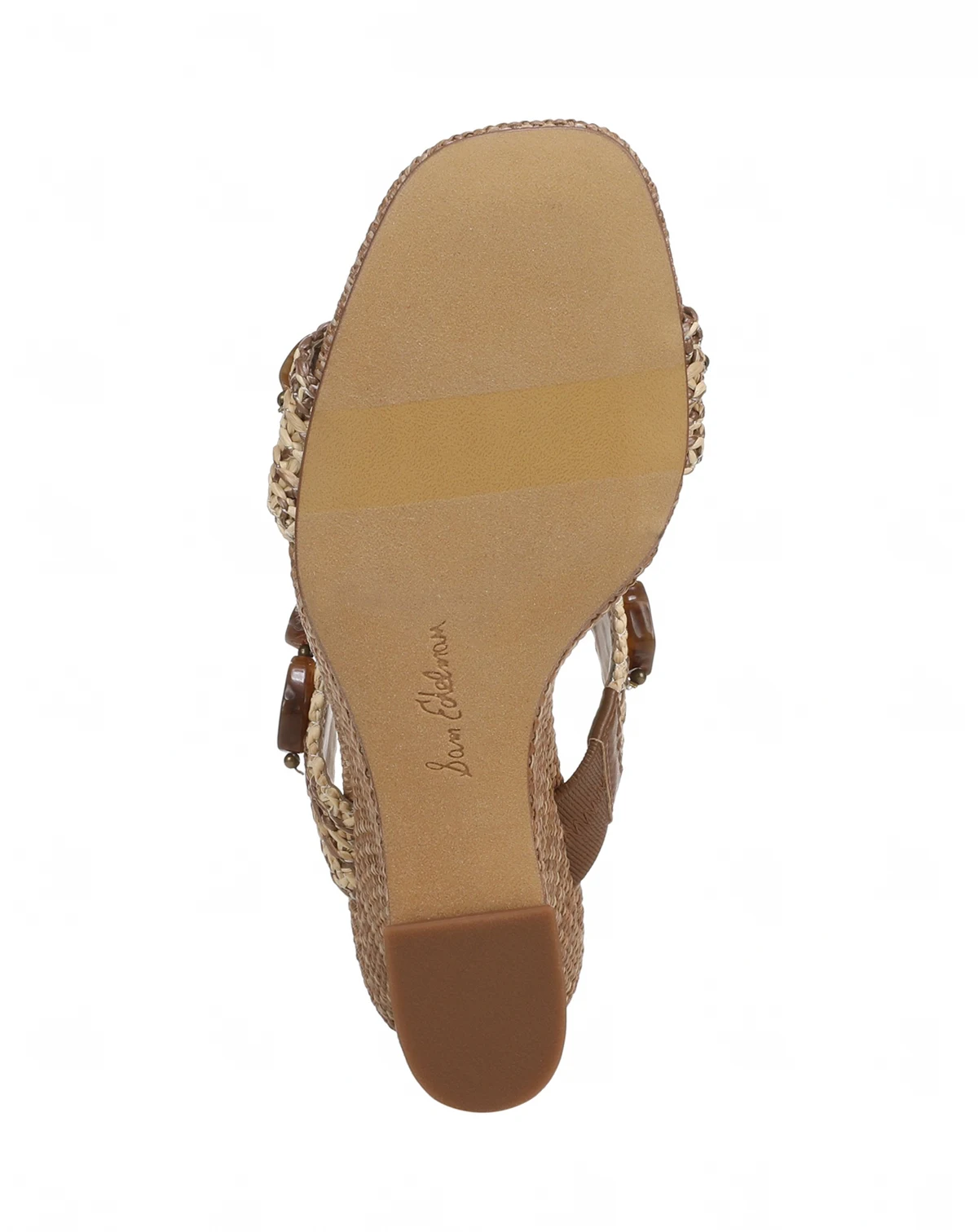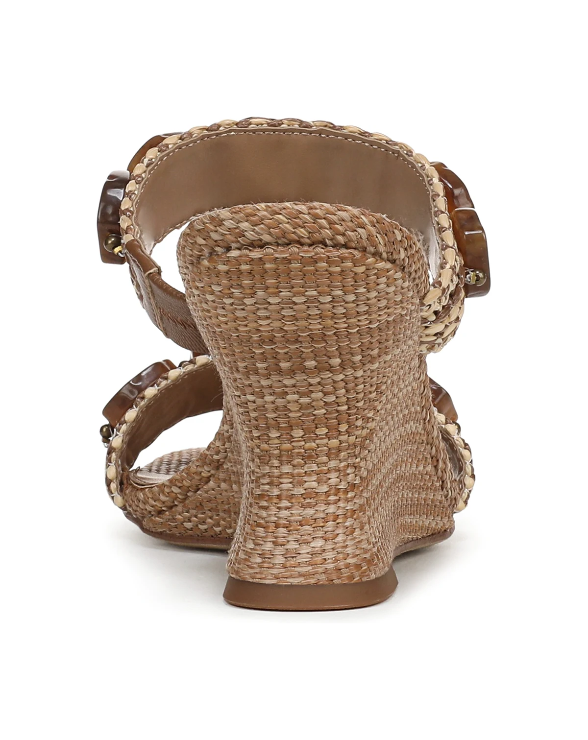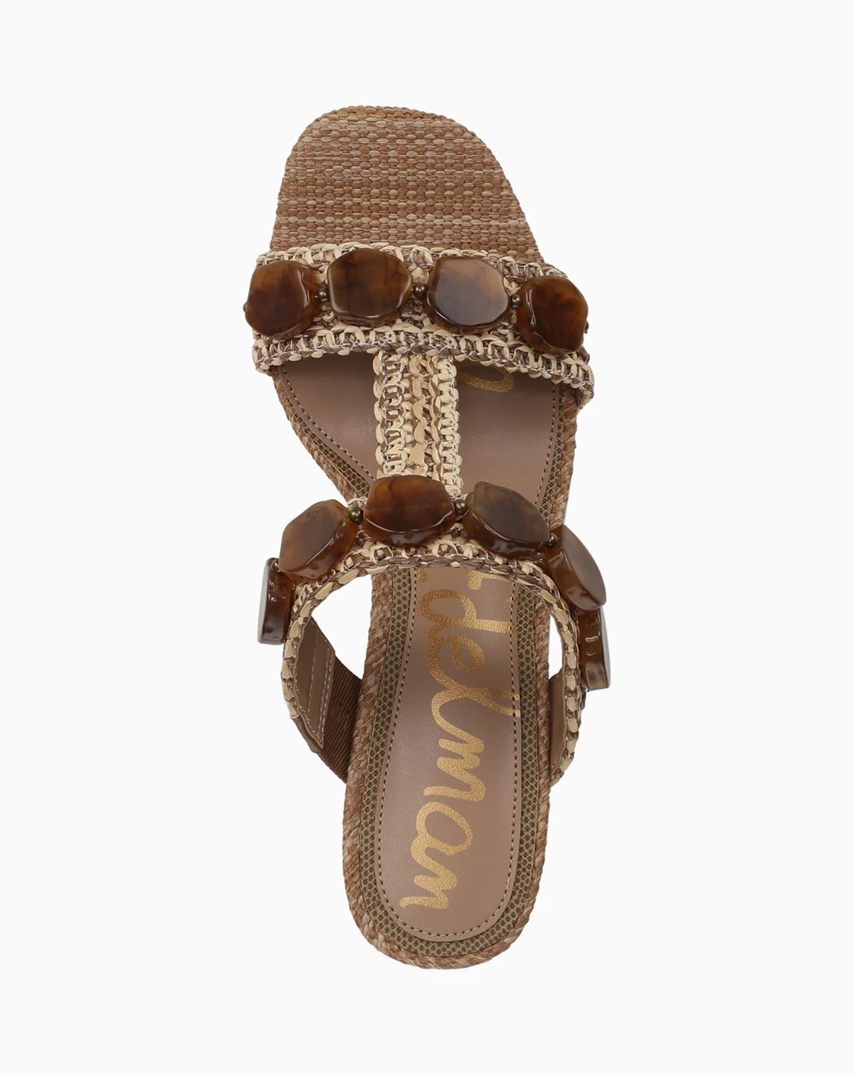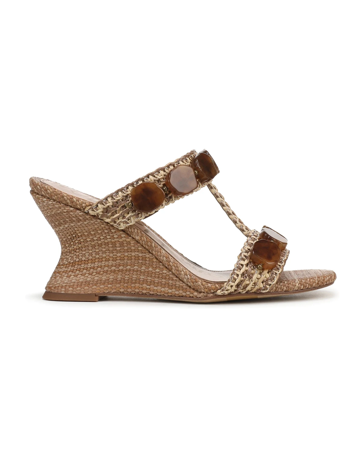 This wedge sandal reimagines the classic T-strap with a playful touch of stone embellished raffia and a modern square toe. Designed as the ideal summer wedge shoe, it blends style-forward details with chic confidence for day or night.