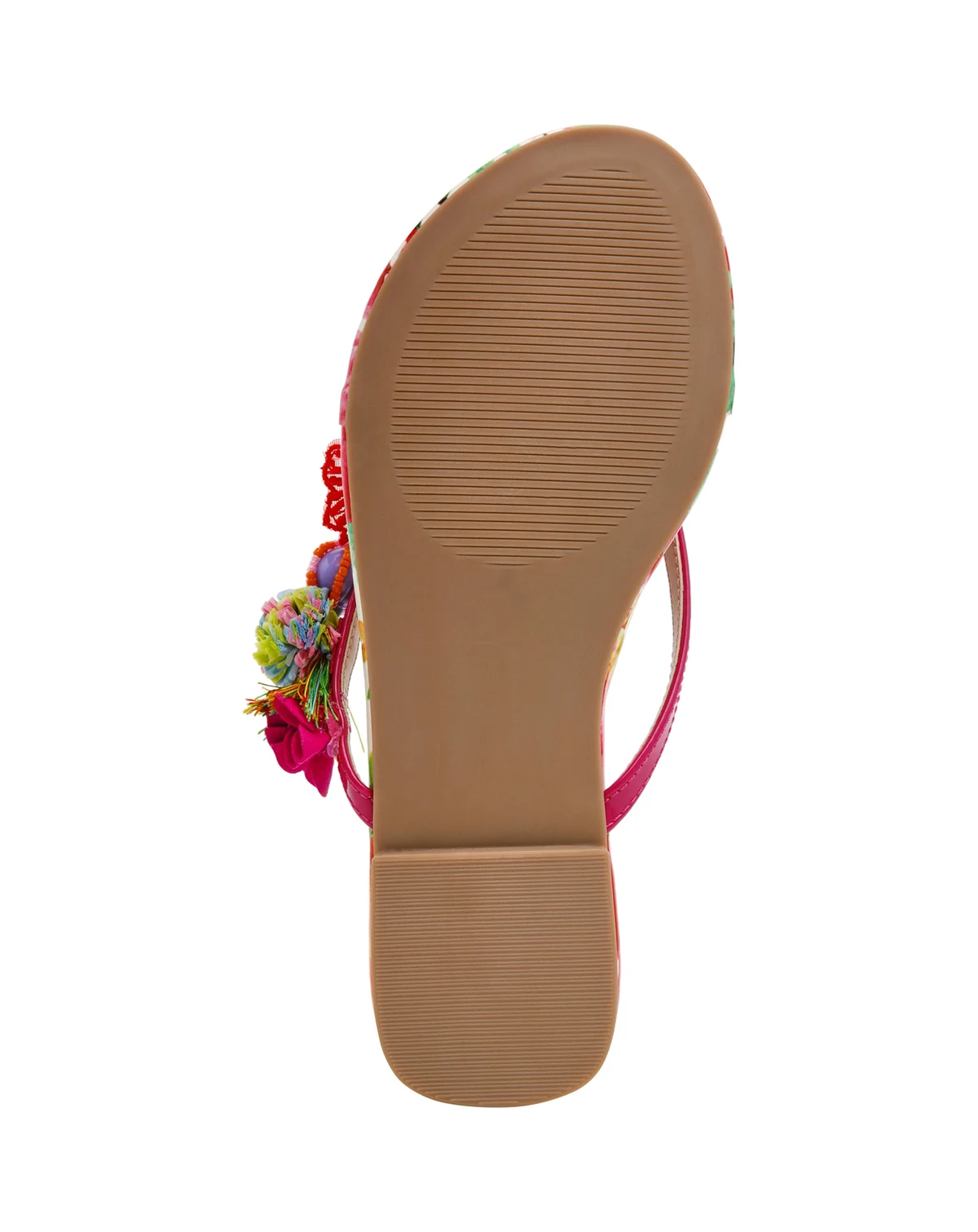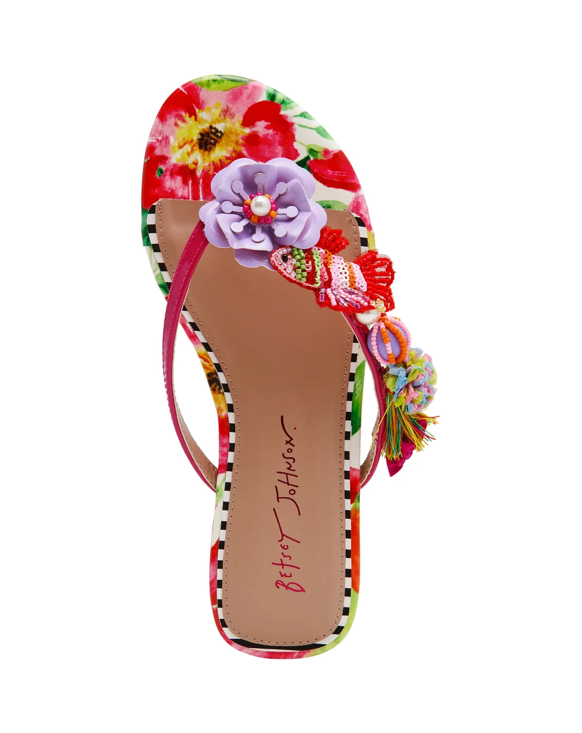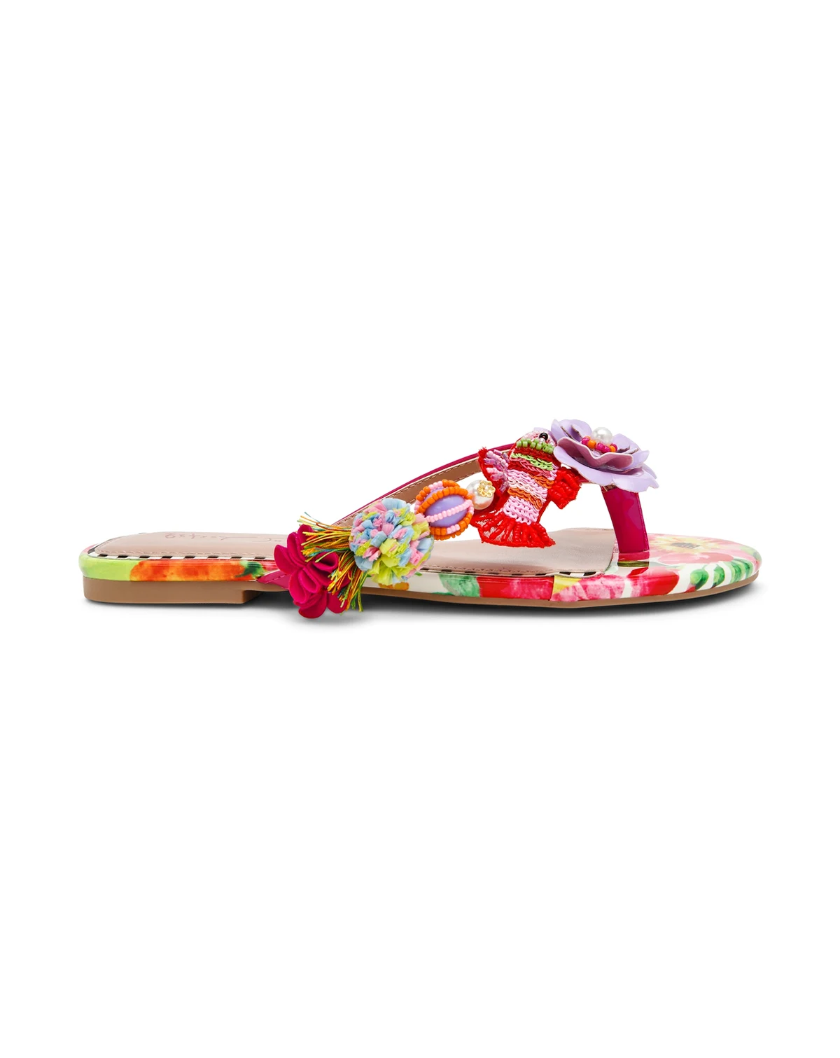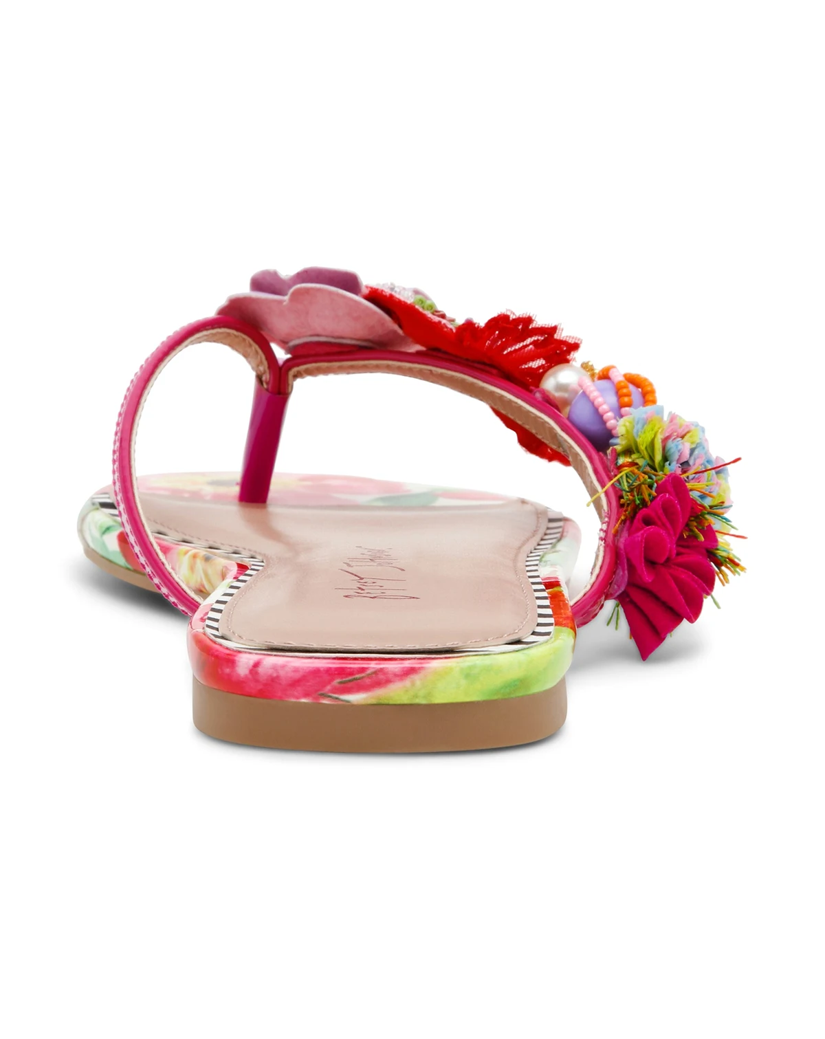 Whimsical floral accents define these Doloris thong flat sandals from Betsey Johnson, highlighted by hand-beaded flowers and textured rainbow detailing. Cushioned insoles and a tie-dye base create an easy, resort-ready feel.