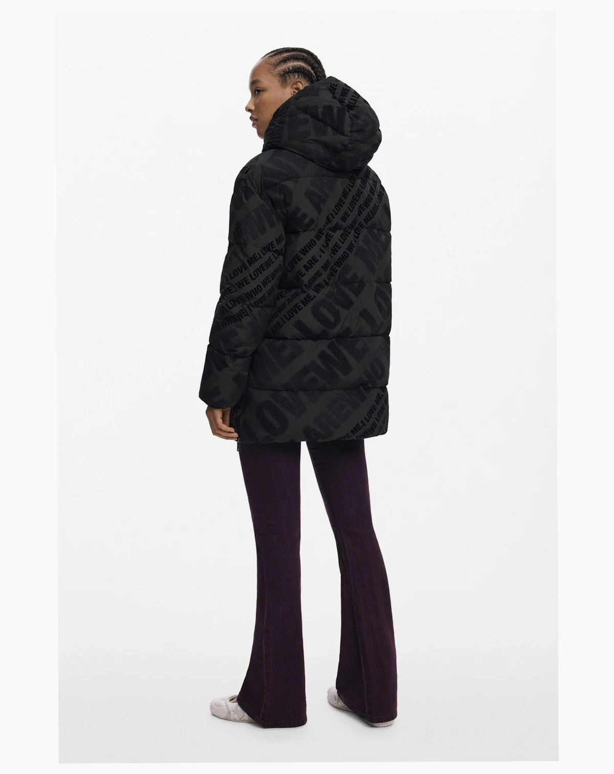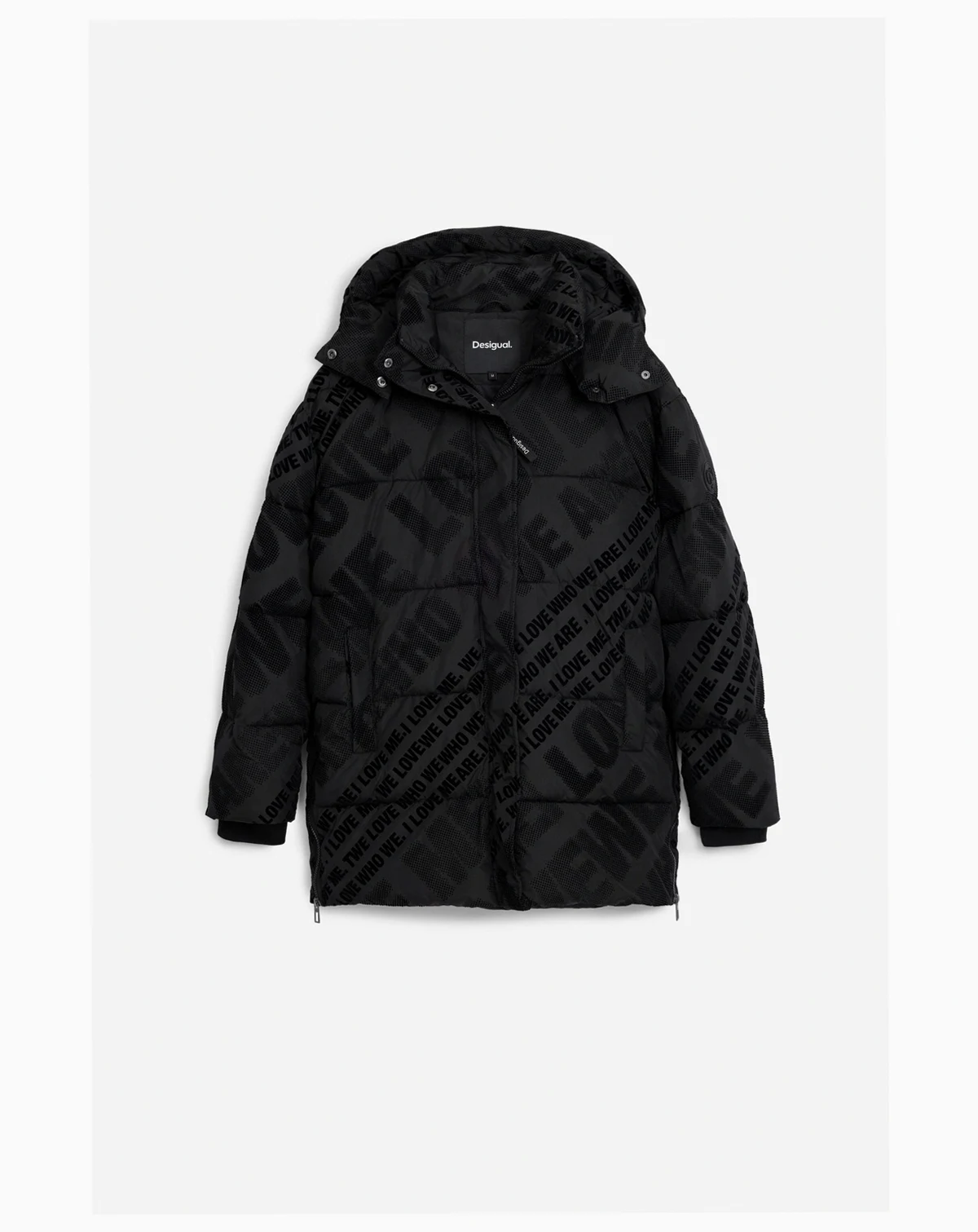 Long quilted coat with front pockets and removable hood in a solid color with flocked details.