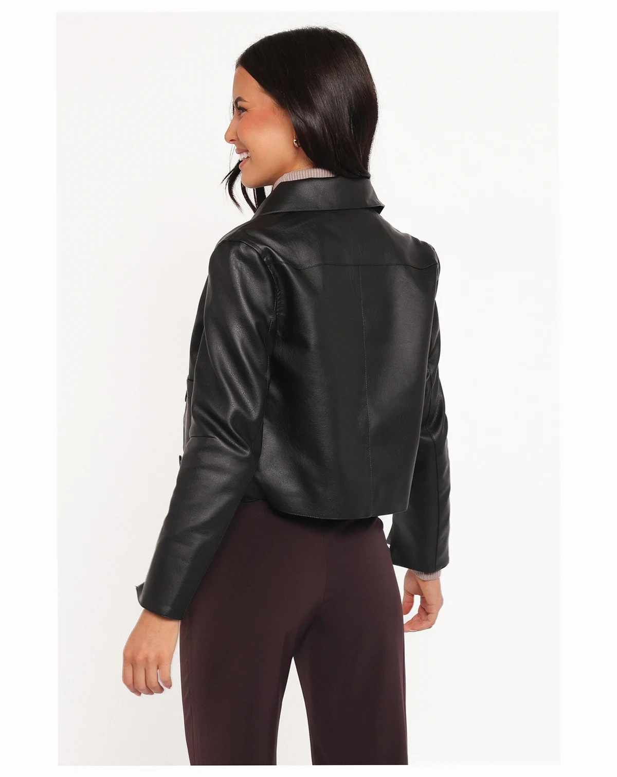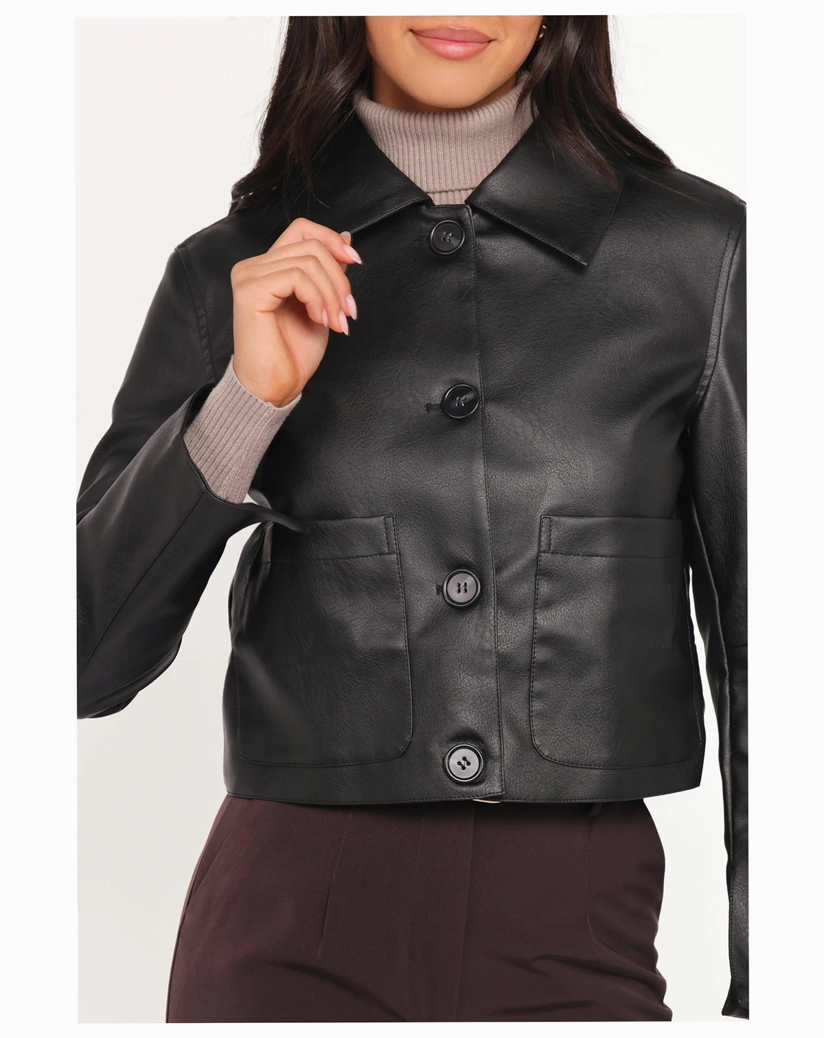 The Hope Crop Faux Leather Jacket in Black is your instant style upgrade, transforming any outfit from basic to effortlessly cool. This cropped silhouette hits at just the right spot to elongate your torso while creating that coveted balanced look with high-waisted bottoms.