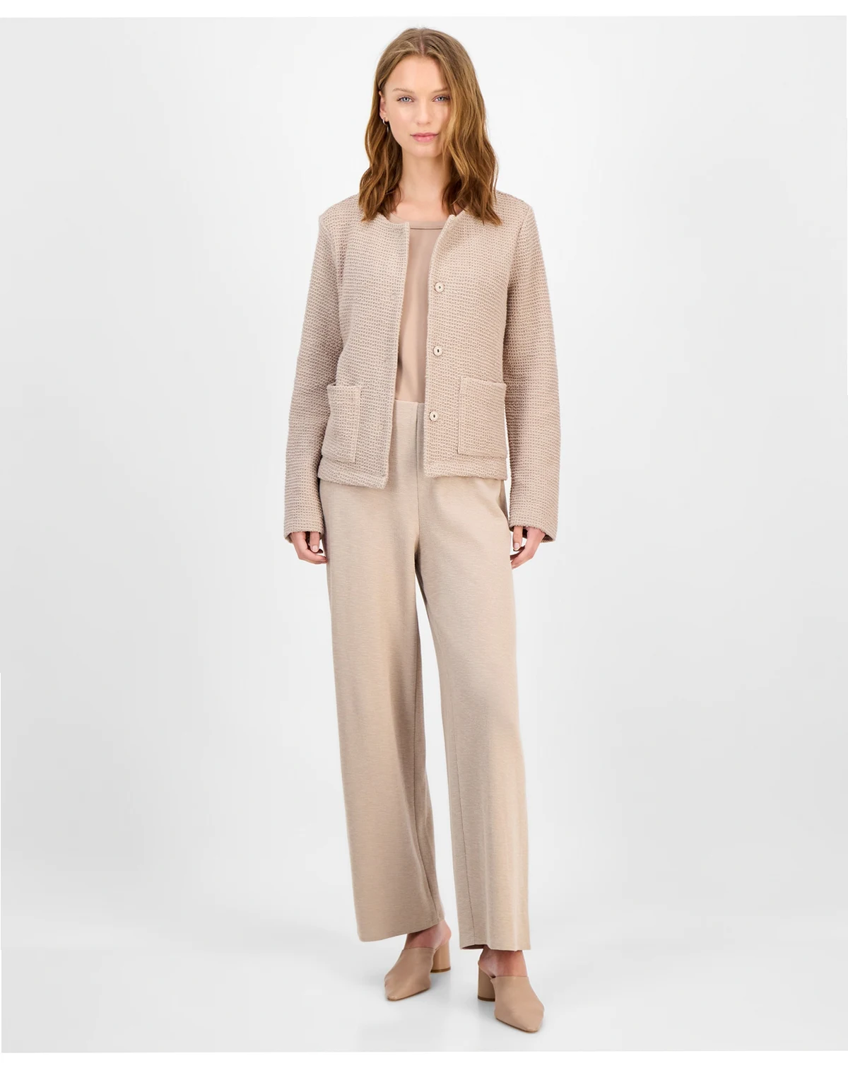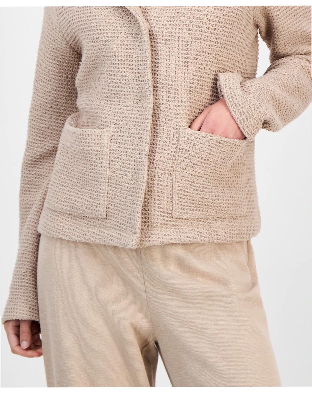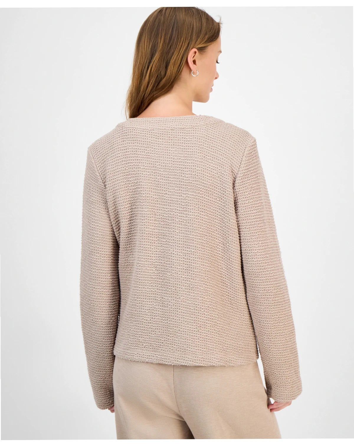 Wrap yourself in cozy sophistication with this Eileen Fisher round neck jacket, crafted from plush, loopy-textured fabric. Lightweight yet warm, it offers comfortable elegance for everyday layering.