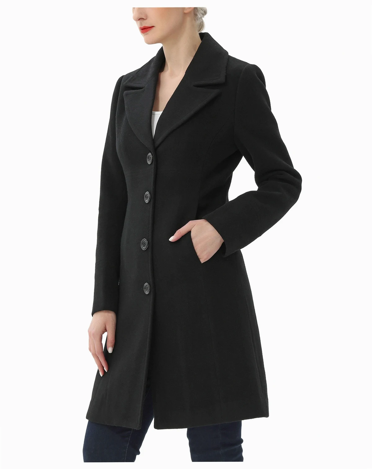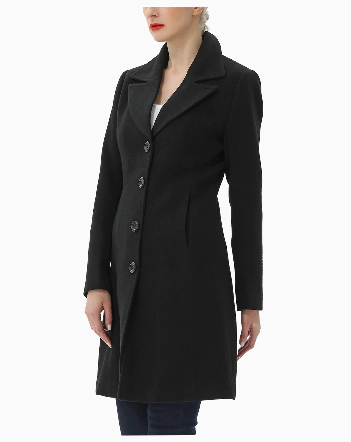Polished tailoring meets everyday versatility in this elegant wool-blend walking coat designed to elevate cold-weather layering. A structured silhouette with clean seaming creates a flattering, streamlined shape, while the refined lapel collar and button-front closure lend timeless sophistication. Crafted from a warm wool blend, this coat transitions effortlessly from weekday commuting to weekend outings with classic, wear-anywhere appeal.