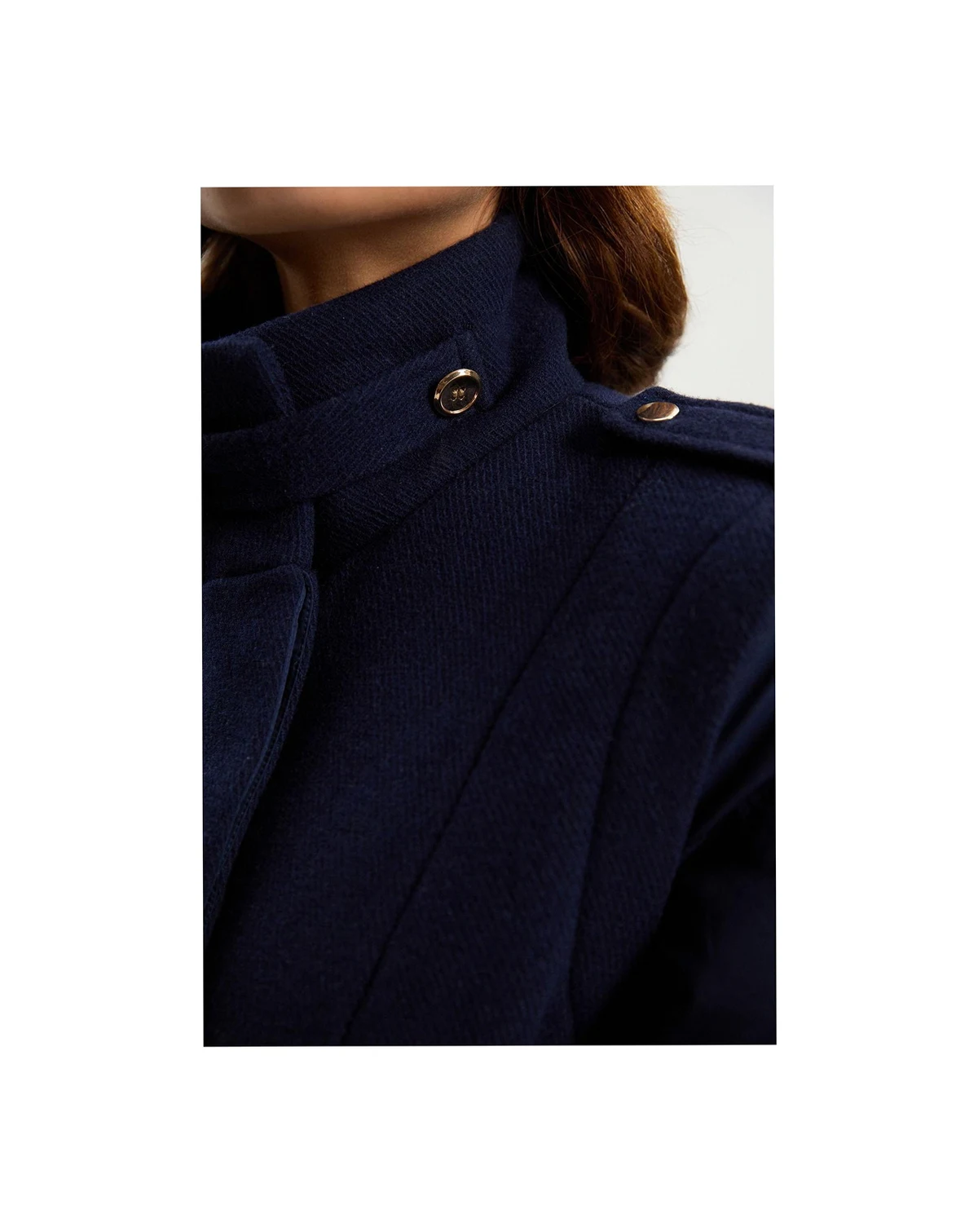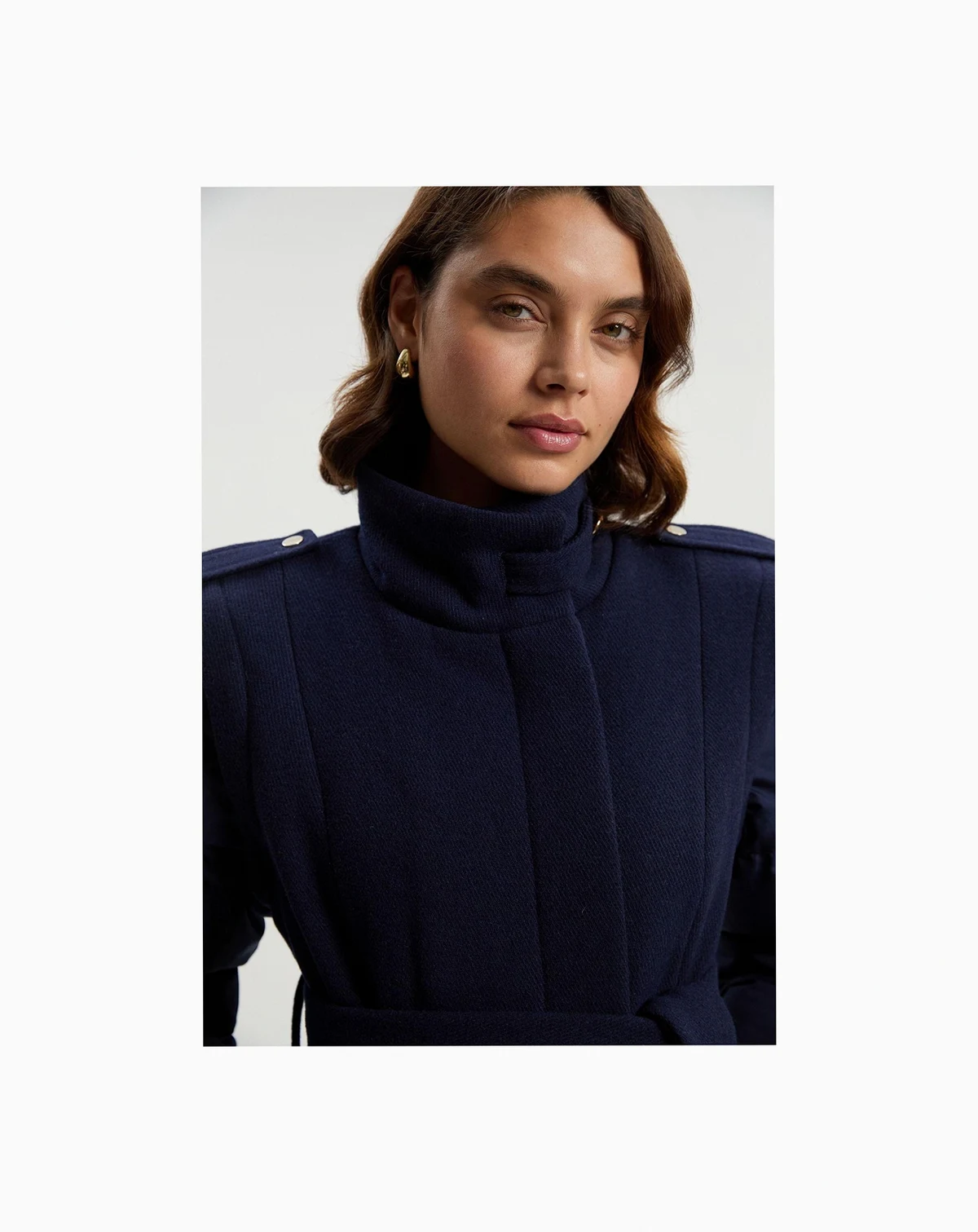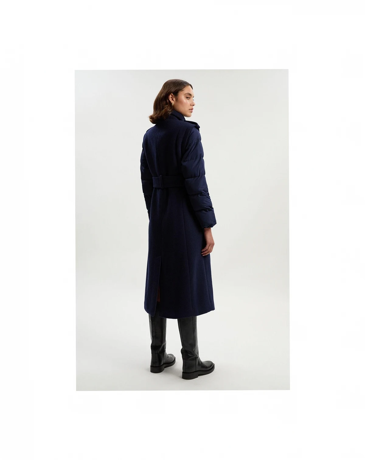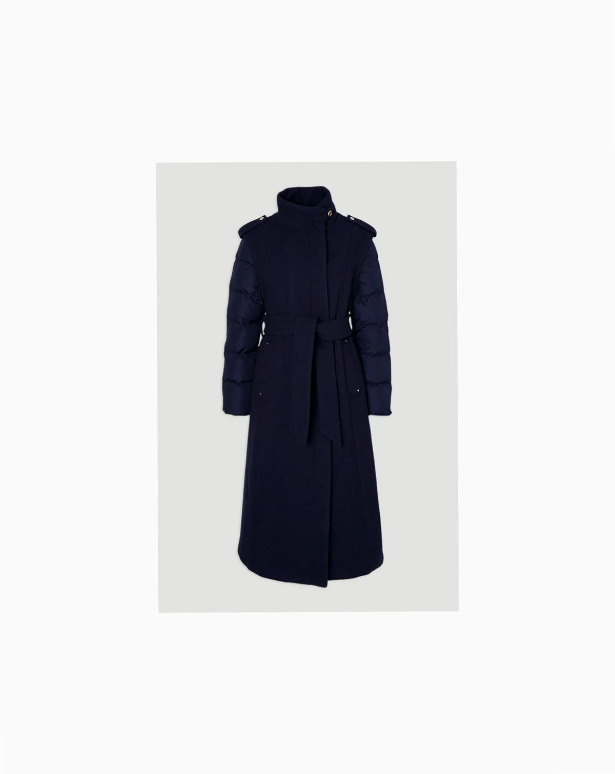 A sculpted belted midi coat blending a structured body with quilted sleeves for insulated warmth, a high neck for protection, and a cinched waist for confident winter style.