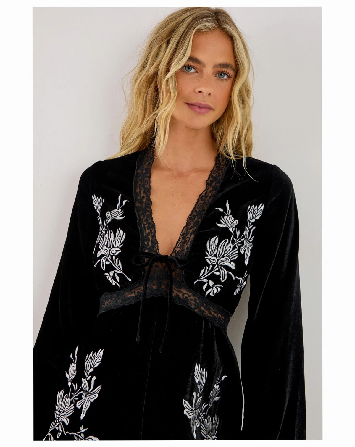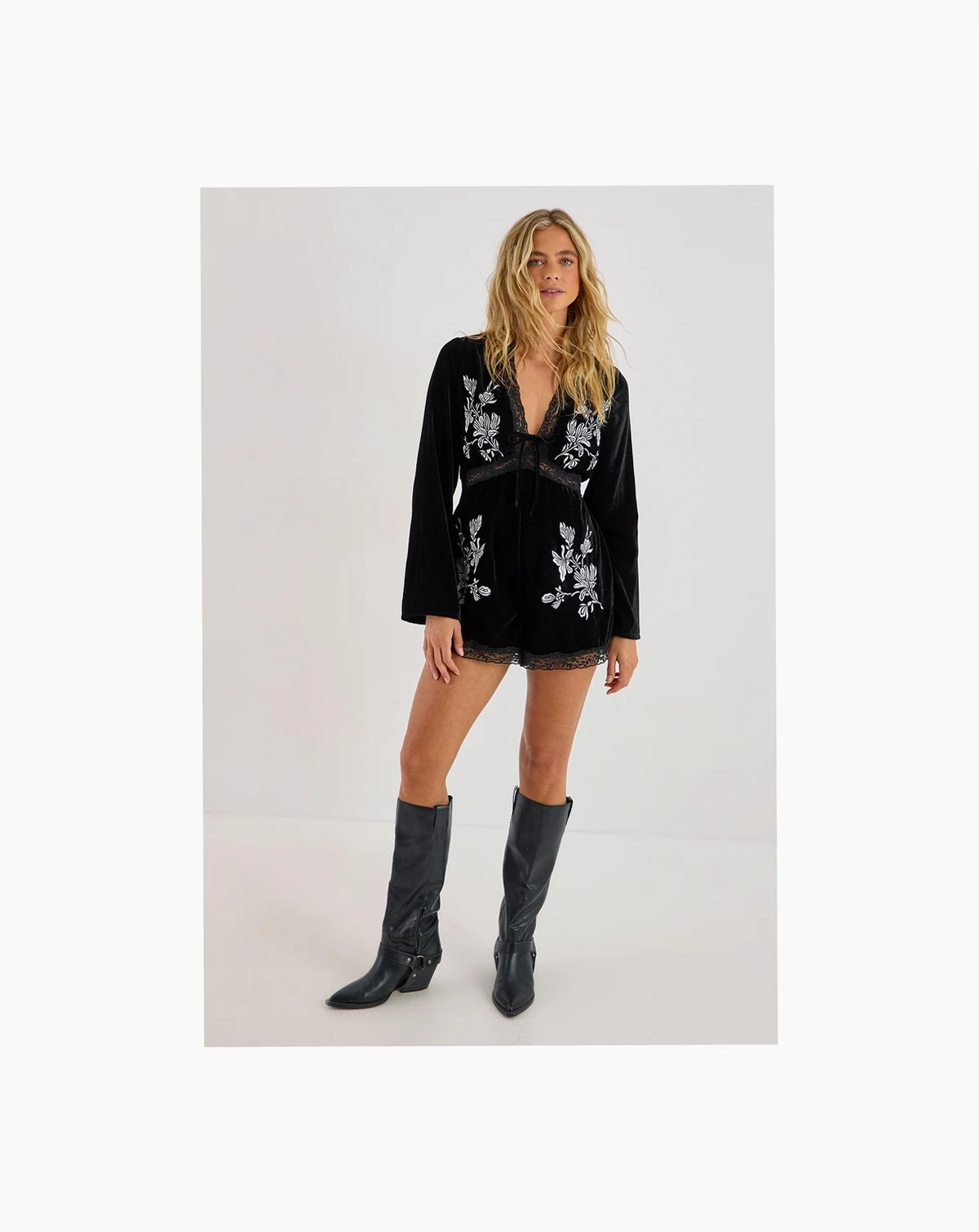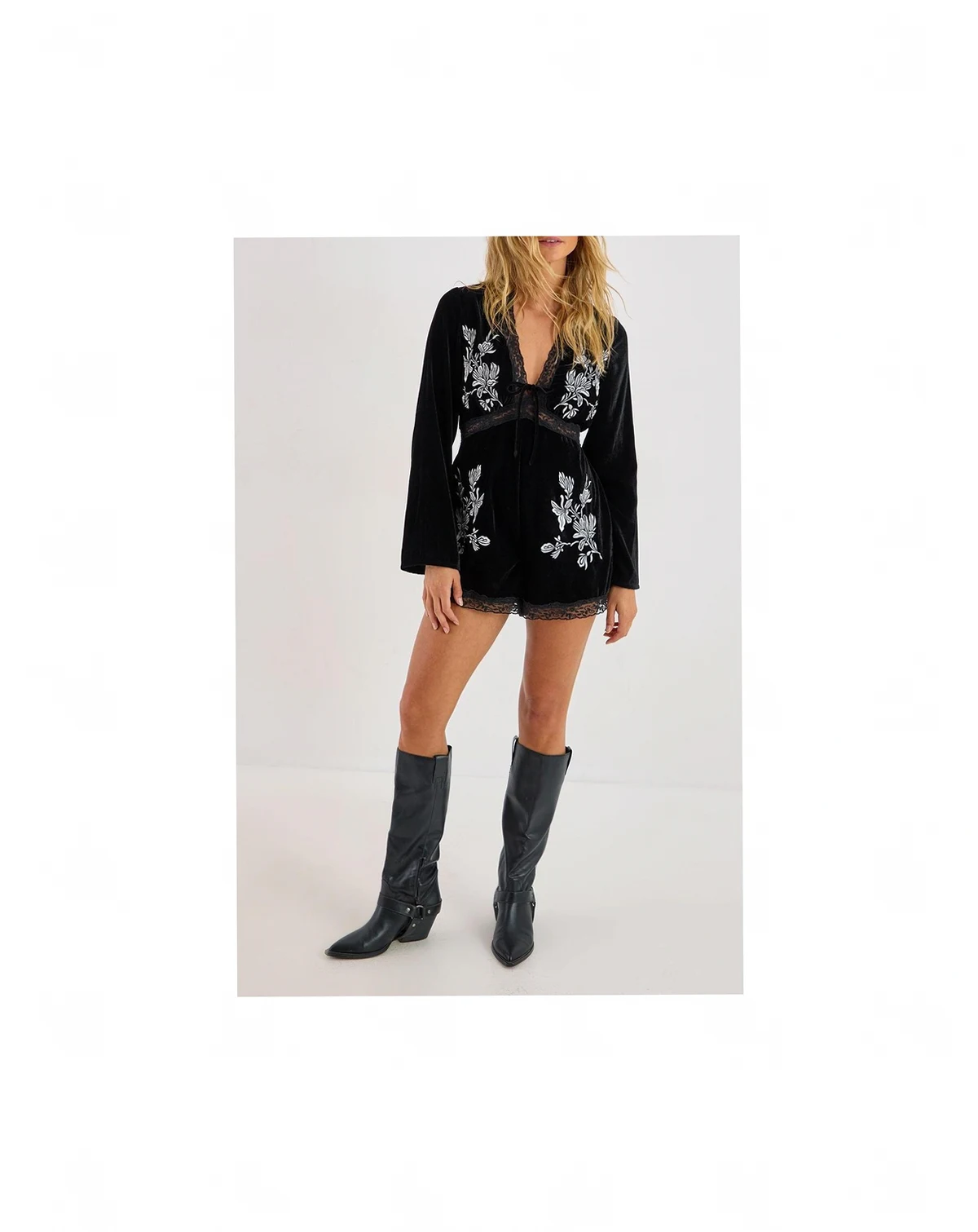 This striking velvet romper from NastyGal combines opulence with effortless style. The contrasting embroidery creates a dramatic visual impact against the sumptuous velvet backdrop, whilst the plunge neckline offers a daring yet sophisticated look. Perfect for day-to-night transitions, pair with chunky boots and a leather jacket for casual daytime events, or transform your look with strappy heels and statement jewelry for evening occasions.