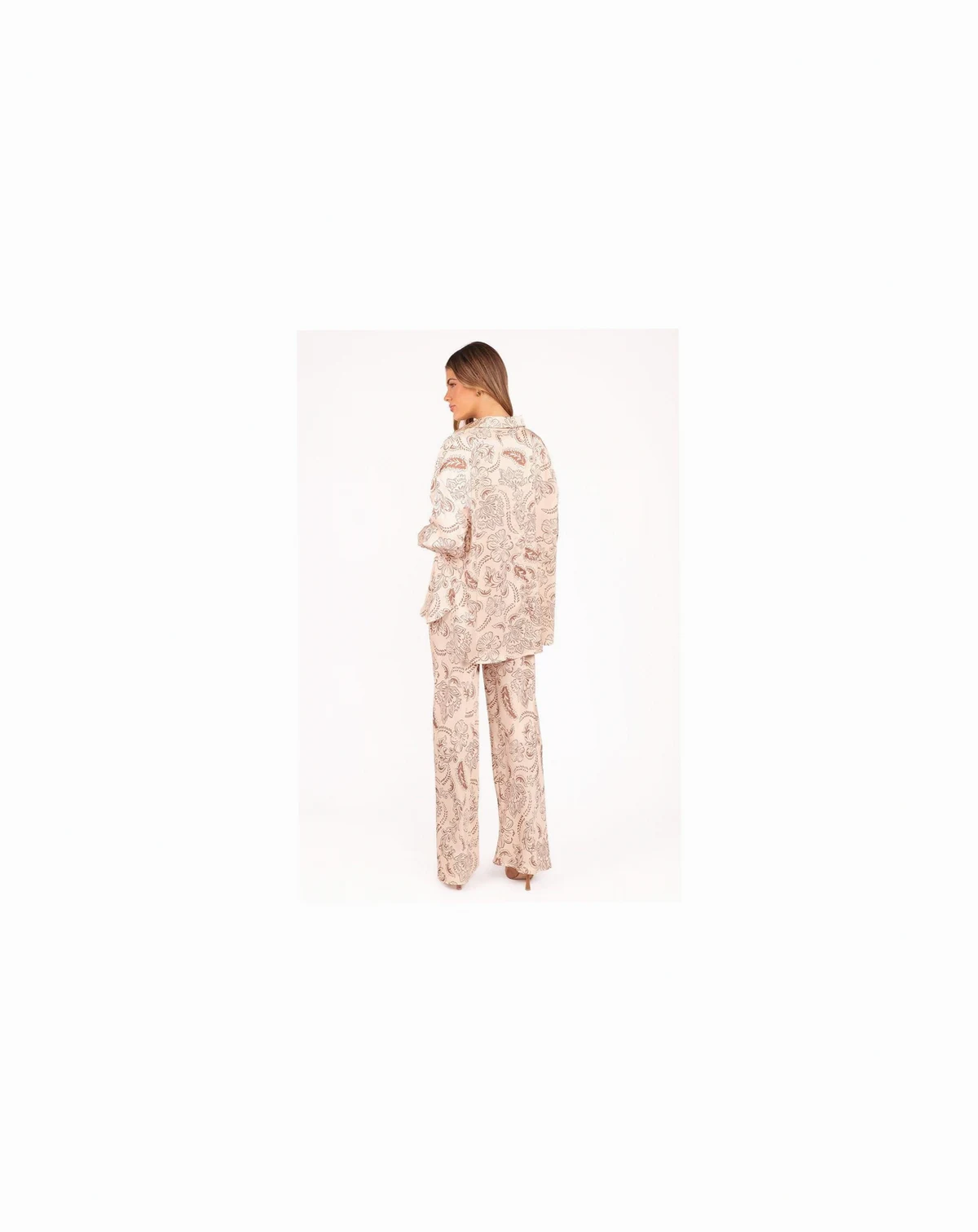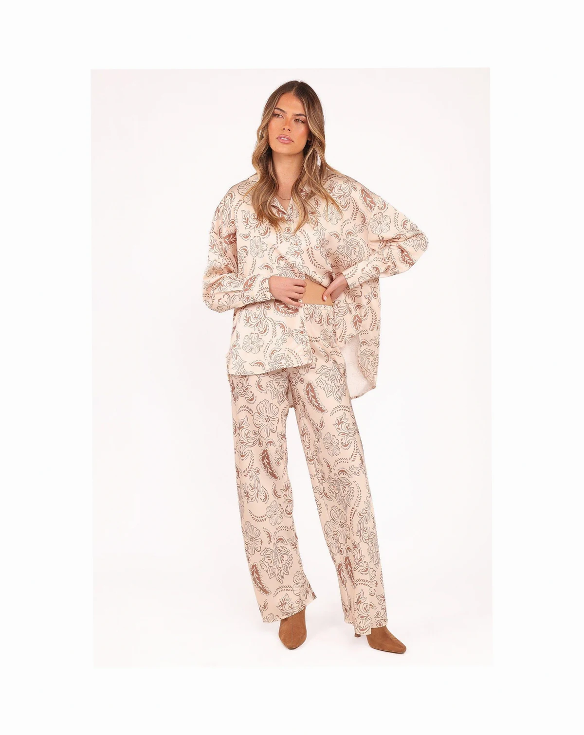 Elevate your wardrobe with the Rosalie Satin Pant in Brown Paisley. Featuring a mid-rise silhouette and an elasticized waistband, these straight-leg pants are as comfortable as they are chic.