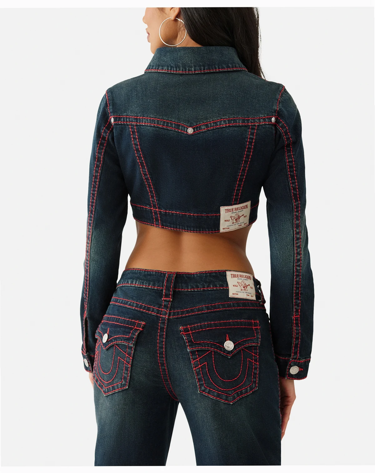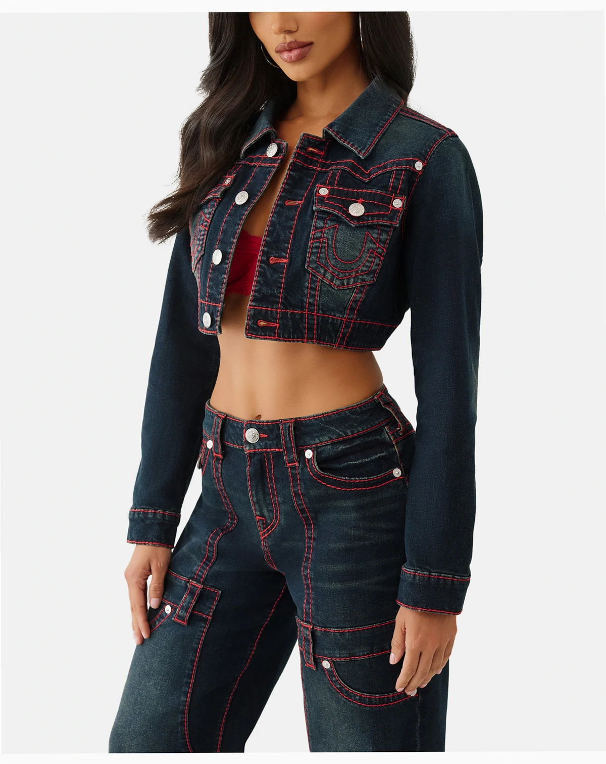 Crafted from soft stretch denim, this women's cropped jacket features a deep dark rinse, trucker-style design, basic collar, and a button-front closure. Finished with scarlet Big T stitching and horseshoe detailing on the chest flap pockets.