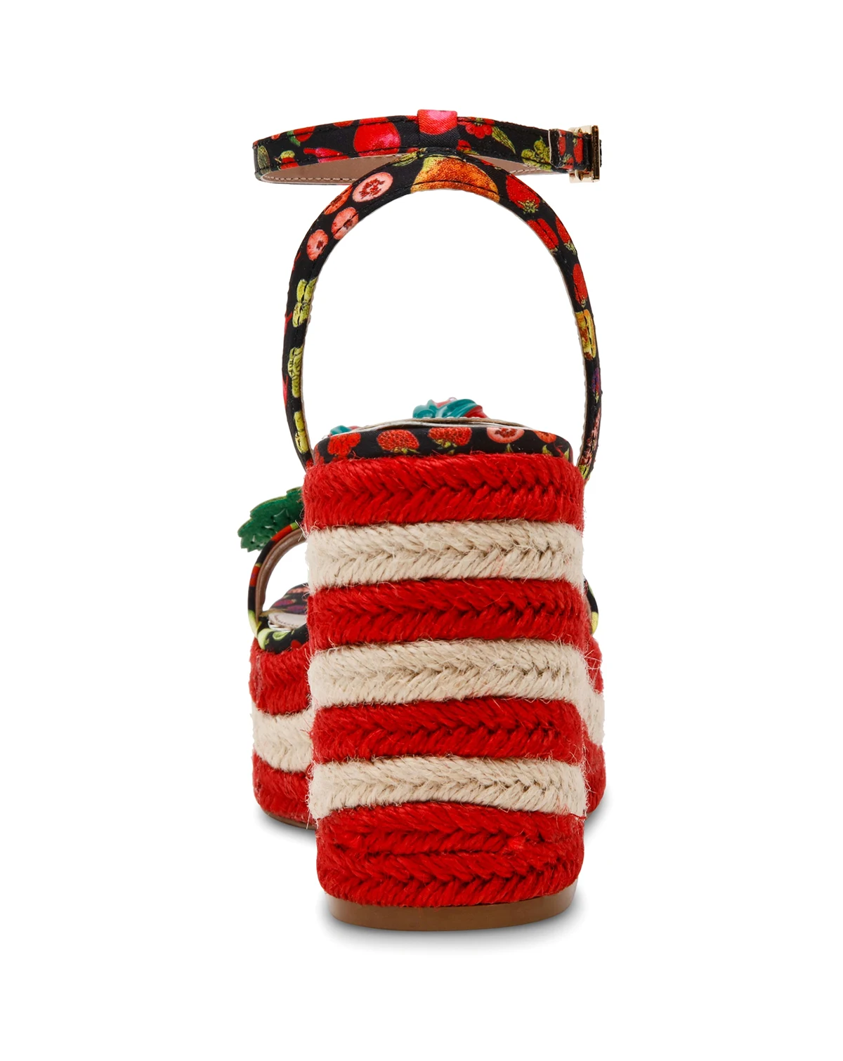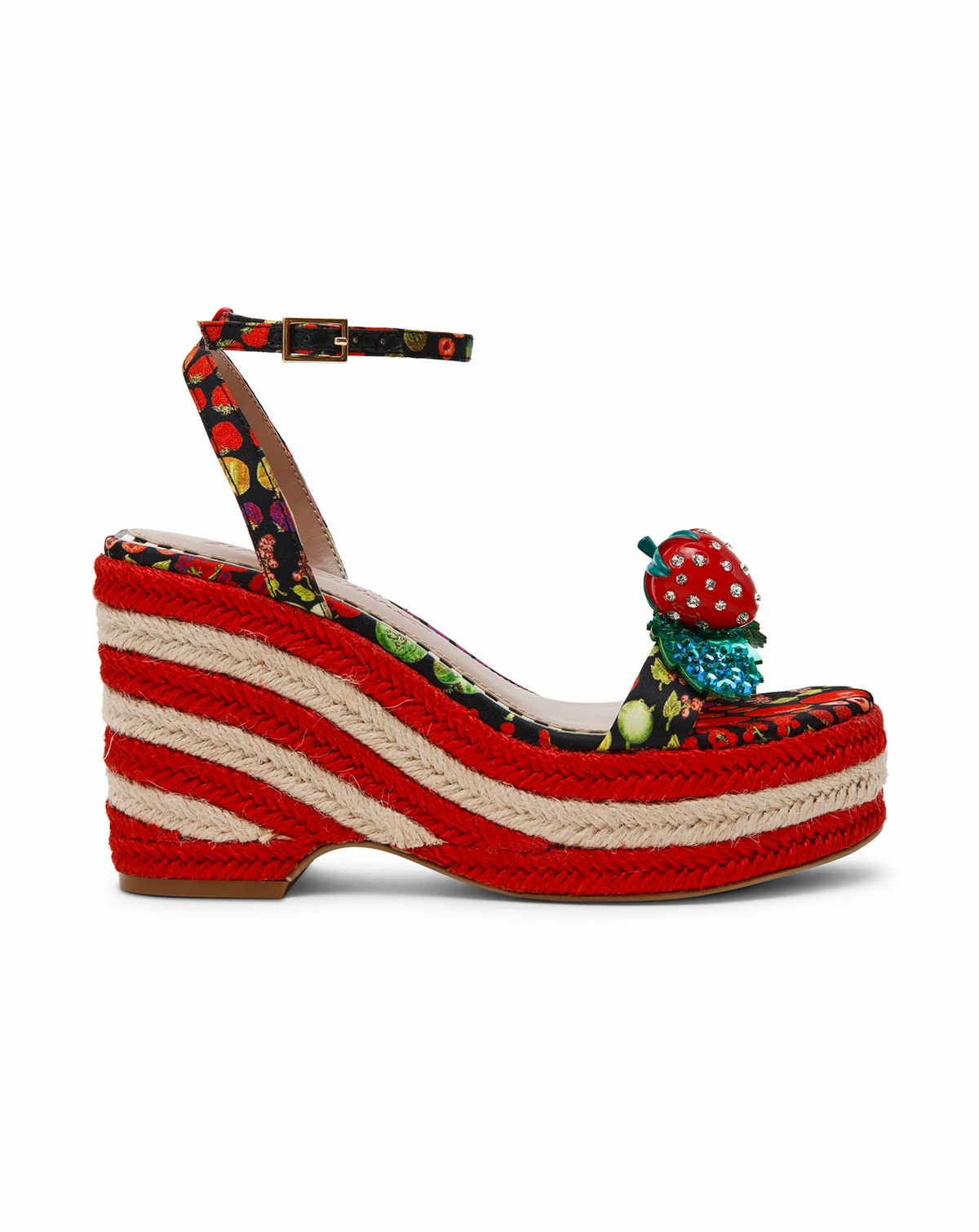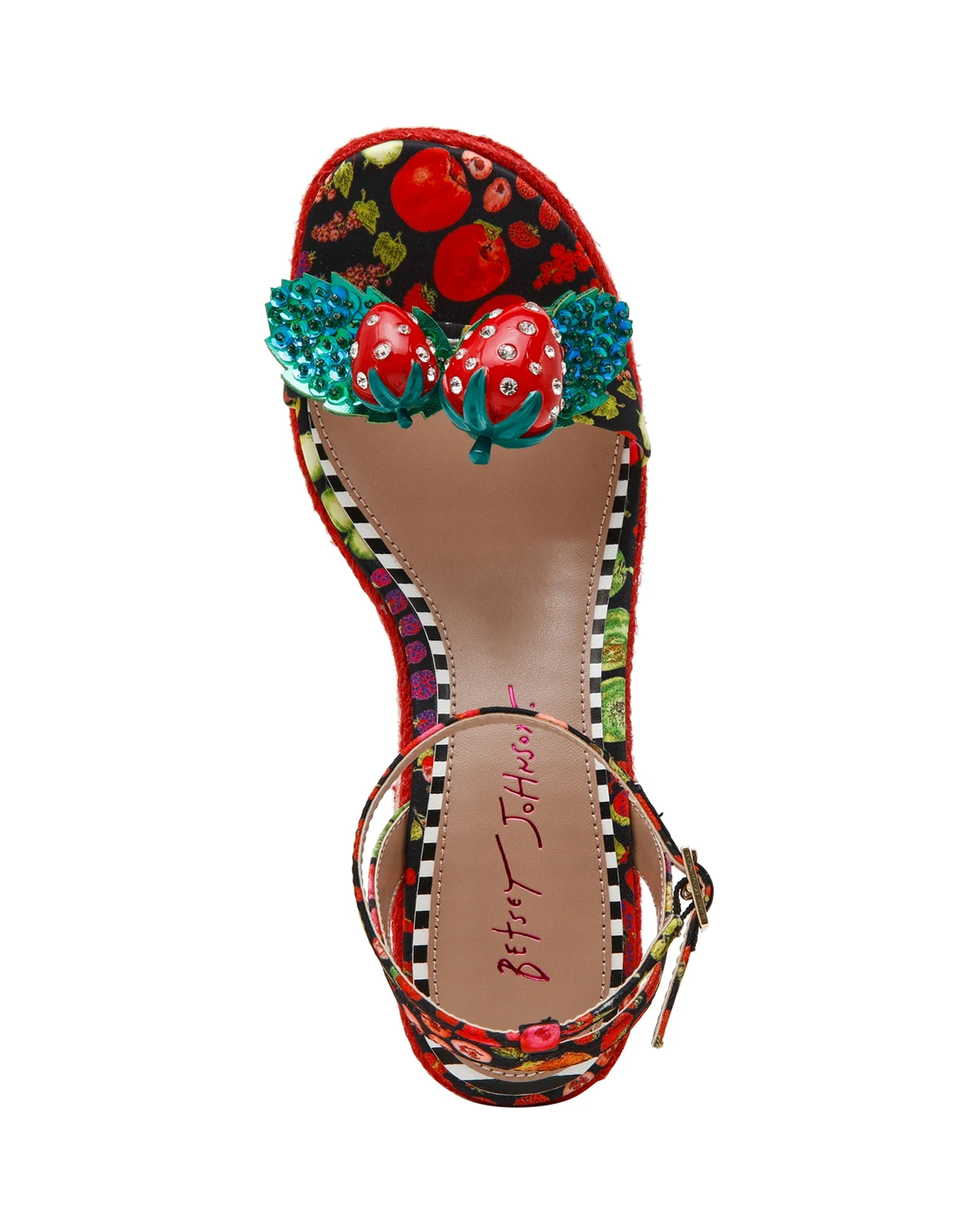 Playful fruit motifs define these Bobbie wedge sandals from Betsey Johnson, showcasing vibrant prints and sparkling strawberry accents. Braided rope platforms add height with relaxed, vacation-ready appeal.