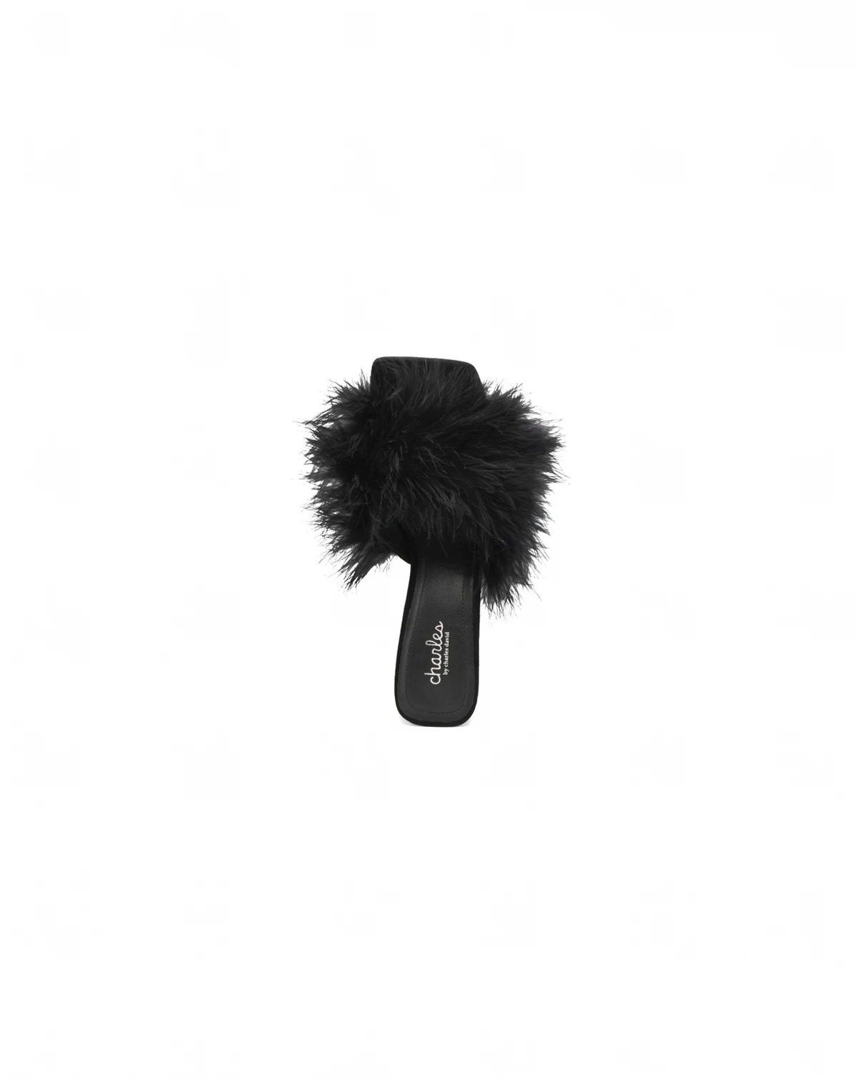 Feathers galore atop this square toe with flared heel sandal
