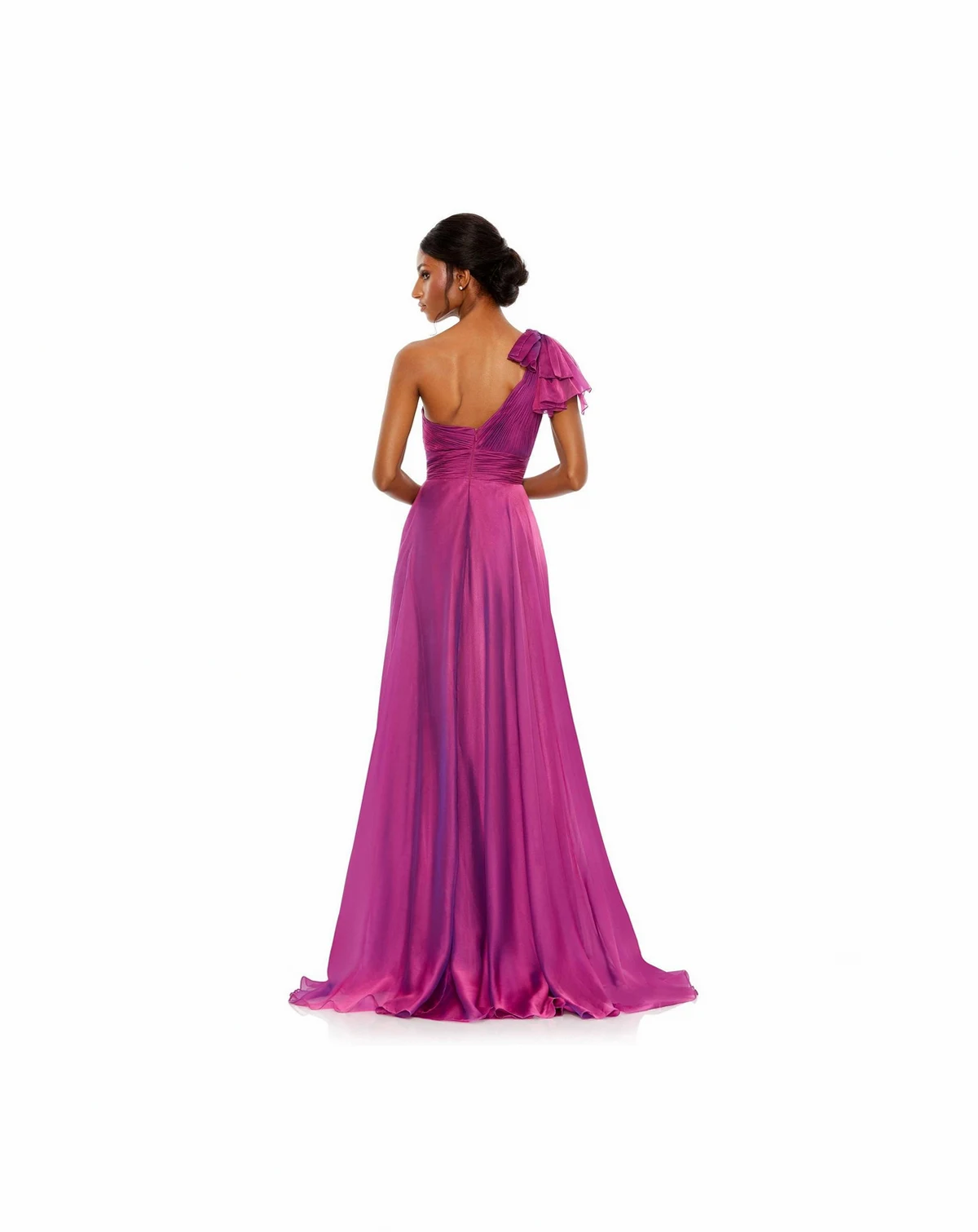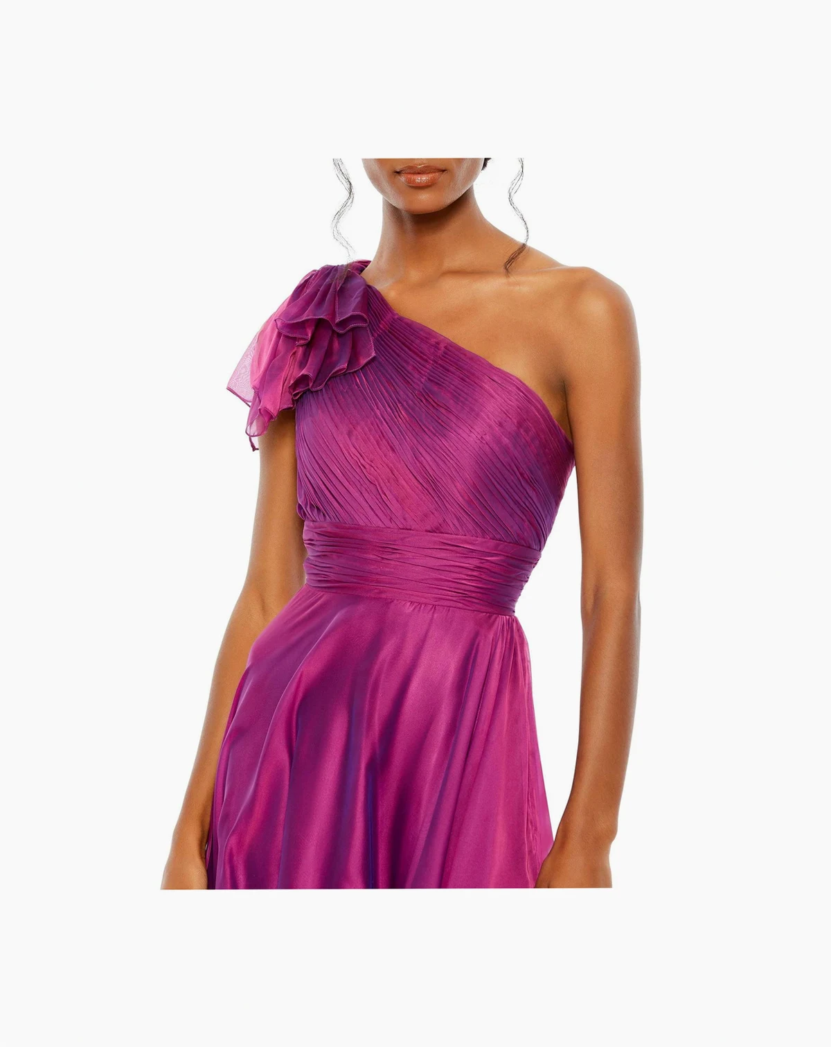 This glamorous gown takes drama to a new height. The pleated bodice and cummerbund cinch the waist before flowing into a fully lined floor-length skirt with a sweeping train. A thigh-high front slit adds intrigue to every step, while the one-shoulder neckline showcases just the right amount of skin.