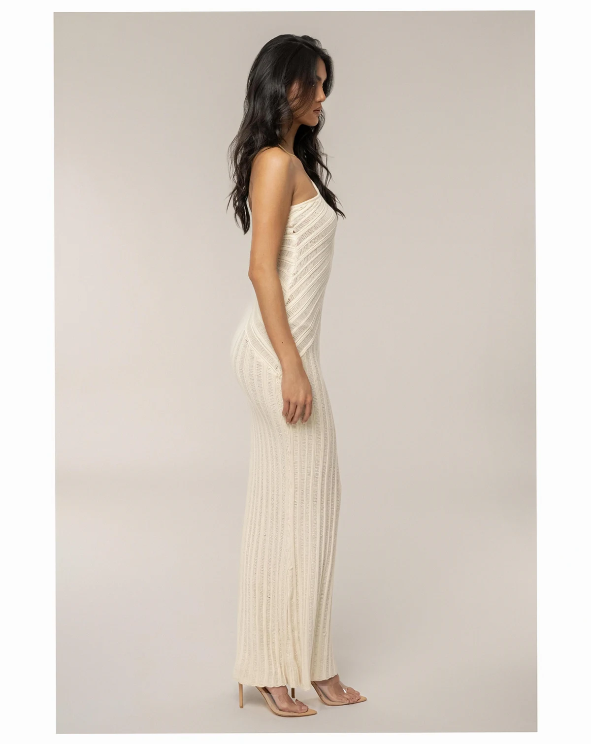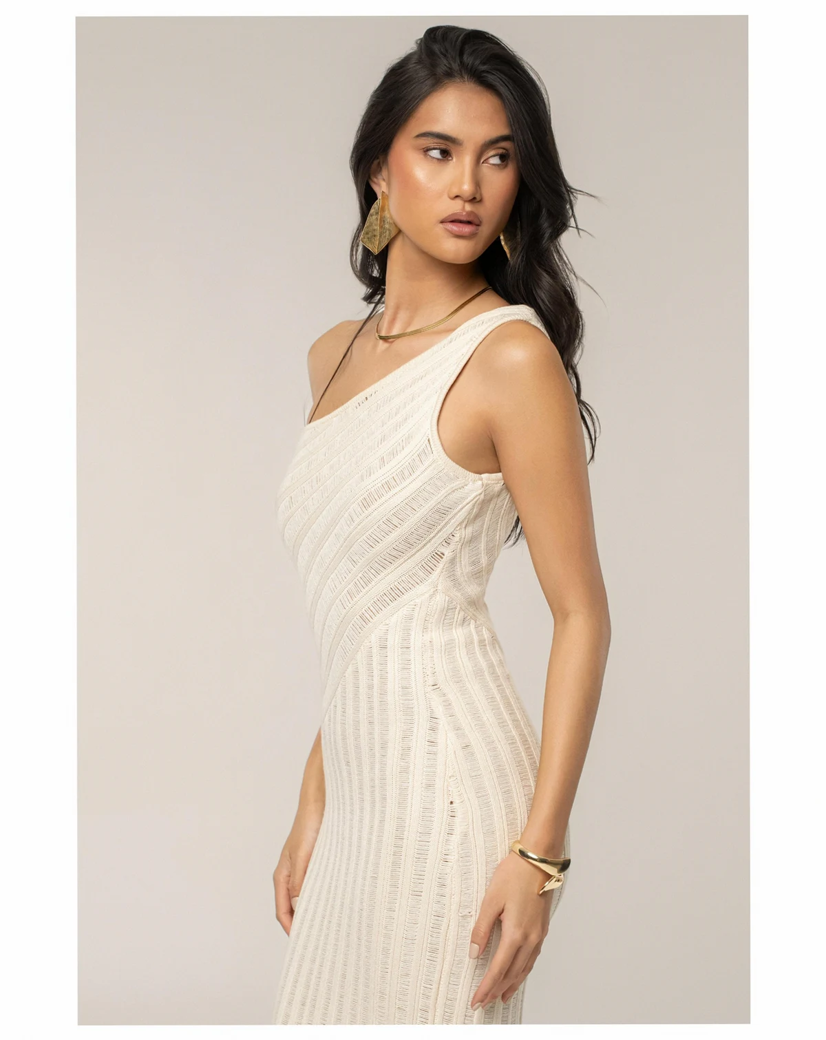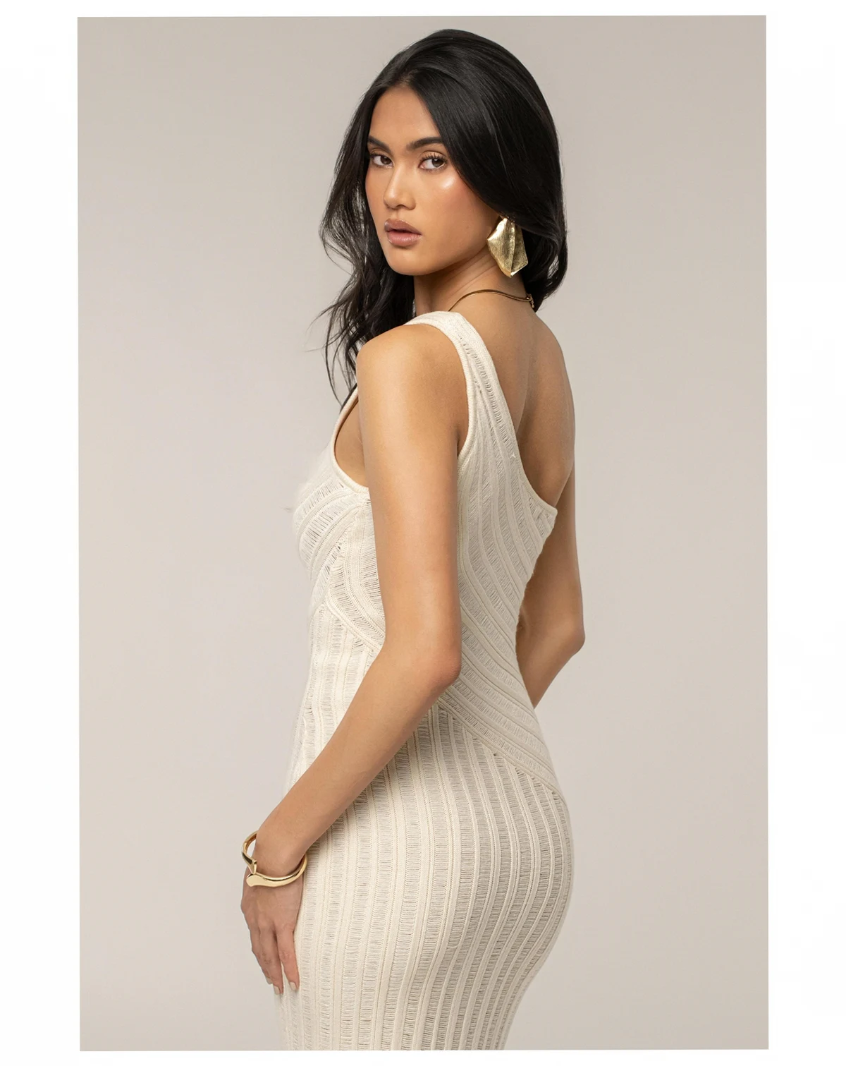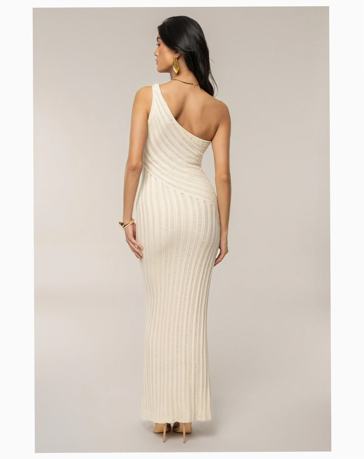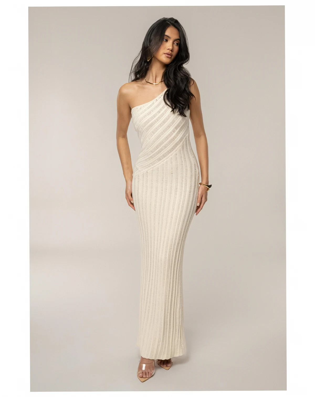 Escape to the coast in our Fringe Knit Maxi Dress, featuring a maxi-length, form-fitting silhouette and an elegant asymmetrical one-shoulder neckline. It's crafted from knit fabric with subtle diagonal ribbing for texture, enhancing its appeal. This stylish piece is your new go-to for effortless sophistication. Interior lining.