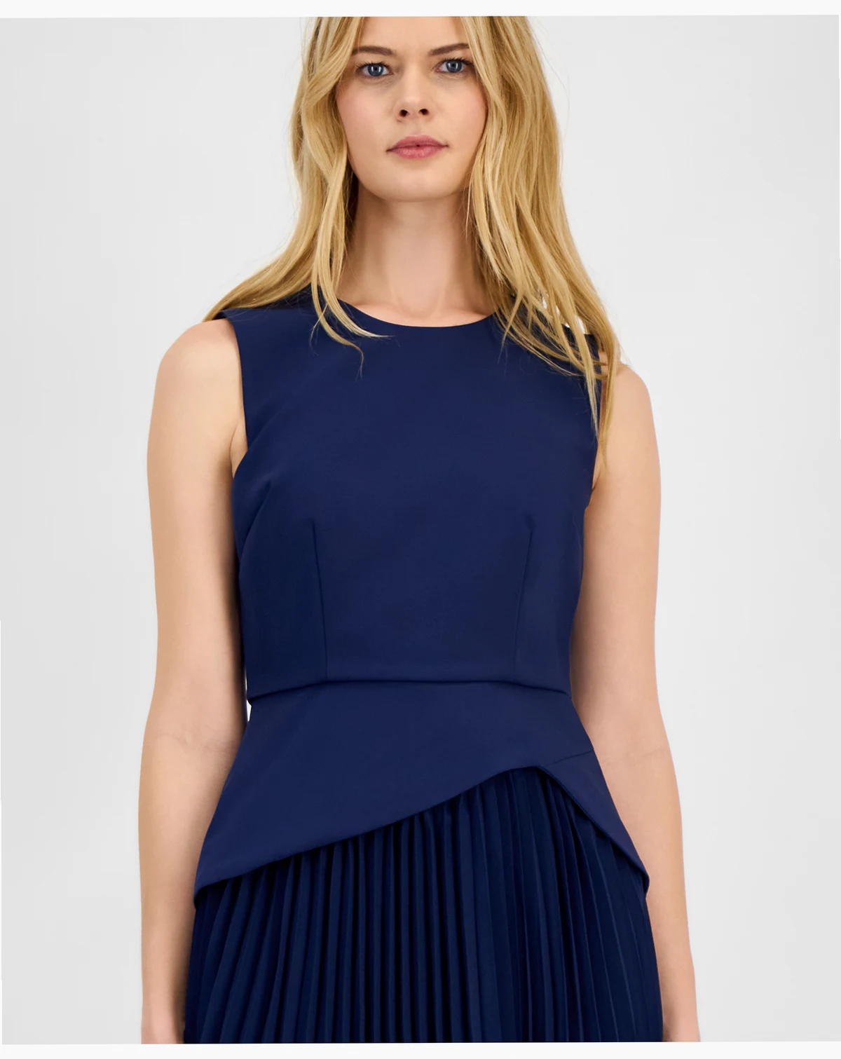 Sam Edelman adds drama to your wardrobe with this tailored crepe dress. A polished bodice and peplum overlay a chic pleated skirt.