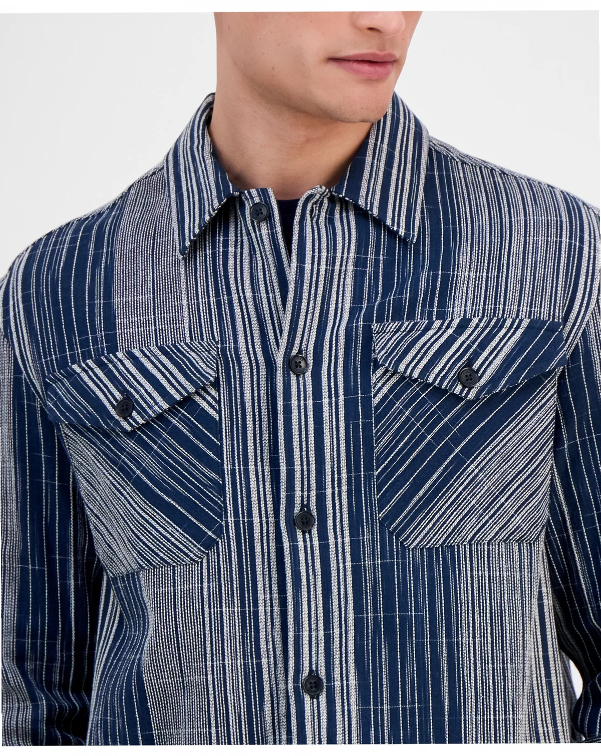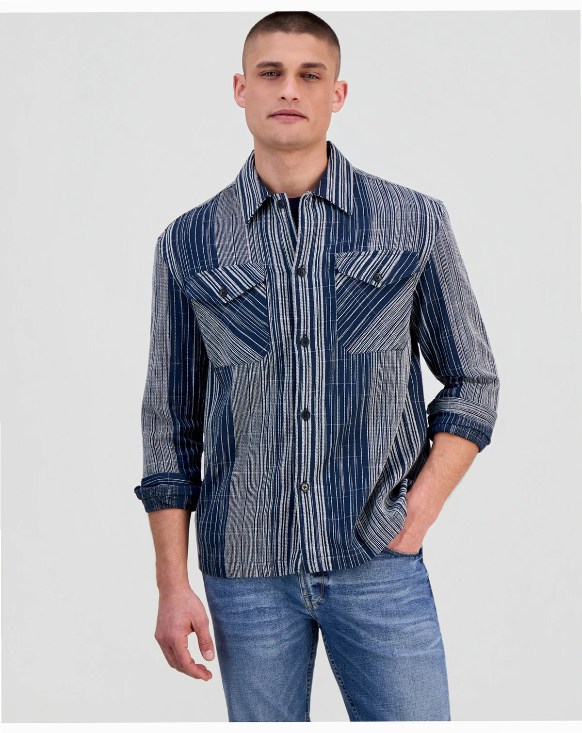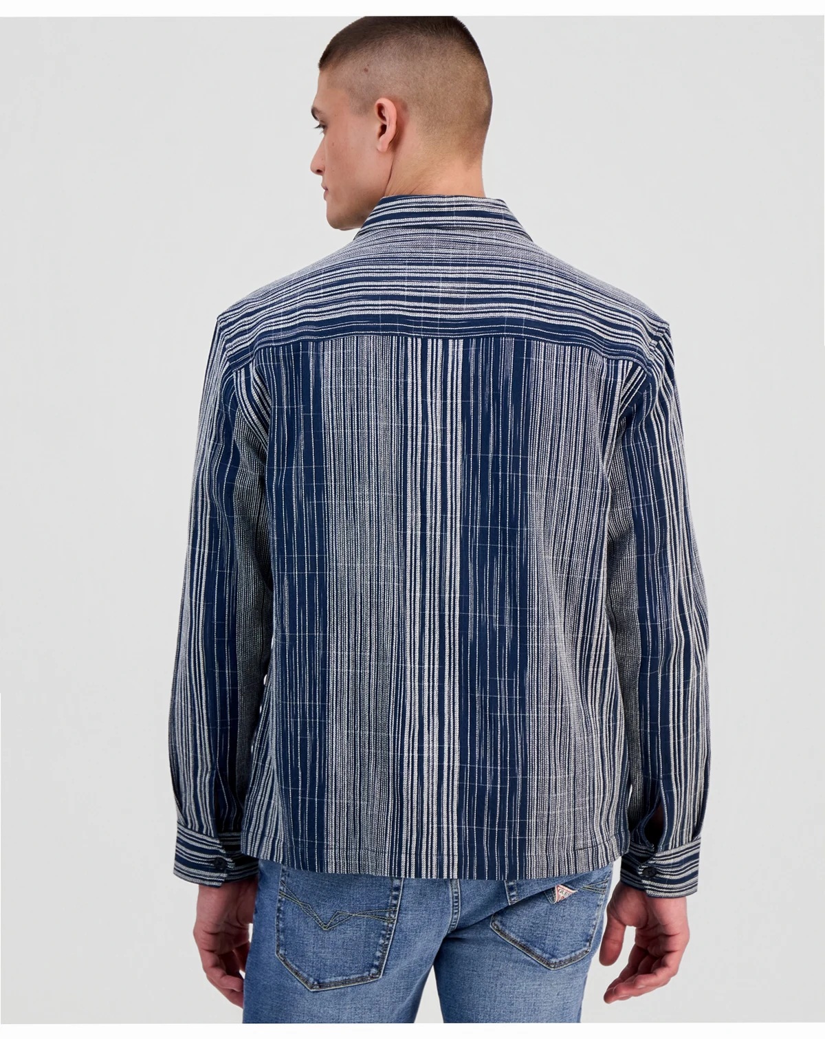 This long-sleeve overshirt from GUESS blends bold texture with versatile layering appeal. In premium jacquard fabric, it features a striking linear pattern in contrasting tones for a modern, elevated look. With a button-front closure and dual chest pockets, this overshirt is perfect for styling over T-shirts or under jackets, making it an essential piece for transitional weather.
