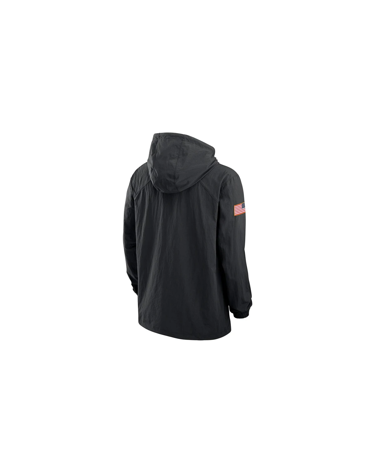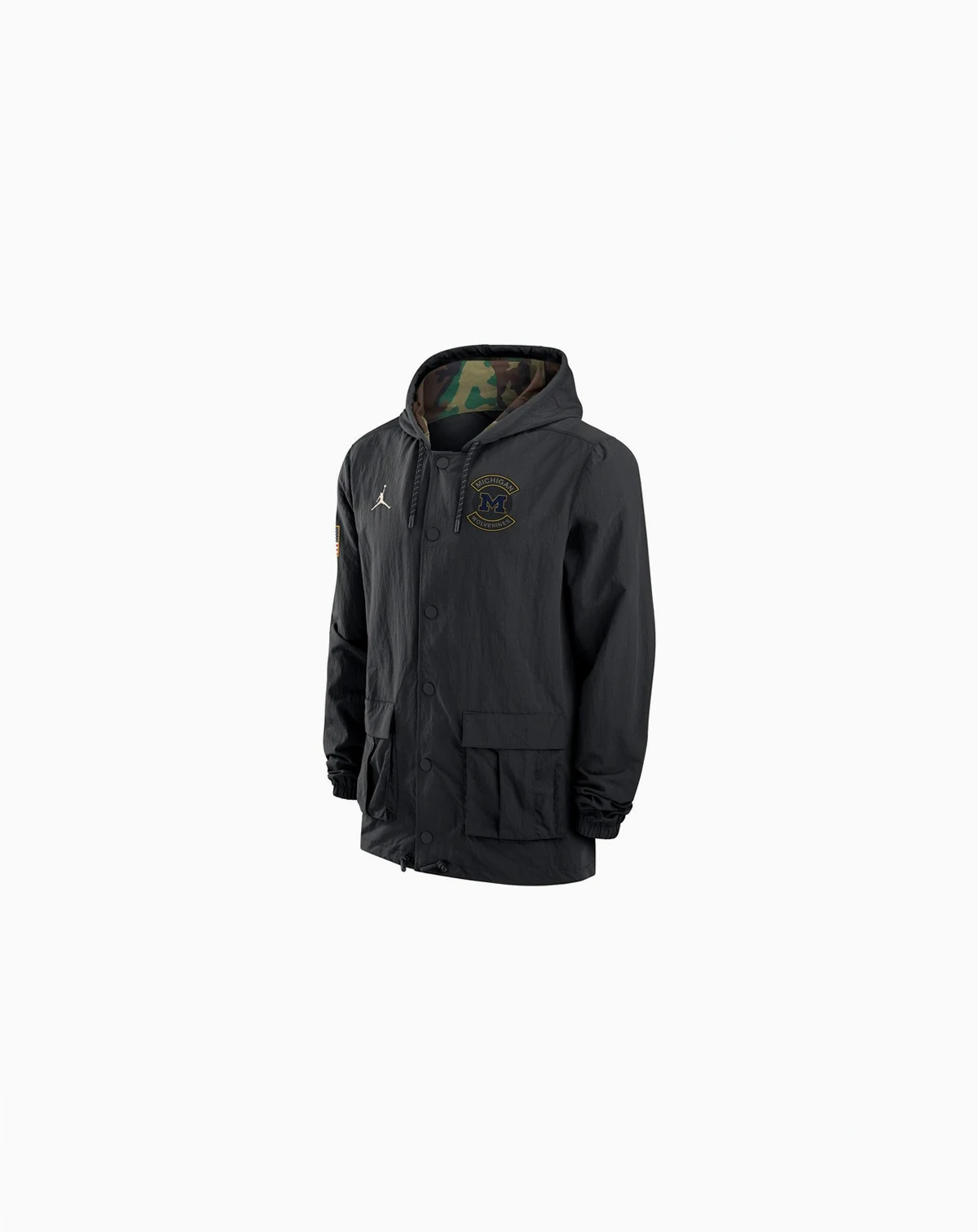 Proudly support the Michigan Wolverines in this 2025 NCAA Military Appreciation Full-Snap Jacket by Jordan. It's crafted from water-resistant nylon to ensure you stay dry and comfortable on rainy days. The drawstring hem allows for a customizable fit, while a camo-lined hood and elastic cuffs give you added coverage from the elements in this Michigan Wolverines jacket.