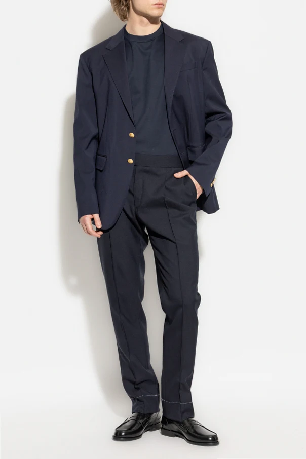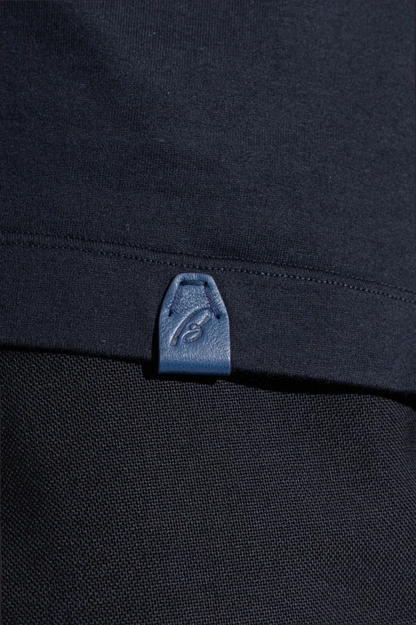 The refined crew neckline is finished with a wide, meticulously constructed ribbed trim, ensuring timeless appeal. Its smooth, deep blue surface is uninterrupted by prints, placing emphasis on craftsmanship and material. A discreet leather-inspired patch, embossed with the designer’s monogram and precisely color-matched, graces the lower front hem—an emblem of exclusive distinction. Even the straight, impeccable seams reflect Brioni’s enduring legacy of luxury.