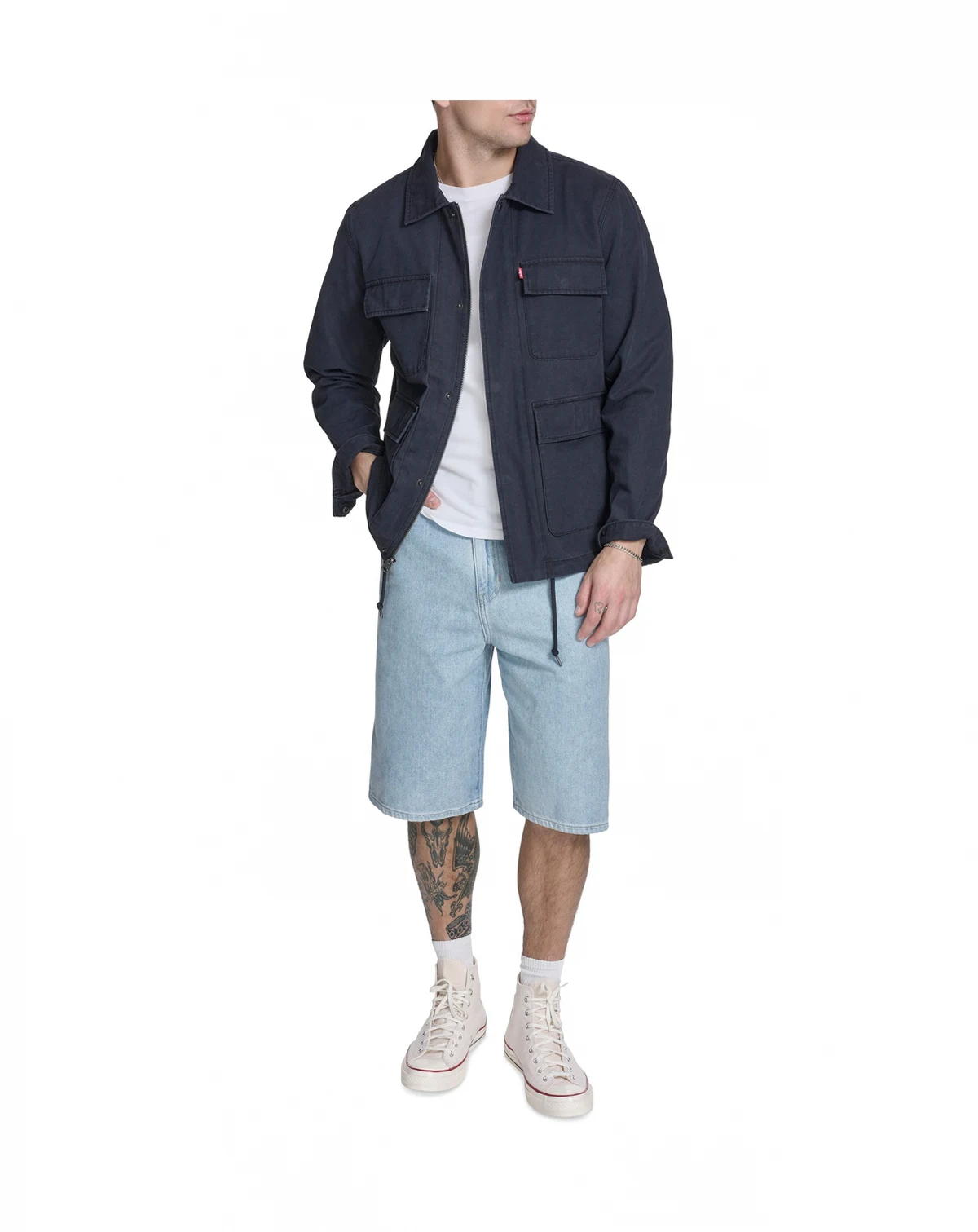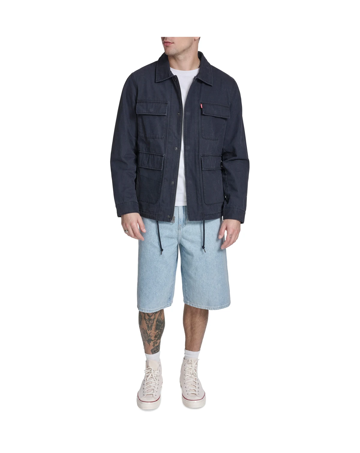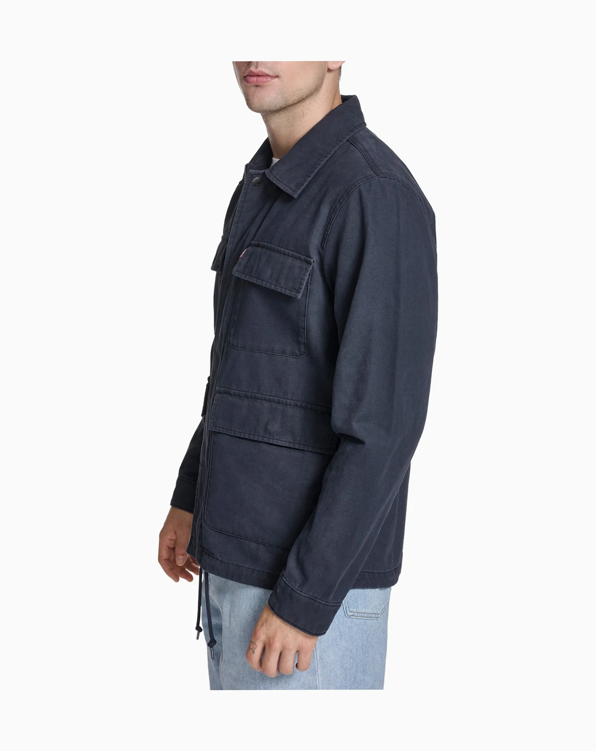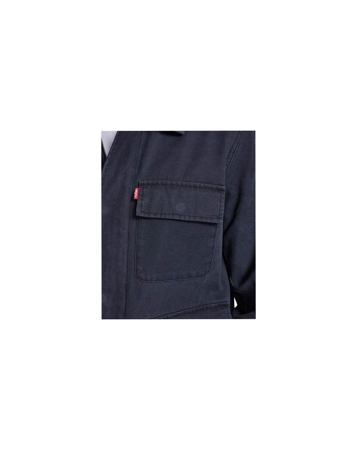 Levi's cotton canvas field jacket with zipper front and snap closure with placket, laydown collar, two lower oversized pockets with flap closure, two upper chest pockets with flap closure, red Levi's tab on upper chest pocket