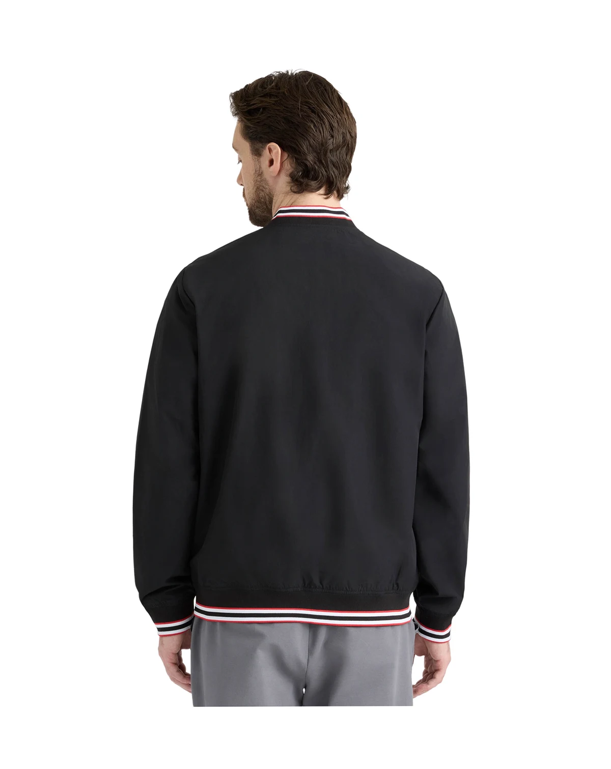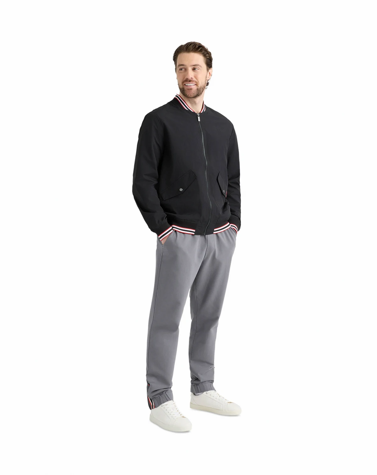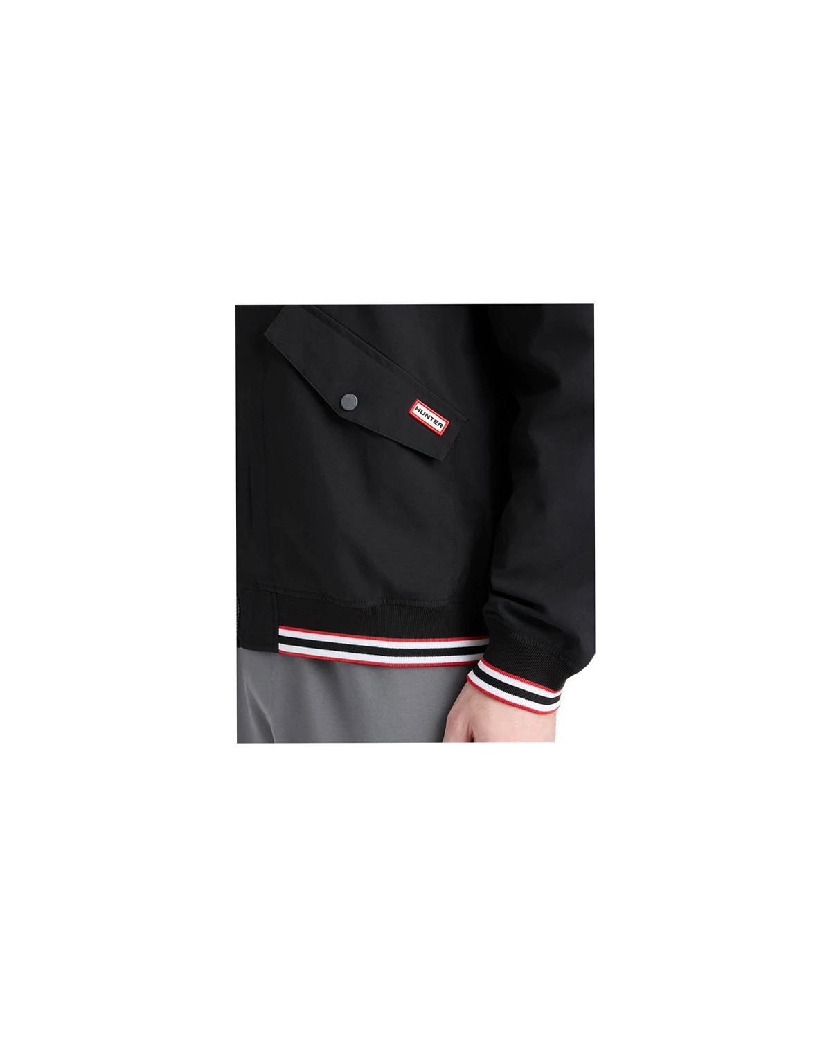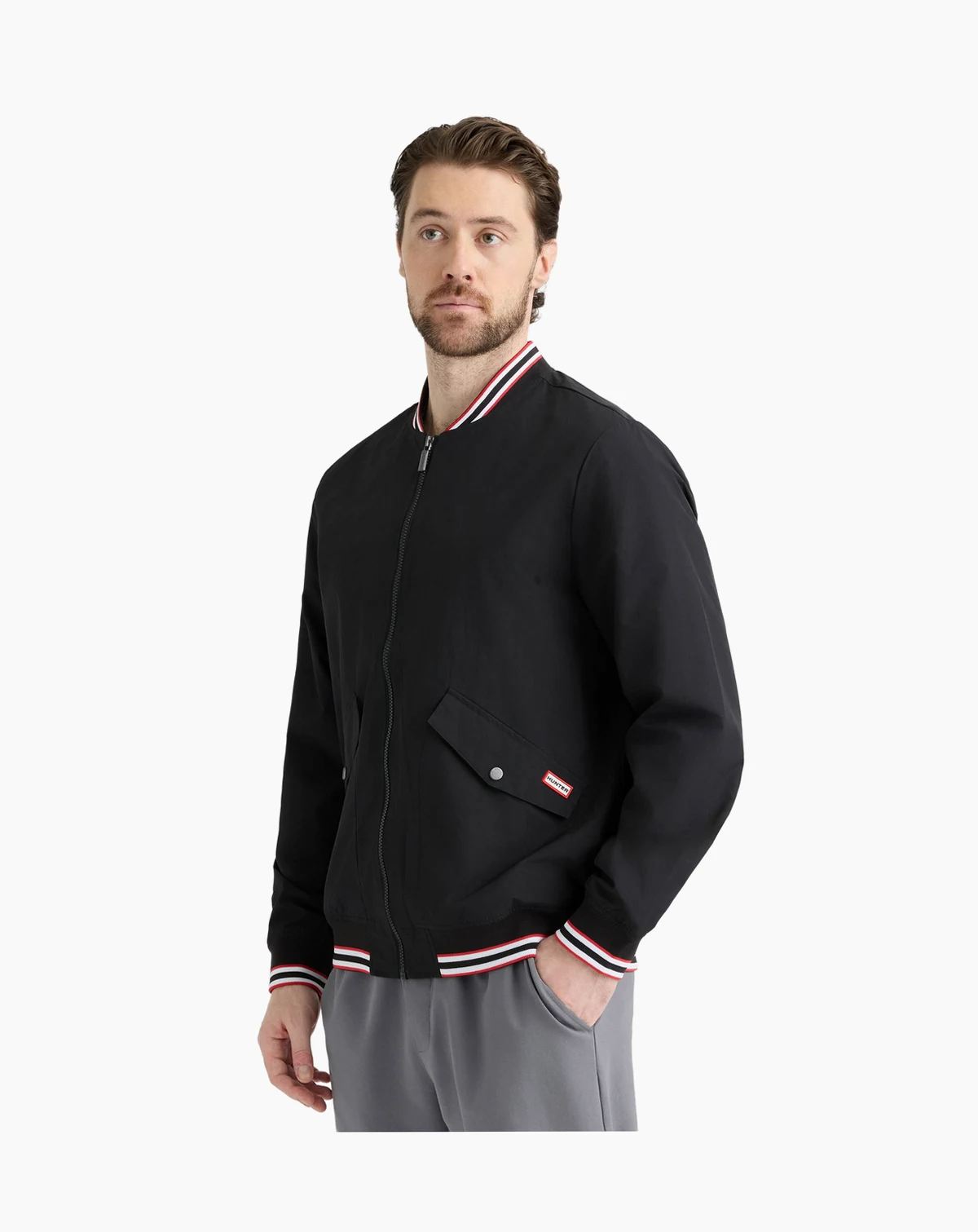 Elevating classic bomber style with sporty tricolor striped rib detailing, this jacket from Hunter features a water-repellent construction and side flap pockets with snap button closure. Finished with a smooth taffeta lining and a subtle logo patch, this full-front-zipper style delivers lightweight comfort with modern flair.