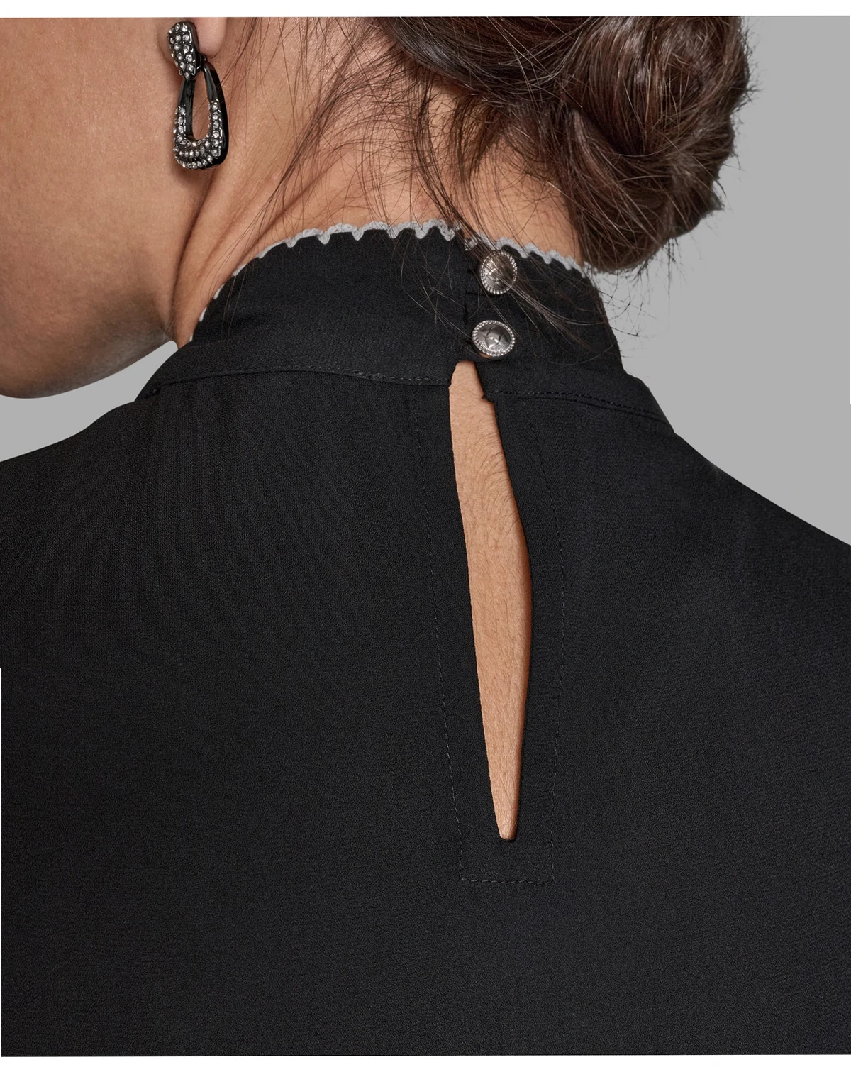 Exuding sophisticated charm, this BCBG blouse features an elegant tie neck and long sleeves. The center back keyhole with button closure adds a unique and stylish detail.