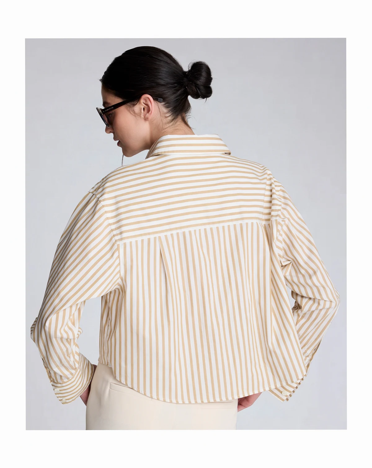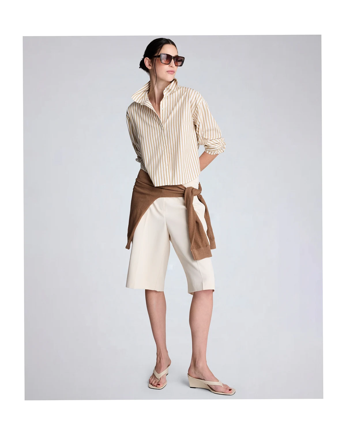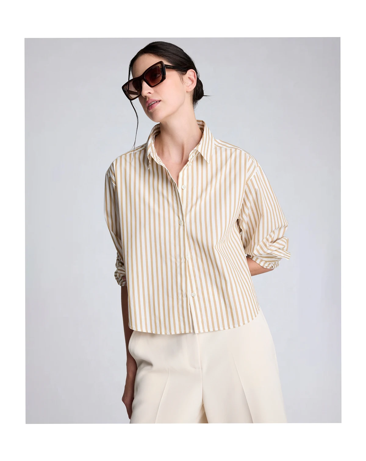 Featuring striped poplin construction, this Kenneth Cole cropped shirt combines a collared neckline with long sleeves. The button-front design offers a timelessly tailored look with a modern shortened length.