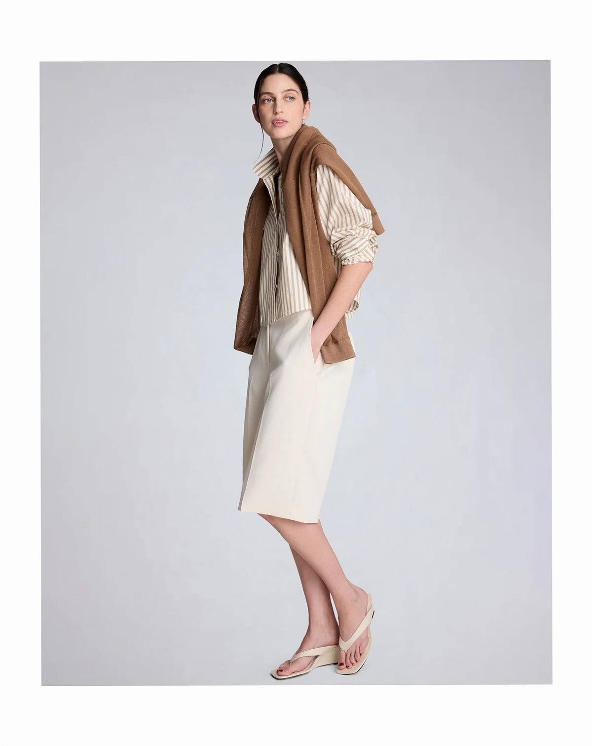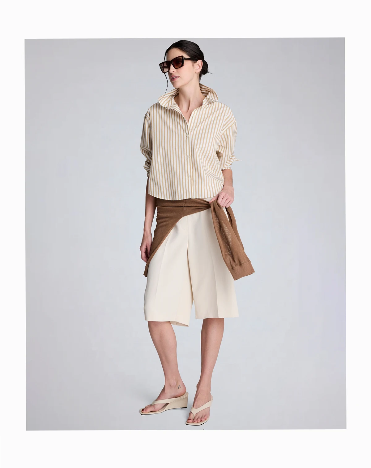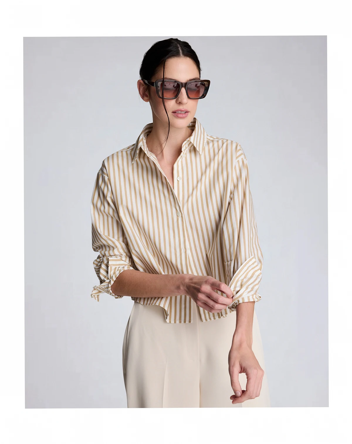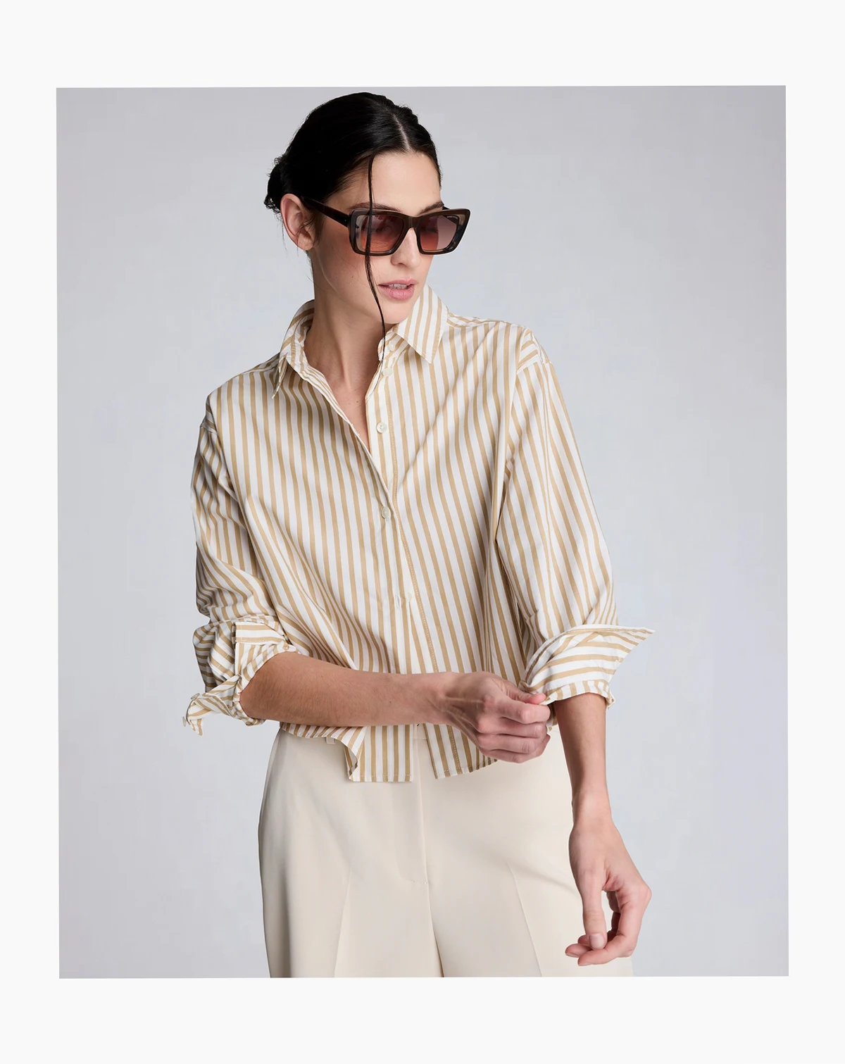 Featuring striped poplin construction, this Kenneth Cole cropped shirt combines a collared neckline with long sleeves. The button-front design offers a timelessly tailored look with a modern shortened length.