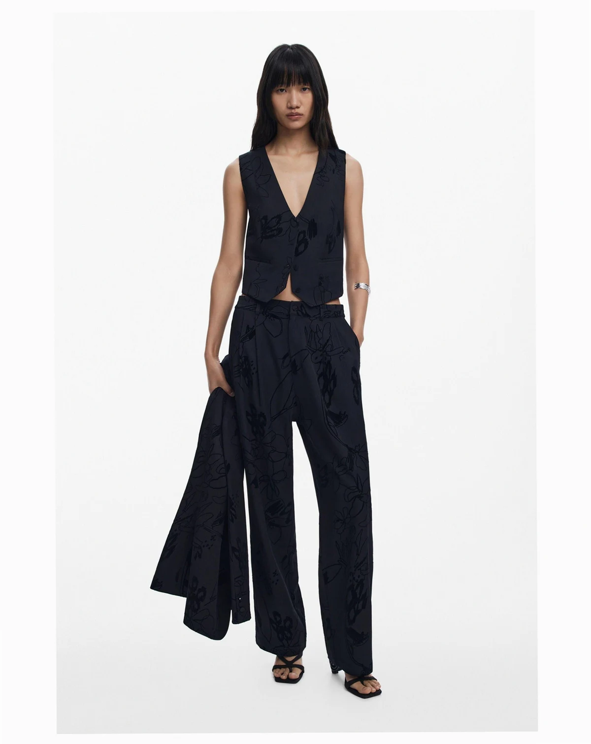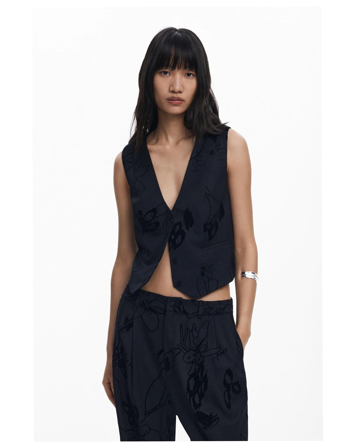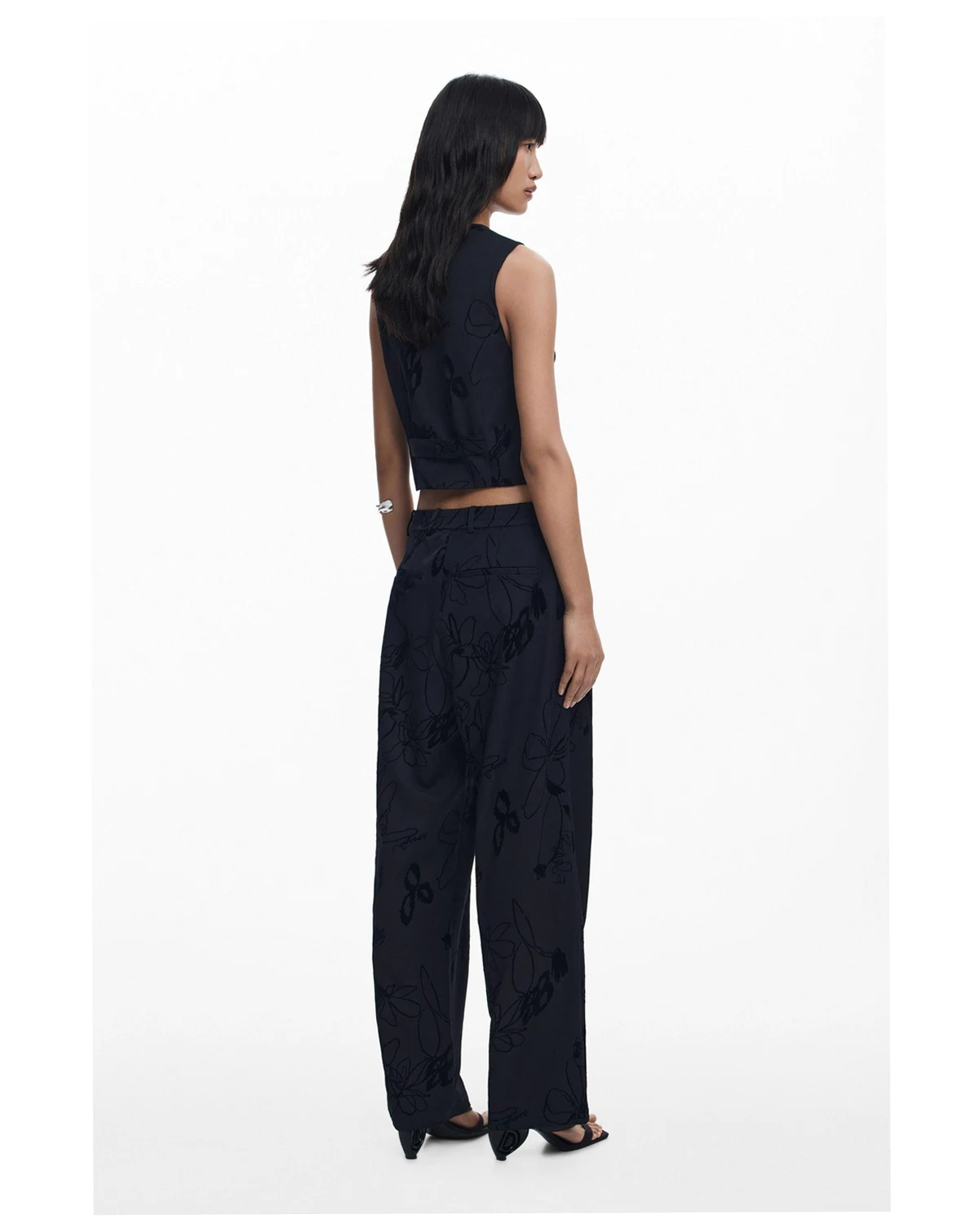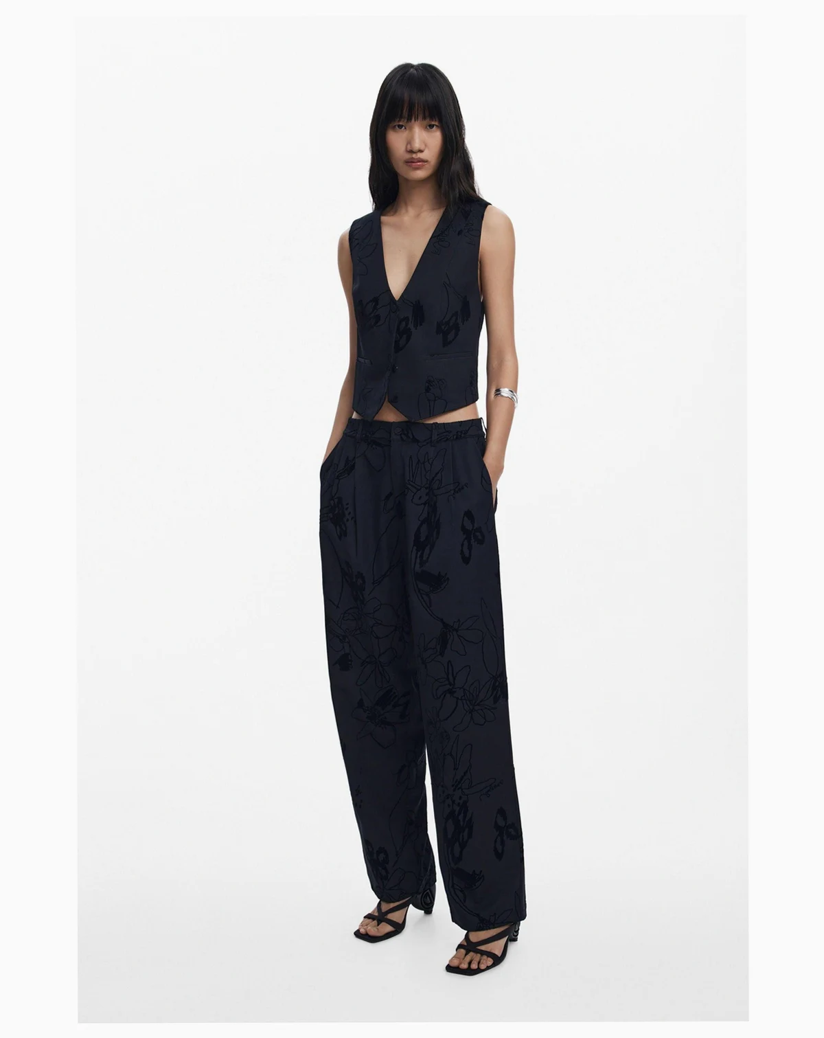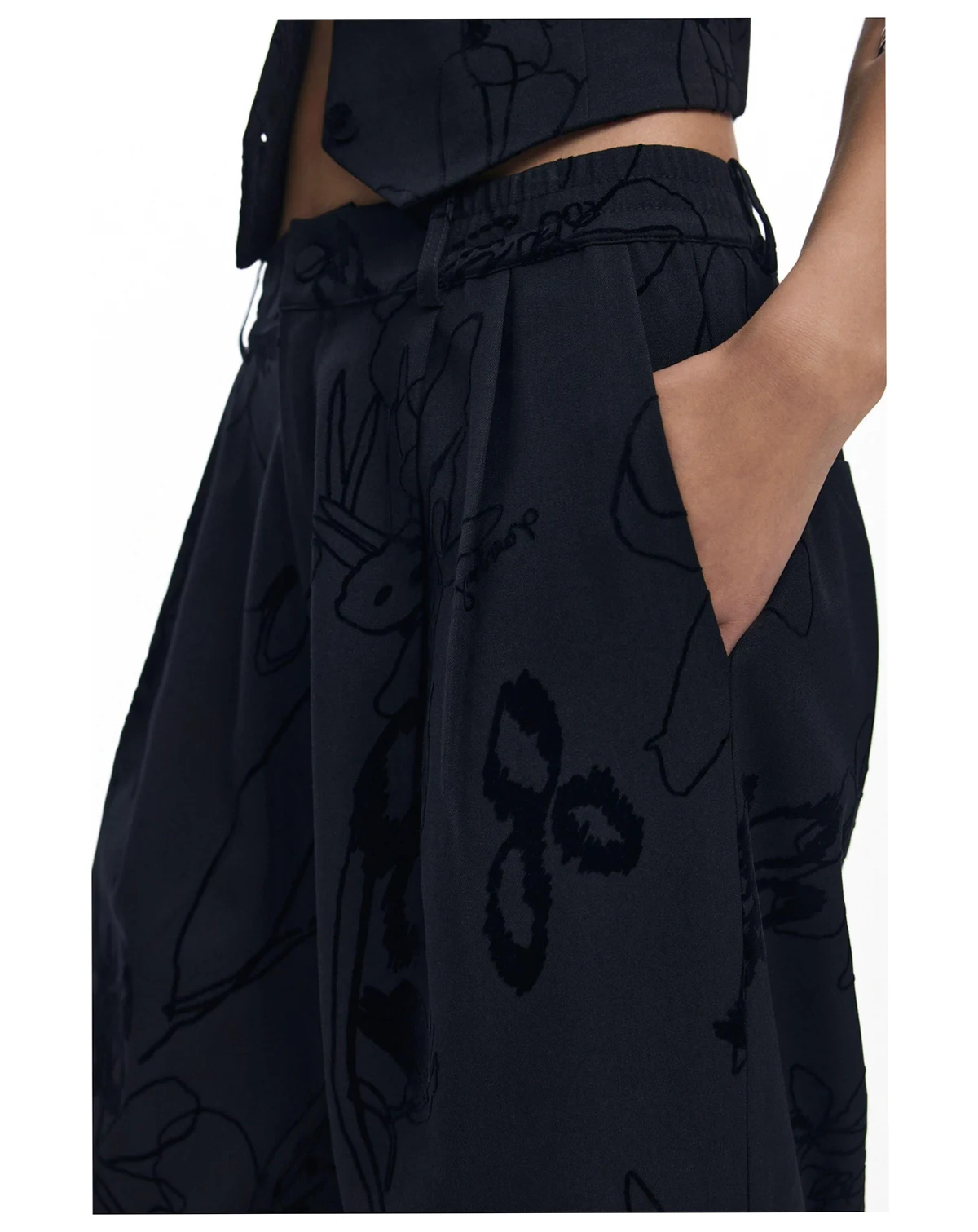 Long trousers, regular fit, with pleats and side pockets in solid color with velvet flocking with floral motifs.