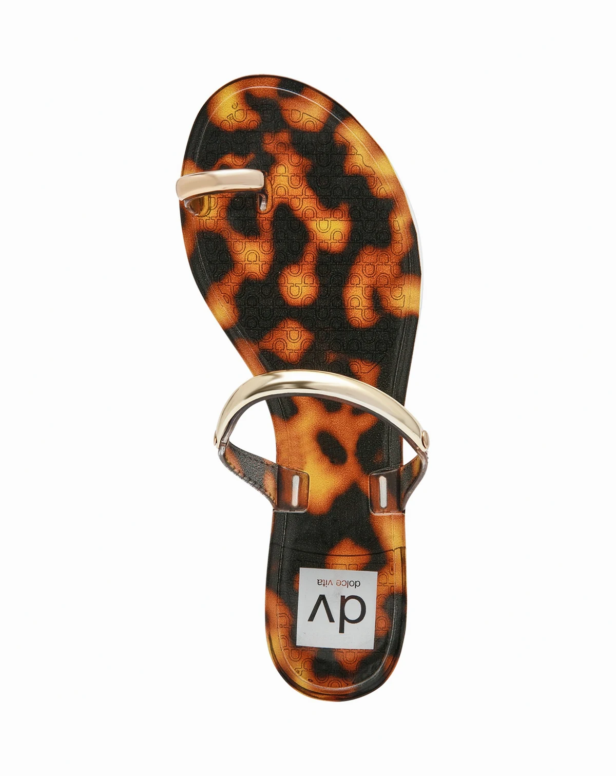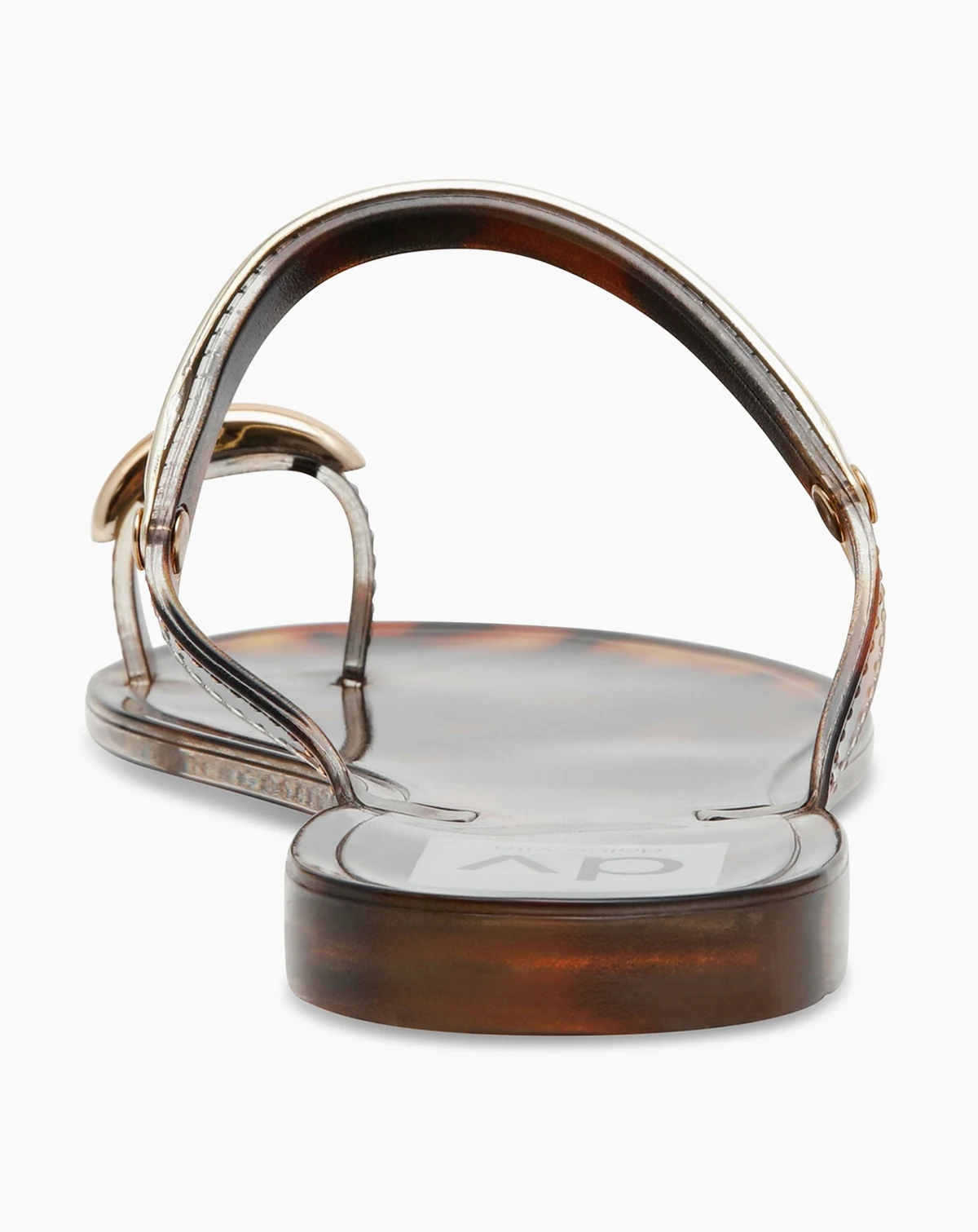 Keep your look sleek and effortless with these DV Dolce Vita flat sandals, designed with modern round toes and a minimalist profile. A slim toe loop, single instep strap, and polished metallic accents create easy slip-on appeal.