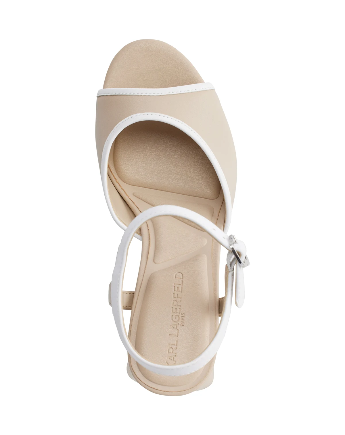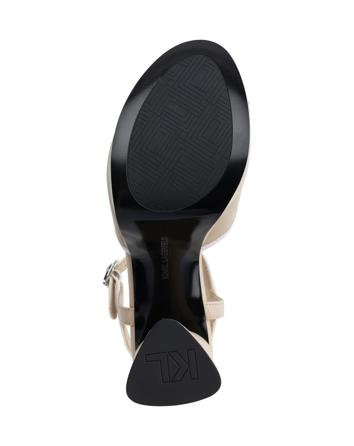A cushioned footbed provides invisible comfort underfoot in the Hallet Platform Ankle Strap Sandal by Karl Lagerfeld Paris, a retro-inspired sandal elevated by a high platform and heel.