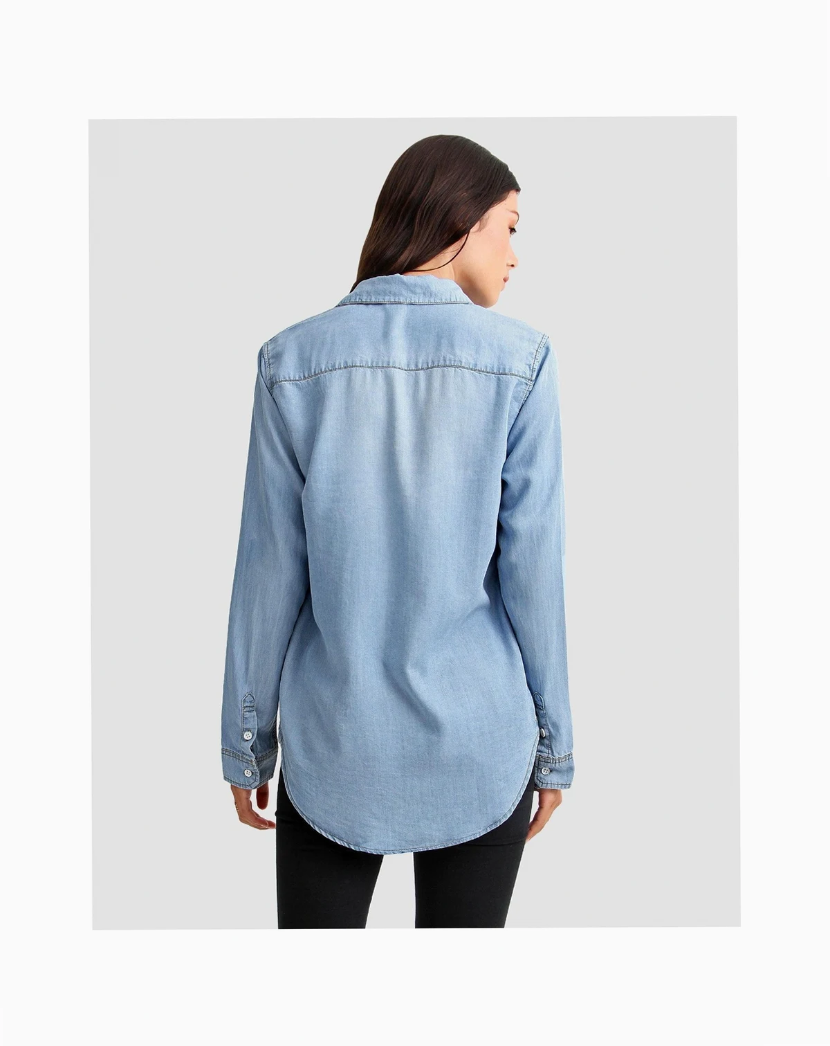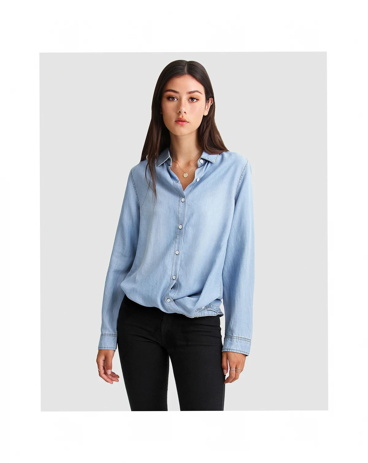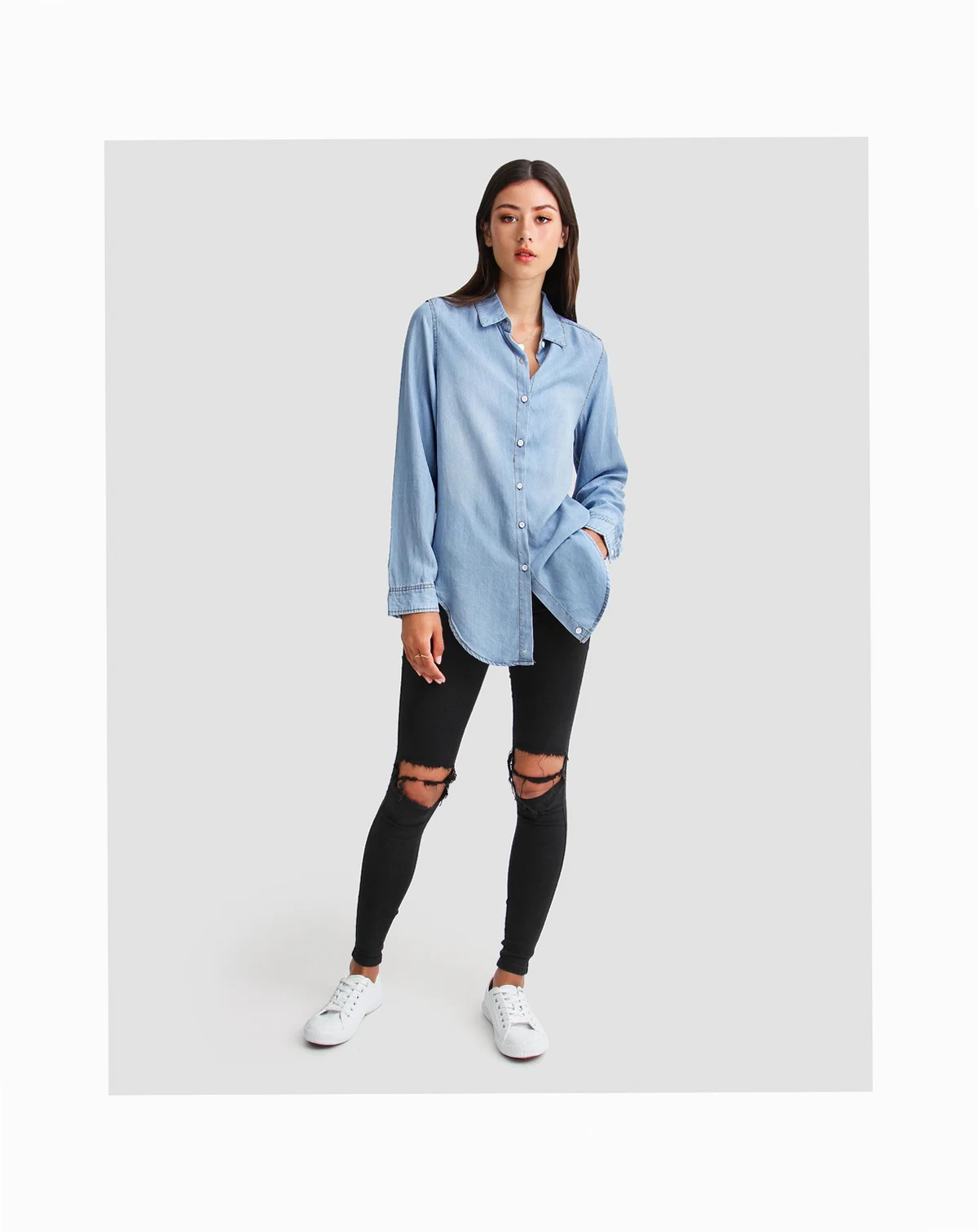 Made in lightweight denim, the Keep Me Wild Denim Top is an easy upgrade to a classic wardrobe staple. Button the bottom of the placket to the sides to create an effortless wrap look for a shorter top.