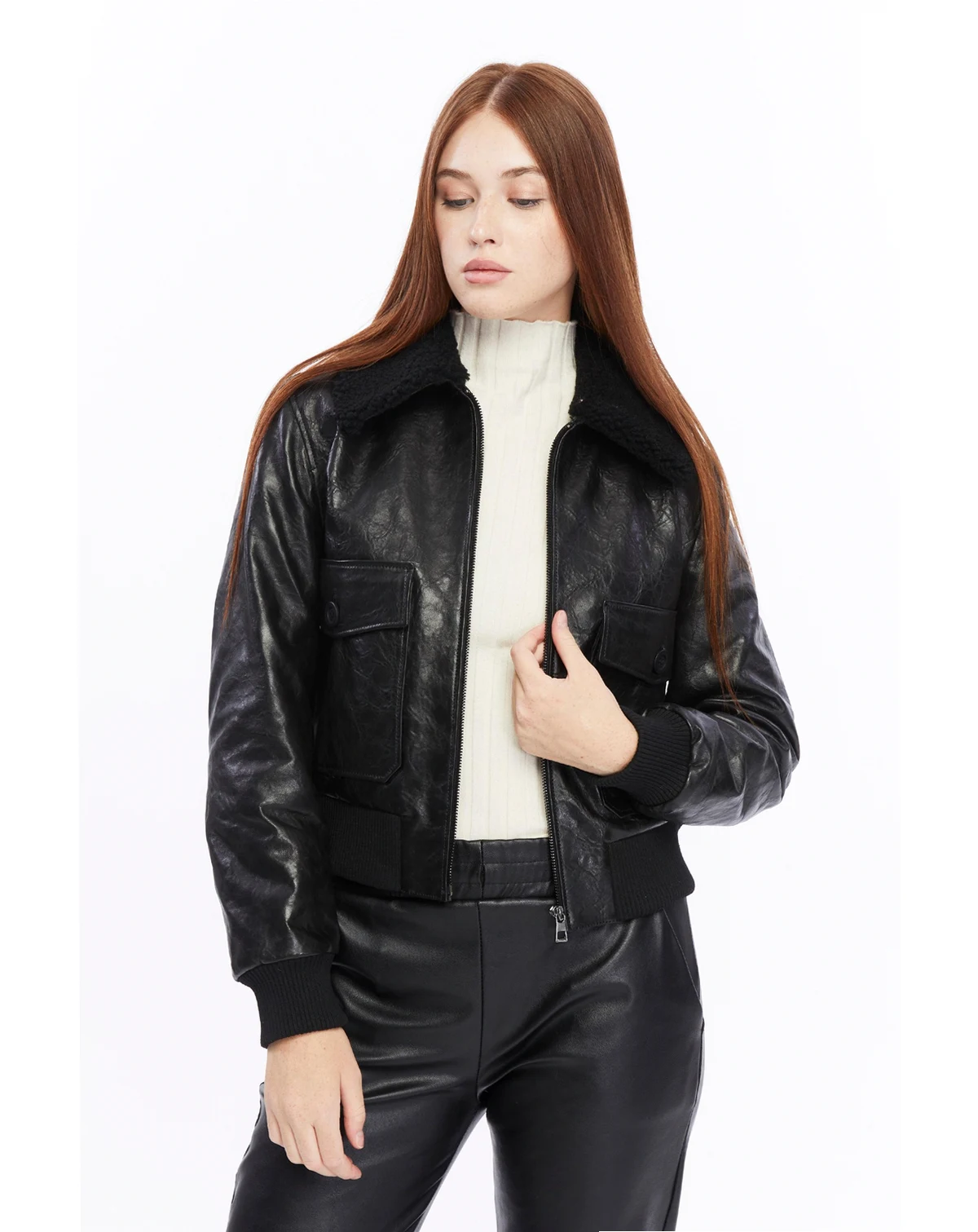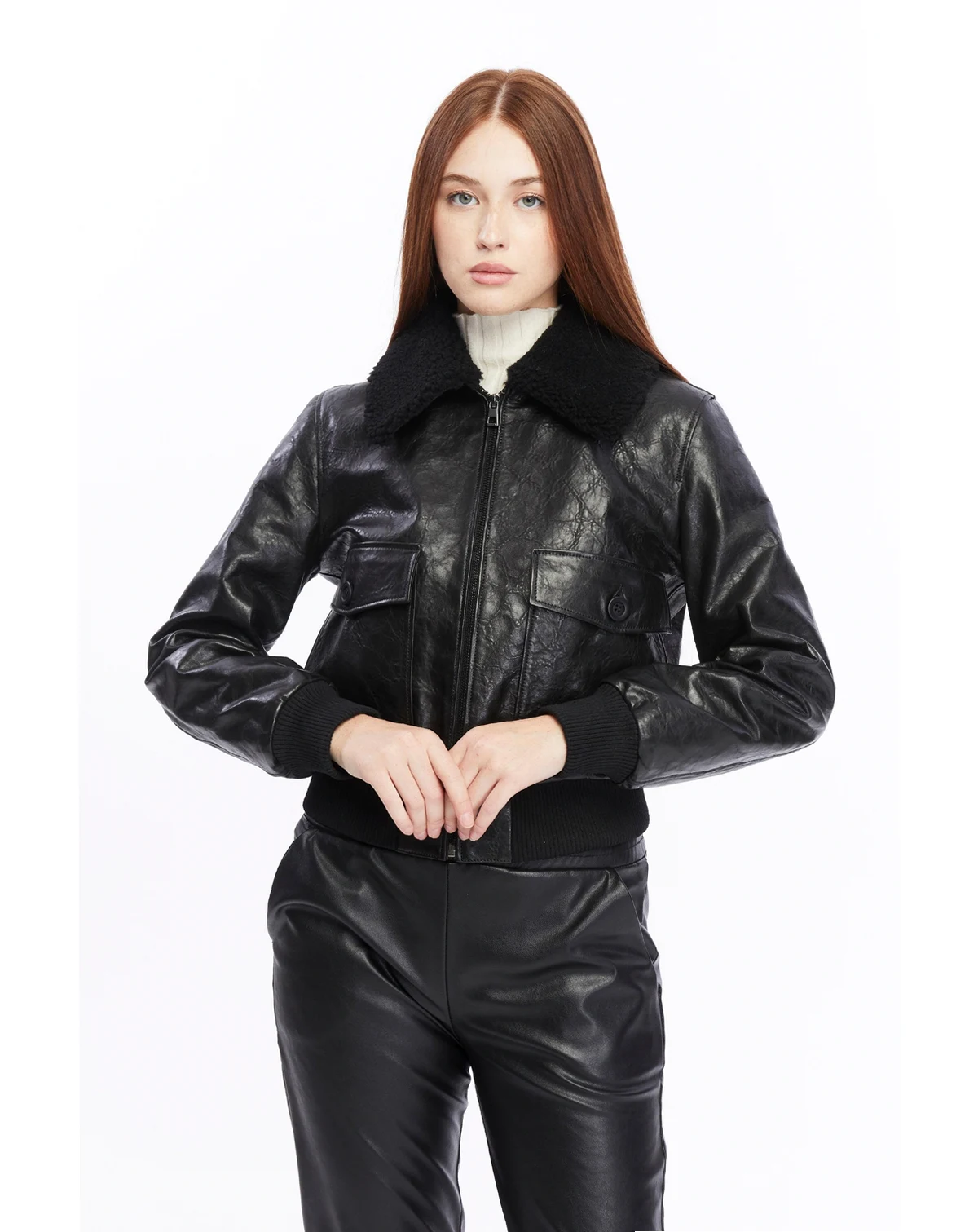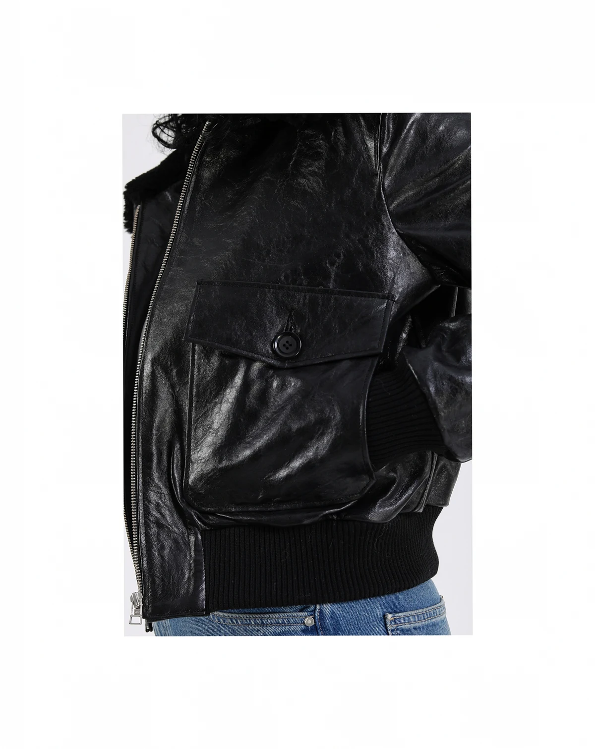 • Zip-up front closure for a snug and stylish fit • Oversized front pockets with button details for added functionality • Plush shearling collar for enhanced warmth and an elevated look