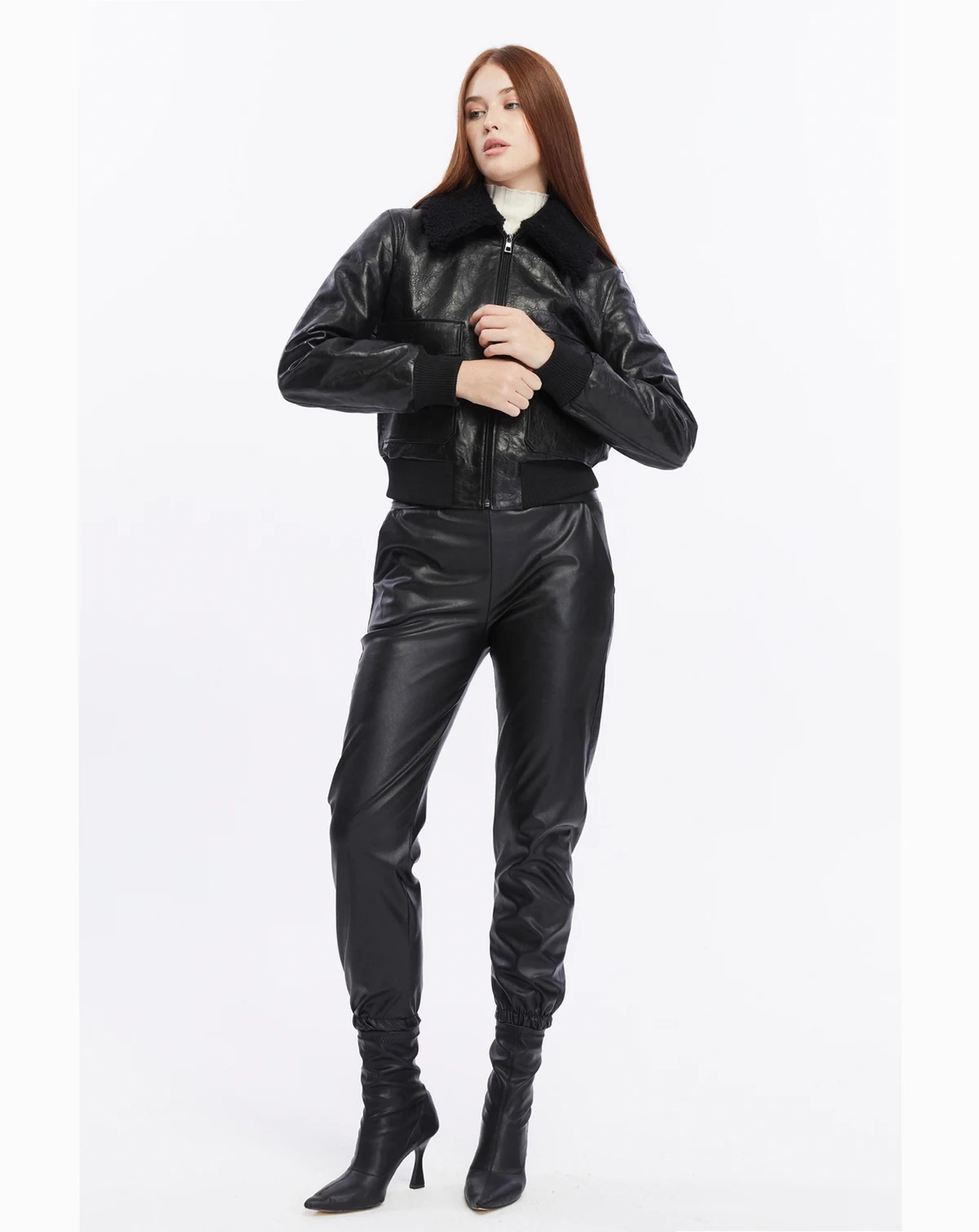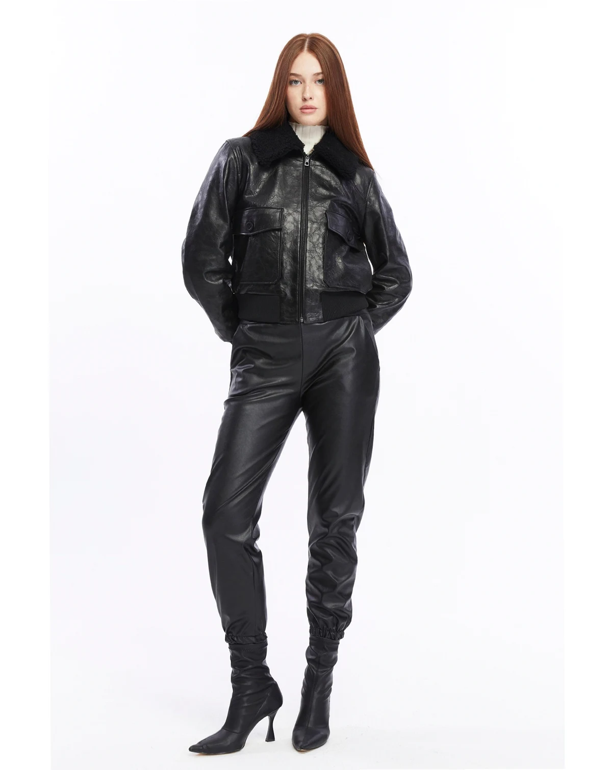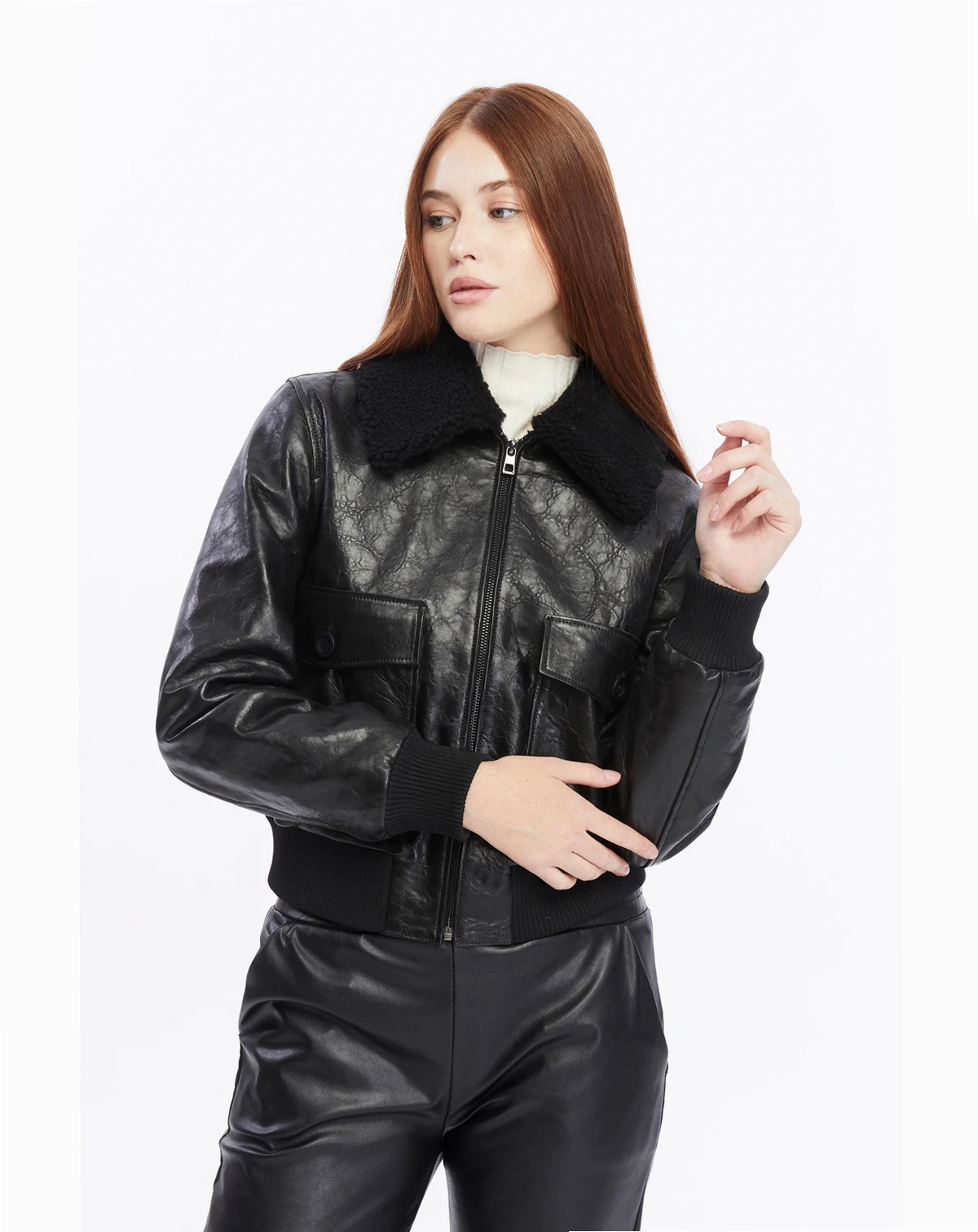 • Zip-up front closure for a snug and stylish fit • Oversized front pockets with button details for added functionality • Plush shearling collar for enhanced warmth and an elevated look