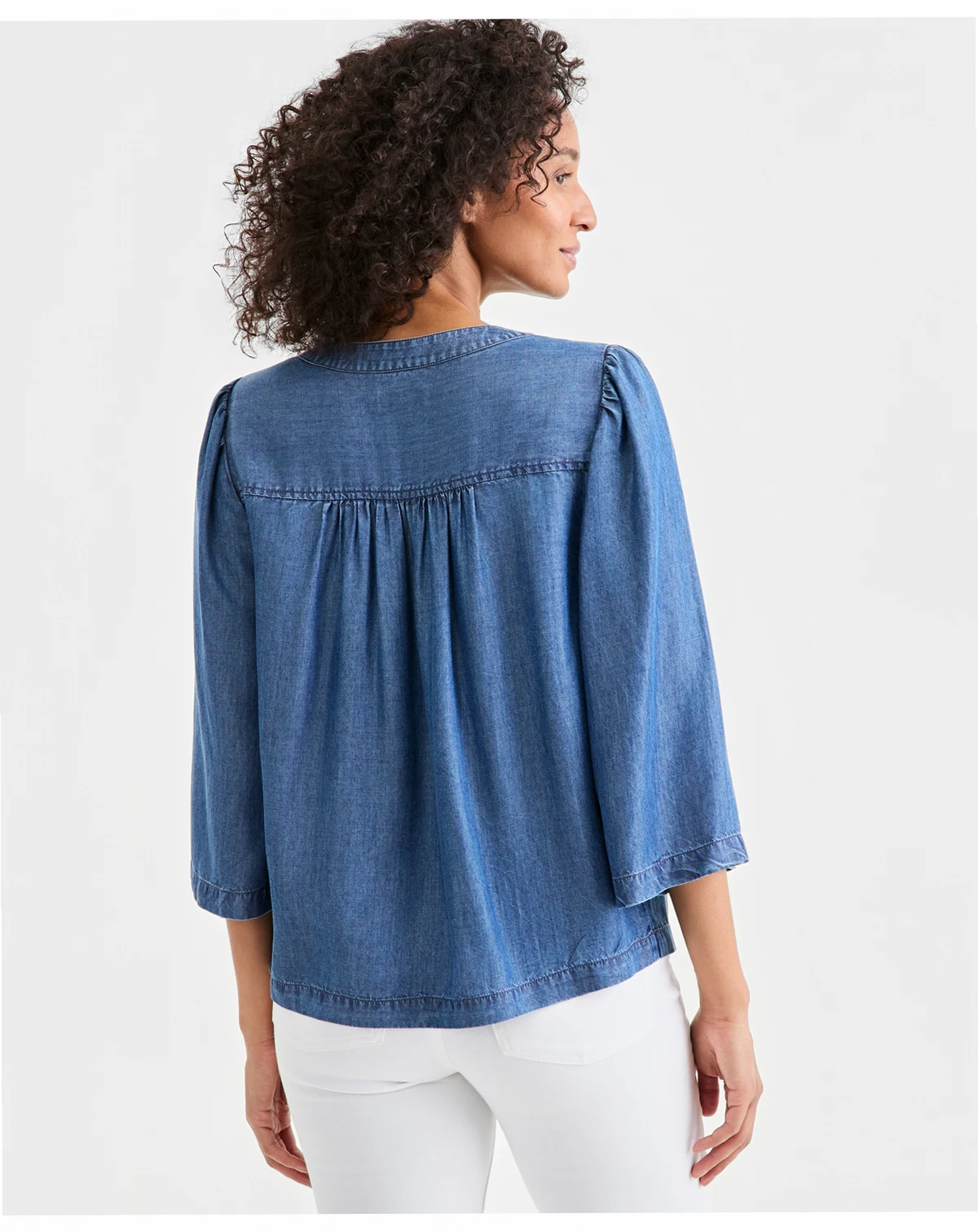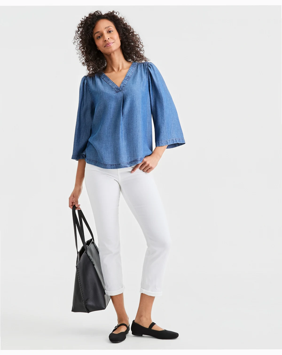 Soft structure meets timeless design in this elevated woven top from Style & Co. Designed with a V-neckline and bell sleeves, it delivers a relaxed fit, while the hip-length silhouette offers a polished look.