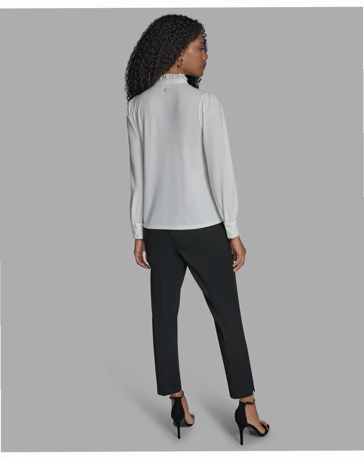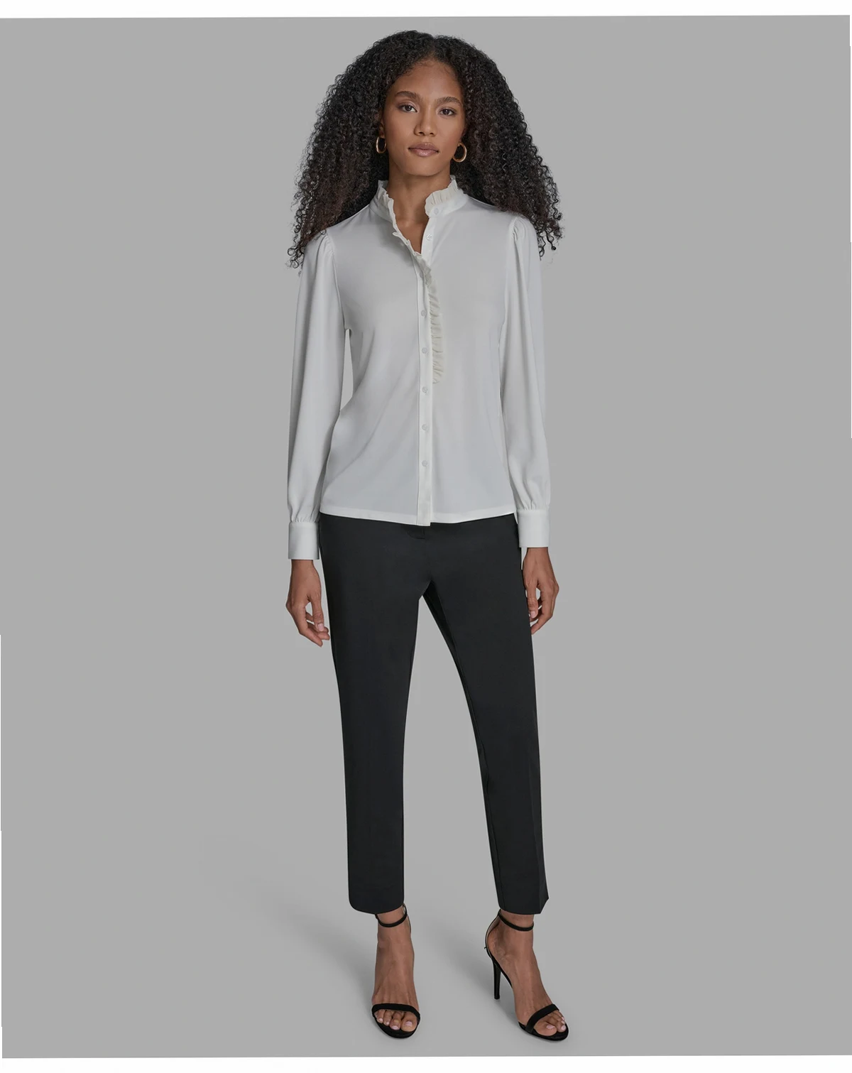 Delicate ruffles meet confident structure in this BCBG long-sleeve blouse, featuring a graceful mock neck and tailored button-down front. Falling at the hips, it’s a statement piece with subtle volume.