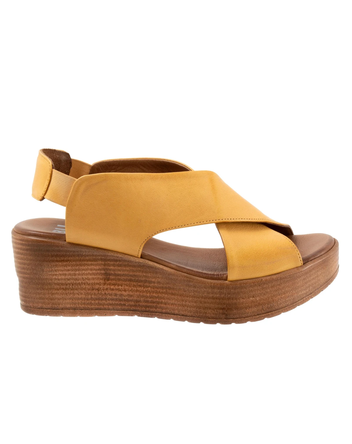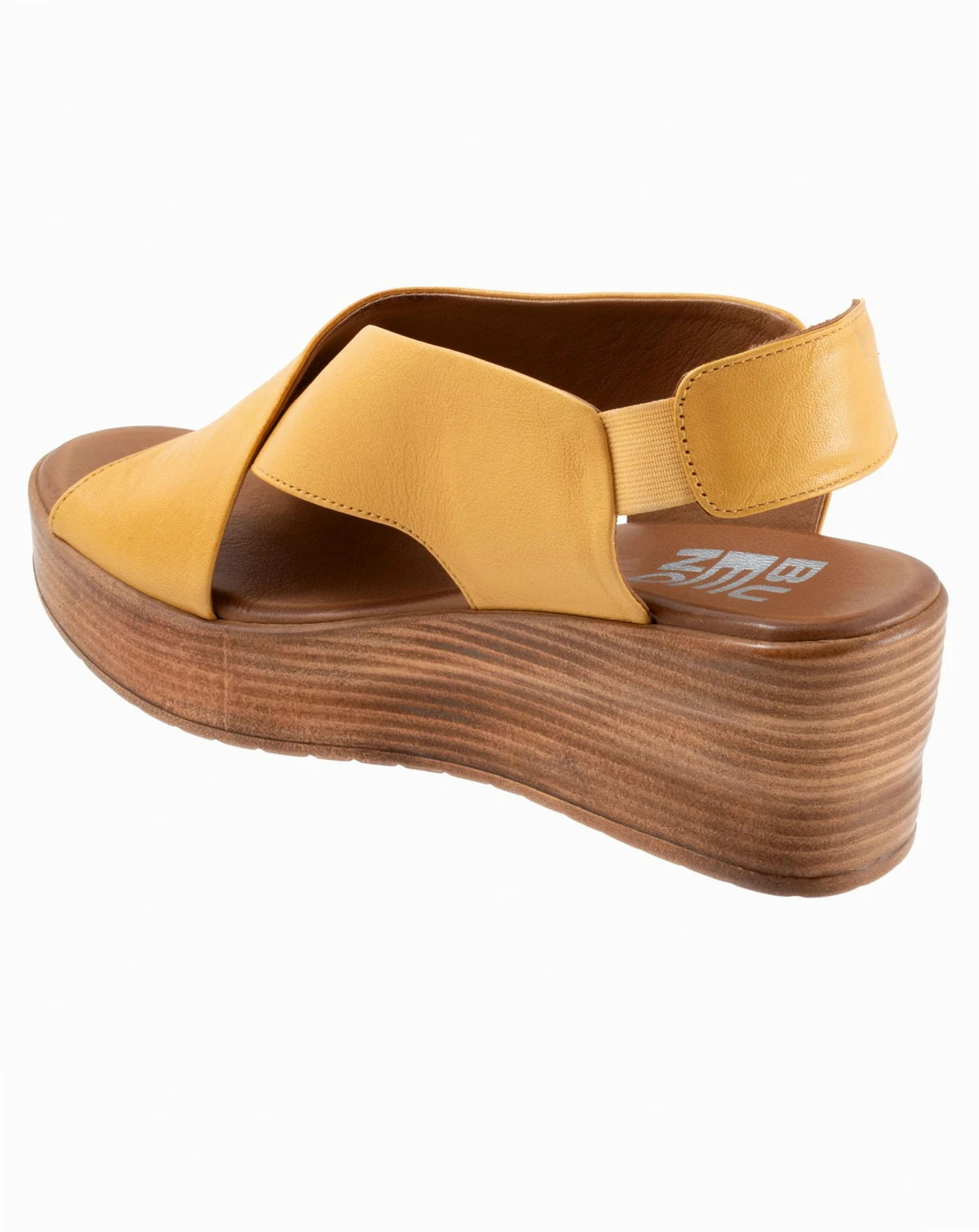 The Naomi platform sandal has two large bands of leather that criss cross each other and connect with each other via a smaller backstrap with elastic goring.