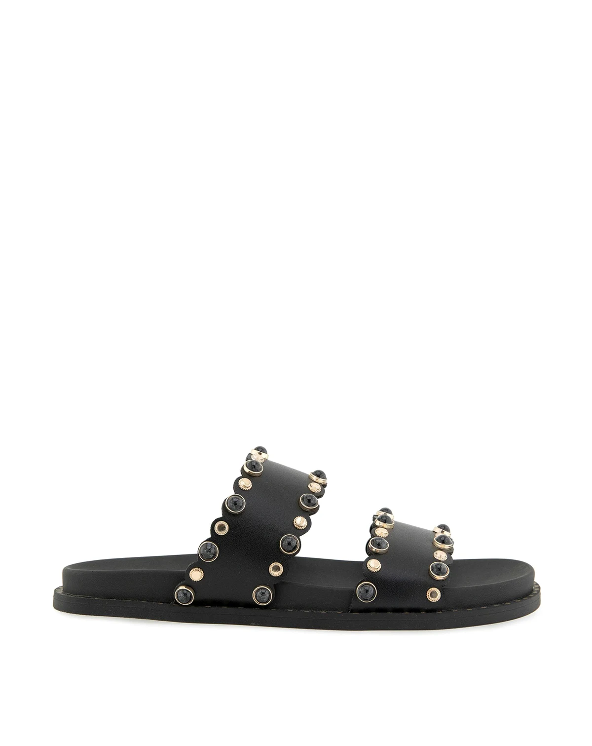 The BCBG Taana is a modern footbed sandal featuring two sleek straps adorned with stone detailing, bringing a refined hint of sparkle to an effortlessly comfortable, everyday silhouettte.